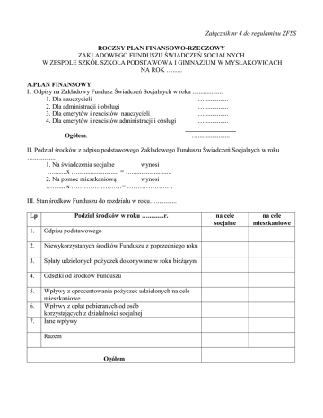 Załącznik nr 4 do regulaminu ZFŚS ROCZNY PLAN FINANSOWO-RZECZOWY ZAKŁADOWEGO FUNDUSZU ŚWIADCZEŃ SOCJALNYCH W ZESPOLE SZKÓŁ SZKOŁA PODSTAWOWA I GIMNAZJUM W MYSŁAKOWICACH NA ROK …...... A.PLAN FINANSOWY I. Odpisy na Zakładowy Fundusz Świadczeń Socjalnych w roku ................... 1. Dla nauczycieli …............... 2. Dla administracji i obsługi …............... 3. Dla emerytów i rencistów nauczycieli …............... 4. Dla emerytów i rencistów administracji i obsługi …............... ________________ Ogółem: ….................... II. Podział środków z odpisu podstawowego Zakładowego Funduszu Świadczeń Socjalnych w roku ….............. 1. Na świadczenia socjalne wynosi …........x ….......................... = …......................... 2. Na pomoc mieszkaniową wynosi …….... x ……………………= ……………….… III. Stan środków Funduszu do rozdziału w roku…............. Podział środków w roku …..........r. Lp 1. Odpisu podstawowego 2. Niewykorzystanych środków Funduszu z poprzedniego roku 3. Spłaty udzielonych pożyczek dokonywane w roku bieżącym 4. Odsetki od środków Funduszu 5. Wpływy z oprocentowania pożyczek udzielonych na cele mieszkaniowe Wpływy z opłat pobieranych od osób korzystających z działalności socjalnej Inne wpływy 6. 7. Razem Ogółem na cele socjalne na cele mieszkaniowe B. PLAN FINANSOWO -RZECZOWY I. Lp. Na cele mieszkaniowe Rodzaj świadczenia: 1. Dofinansowanie budowy domu lub mieszkania w domu wielorodzinnym Dofinansowanie zakupu domu jednorodzinnego Dofinansowanie zakupu mieszkania w domu wielorodzinnym Dofinansowanie nadbudowy lub rozbudowy budynku mieszkalnego Dofinansowanie remontu domu 2. 3. 4. 5. 6. Kwota Ogółem świadczenia Ilość świadczeń Kwota świadczenia Dofinansowanie remontu lub modernizacji mieszkania Dofinansowanie przebudowy lub modernizacji pomieszczeń mieszkalnych Ogółem 7. II. Na cele socjalne . Lp. Rodzaj świadczenia: 1. Świadczenia urlopowe 2. Wypoczynek organizowany we własnym zakresie, w tym: - wczasy pracownicze; - kolonie; - obozy 3. Ilość świadczeń Działalność kulturalno – oświatowa: - zakup biletów na imprezy kulturalne, - inne Ogółem 4. Wypoczynek w dni wolne od pracy: - wycieczki turystyczno - krajoznawcze 5. Pomoc rzeczowa : - zapomogi finansowe, - zapomogi losowe, - zapomogi rzeczowe 6. Imprezy okolicznościowe: - imprezy integracyjne, - imprezy sportowo -rekreacyjne, - Mikołajki 7. Rezerwa Ogółem Roczny plan finansowo-rzeczowy Zakładowego Funduszu Świadczeń Socjalnych został uzgodniony i zatwierdzony w dniu …................. Prezes Ogniska ZNP …………………………… (podpis) Dyrektor ………………………….. ( podpis)