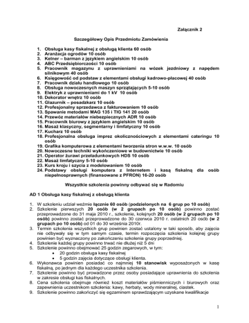 Załącznik 2 Szczegółowy Opis Przedmiotu Zamówienia Obsługa kasy fiskalnej z obsługą klienta 60 osób Aranżacja ogrodów 10 osób Kelner – barman z językiem angielskim 10 osób ABC Przedsiębiorczości 10 osób Pracownik magazynu z uprawnieniami na wózek jezdniowy z napędem silnikowym 40 osób 6. Księgowość od podstaw z elementami obsługi kadrowo-płacowej 40 osób 7. Pracownik działu handlowego 10 osób 8. Obsługa nowoczesnych maszyn sprzątających 5-10 osób 9. Elektryk z uprawnieniami do 1 kV 10 osób 10. Dekorator wnętrz 10 osób 11. Glazurnik – posadzkarz 10 osób 12. Profesjonalny sprzedawca z fakturowaniem 10 osób 13. Spawanie metodami MAG 135 i TIG 141 20 osób 14. Przewóz materiałów niebezpiecznych ADR 10 osób 15. Pracownik biurowy z językiem angielskim 10 osób 16. Masaż klasyczny, segmentarny i limfatyczny 10 osób 17. Kucharz 10 osób 18. Profesjonalna obsługa imprez okolicznościowych z elementami cateringu 10 osób 19. Grafika komputerowa z elementami tworzenia stron w.w.w. 10 osób 20. Nowoczesne techniki wykończeniowe w budownictwie 10 osób 21. Operator żurawi przeładunkowych HDS 10 osób 22. Masaż limfatyczny 5-10 osób 23. Kurs kroju i szycia z modelowaniem 10 osób 24. Podstawy obsługi komputera z Internetem i kasą fiskalną dla osób niepełnosprawnych (finansowane z PFRON) 16-20 osób 1. 2. 3. 4. 5. Wszystkie szkolenia powinny odbywać się w Radomiu AD 1 Obsługa kasy fiskalnej z obsługą klienta 1. W szkoleniu udział weźmie łącznie 60 osób (podzielonych na 6 grup po 10 osób) 2. Szkolenie pierwszych 20 osób (w 2 grupach po 10 osób) powinno zostać przeprowadzone do 31 maja 2010 r., szkolenie, kolejnych 20 osób (w 2 grupach po 10 osób) powinno zostać przeprowadzone do 30 czerwca 2010 r. ostatnich 20 osób (w 2 grupach po 10 osób) od 01 do 30 września 2010r. 3. Termin szkolenia wszystkich grup powinien zostać ustalony w taki sposób, aby zajęcia nie odbywały się w tym samym czasie, termin rozpoczęcia szkolenia kolejnej grupy powinien być wyznaczony po zakończeniu szkolenia grupy poprzedniej. 4. Szkolenie każdej grupy powinno trwać nie dłużej niż 5 dni 5. Szkolenie powinno obejmować 25 godzin zegarowych, w tym: 20 godzin obsługa kasy fiskalnej 5 godzin zajęcia dotyczące obsługi klienta. 6. Wykonawca powinien posiadać co najmniej 10 stanowisk wyposażonych w kasę fiskalną, po jednym dla każdego uczestnika szkolenia. 7. Szkolenie powinno być prowadzone przez osoby posiadające uprawnienia do szkolenia w zakresie obsługi kas fiskalnych. 8. Cena szkolenia obejmuje również koszt materiałów piśmienniczych i biurowych oraz zapewnienia uczestnikom szkolenia: kawy, herbaty, wody mineralnej, ciastek. 9. Szkolenie powinno zakończyć się egzaminem sprawdzającym uzyskane kwalifikacje 1 10. Uczestnicy po zakończeniu powinni otrzymać zaświadczenie potwierdzające uzyskane kwalifikacje. AD 2 Aranżacja ogrodów 1. W szkoleniu weźmie udział 10 osób 2. Celem szkolenia jest przygotowanie do wykonywania zawodu projektanta ogrodów 3. Szkolenie powinno obejmować łącznie 90 godzin, w tym zajęcia teoretyczne i praktyczne 4. Zajęcia powinny odbywać się codziennie, liczba godzin szkoleniowych w tygodniu powinna wynosić przeciętnie nie mniej niż 30 godzin zegarowych. 5. Szkolenie powinno rozpocząć się w maju 2010r. i trwać nie dłużej niż 3 tygodnie. 6. Tematyka szkolenia powinna zawierać następujące bloki tematyczne: Rodzaje terenów zielonych i ich funkcja Historia sztuki ogrodowej Zasady kompozycji, rodzaje współczesnych ogrodów Zasady tworzenia projektu Inwentaryzacja terenu, czytanie map i podkładów Mała architektura, rodzaje Zasady doboru roślin i charakterystyka grup roślin Zasady projektowania i zakładania trawników Zasady pielęgnacji roślin 7. Szkolenie powinno zakończyć się egzaminem (wykonaniem własnego projektu) 8. Uczestnicy po zakończonym szkoleniu otrzymują zaświadczenie o ukończeniu szkolenia potwierdzające uzyskane kwalifikacje 9. Szkolenie powinno być przeprowadzone przez osobę posiadającą kwalifikacje do projektowania ogrodów (architekt krajobrazu, osoba prowadząca pracownię projektującą ogrody) AD 3 Kelner - barman z językiem angielskim 1. W szkoleniu udział weźmie 10 osób 2. Celem szkolenia jest zdobycie wiedzy i umiejętności związanych z pracą kelnerabarmana 3. Szkolenie powinno obejmować łącznie 150 godzin, w tym 100 godzin w zakresie kelner - barman, 50 godzin język angielski – słownictwo dotyczące w/w branży gastronomicznej 4. Szkolenie w zakresie kelner - barman powinno obejmować 30 godzin teorii i 70 godzin praktyki. 5. Program szkolenia powinien obejmować między innymi następujące zagadnienia: Komunikacja interpersonalna Rodzaje potraw i napojów Zasady podawania potraw i napojów Zasady przygotowania sali oraz organizacji i techniki obsługi Techniki sporządzania potraw, napojów i drinków Zasady obsługi przyjęć okolicznościowych Zasady podawania napojów przy barze Zasady prowadzenia rozliczeń barowych i kelnerskich 6. Szkolenie powinno być prowadzone przez osoby posiadające kwalifikacje i udokumentowane doświadczenie zawodowe jako kelner – barman 7. Szkolenie w części dotyczącej nauki języka angielskiego powinno być prowadzone przez nauczyciela języka angielskiego posiadającego doświadczenie w nauce języka angielskiego osób dorosłych (mgr filologii angielskiej) 8. Szkolenie powinno rozpocząć się w maju 2010 roku i zakończyć do 30 czerwca 2010r. -i trwać nie dłużej niż 5 tygodni 2 9. Liczba godzin szkolenia powinna wynosić przeciętnie nie mniej niż 30 godzin zegarowych w tygodniu. 10. Koszty materiałów szkoleniowych w części dotyczącej pracy kucharza – barmana powinny wynosić co najmniej 600 zł dla każdego uczestnika 11. Cena szkolenia powinna zawierać koszt materiałów szkoleniowych i biurowych oraz kawy, herbaty, wody mineralnej, ciastek 12. Uczestnicy po zako