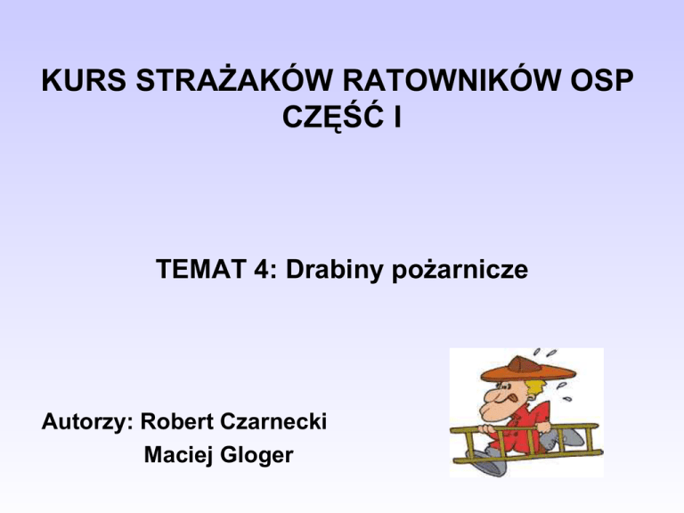 KURS STRAŻAKÓW RATOWNIKÓW OSP CZĘŚĆ I TEMAT 4: Drabiny pożarnicze Autorzy: Robert Czarnecki Maciej Gloger Obowiązująca od 2002 roku norma PN-EN 1147 „Drabiny przenośne dla straży pożarnej” wprowadza n/w podział drabin: Drabina dostępna – drabina zaprojektowana do uzyskania dojścia do wskazanego miejsca. Drabiny takie nie są zalecane do ratowania osób przez zniesienie w dół lub wniesienie do góry. Drabina hakowa – drabina wyposażona w hak lub haki służący (e) do zawieszania jej w czasie użycia. Drabina ratownicza – drabina zaprojektowana do ratowania przez zniesienie w dół lub wniesienie do góry. Podział drabin c.d. Drabina słupkowa – drabina z zamocowanymi zawiasowo szczeblami, pozwalającymi na złożenie bocznic ze sobą. Drabina nasadkowa – drabina składająca się z kilku przęseł, które można łączyć ze sobą za pośrednictwem specjalnych uchwytów, lecz długość jej można zmieniać tylko przez dołączenie całego przęsła. Drabina dachowa – drabina stosowana do wchodzenia po zewnętrznej stronie dachu, z hakiem do zaczepiania o krawędź dachu. Drabina jednoczęściowa – drabina składająca się tylko z jednego przęsła. Stosowane w kraju drabiny przenośne są wykonywane z: drewna, stopów aluminium. Z drewna produkowane są następujące typy drabin: słupkowe, nasadkowe, wysuwane, jednoczęściowe, dachowe. Ze stopów aluminium produkowane są następujące typy drabin: nasadkowe, wysuwane, jednoczęściowe, dachowe, hakowe. Wszystkie typy drabin klasyfikowane są według liczby osób, które mogą przebywać jednocześnie i dozwolonego sposobu użycia. Typ drabiny Maksymalna liczba osób Dozwolony sposób użycia 3 Ratowanie i dojście 2 Ratowanie i dojście 1 Dojście Hakowe 1 Dojście Jednoczęściowe 3 Ratowanie i dojście 2 Ratowanie i dojście 1 Dojście Dachowe 1 Dojście Nasadkowe 3 Ratowanie i dojście 2 Ratowanie i dojście 1 Dojście 1 Dojście Wysuwane Słupkowe Oznaczenie drabiny jedno, dwuosobowej i trzyosobowej Wśród drabin wysuwanych wyróżnia się drabiny z: nieobowiązkowymi drążkami podporowymi – o maksymalnej długość po wysunięciu do 11,0 m, obowiązkowymi drążkami podporowymi – o długość drabiny po wysunięciu ponad 11,0 m. Drążki podporowe mogą być wykonane z ciągłego, jednolitego materiału lub mogą mieć budowę teleskopową. Wszystkie zastosowane drążki podporowe muszą posiadać zabezpieczenie antypoślizgowe umieszczone na długości 2,0 m od podstawy. Bez względu czy drabiny posiadają drążki podporowe obowiązkowe czy nieobowiązkowe, zabronione jest stosowanie drabin jako wolnostojących podczas prowadzenia akcji ratowniczych. NORMA PN-EN 1147 OKREŚLA: dopuszczalne masy dla różnych typów drabin oraz siłę jakiej trzeba użyć do wysunięcia drabin wysuwanych: 25 kg dla wszystkich typów drabin sprawianych przez jedną osobę, 15 kg dla drabin hakowych, 8 kg/mb długości drabiny dla wszystkich innych typów drabin. maksymalne siły potrzebne do wysunięcia przęsła drabiny: drabiny wysuwane liną powinny się wysuwać pod wpływem działania obciążenia maksymalnie 50 kg, drabiny wysuwane ręcznie podczas wchodzenia po nich powinny się wysuwać pod wpływem działania obciążenia maksymalnie 25 kg . Podstawowe wymagania bhp podczas sprawiania drabin. Podczas sprawiania drabiny przestrzegać instrukcji obsługi. Drabina powinna być ustawiana przy ścianie pod kątem 70±50º do podłoża. Wierzchołek drabiny powinien wystawać ponad konstrukcję podpieranego elementu przynajmniej dwa szczeble. Po sprawieniu drabiny upewnić się, ze stopy drabiny stoją na stabilnym podłożu o takiej samej twardości. Zabrania się sprawiania drabin w pobliżu napowietrznych linii energetycznych. Wchodząc po drabinie powinno się przestrzegać zasady, zawsze chwytać za szczeble nie za bocznice oraz gdy lewa ręka sięga po kolejny szczebel to jednocześnie prawa stopa jest podnoszona na kolejny szczebel i tak na zmianę. Wchodząc po drabinie z linią gaśniczą wąż powinien być ułożony na szczeblach między nogami a prądownica powinna być przewieszona przez bark i zwisać na plecach. Nie wolno prądownicy wkładać za pas strażacki. Podczas akcji należy wchodzić na drabinę w uzbrojeniu osobistym ze zwolnionym zatrzaśnikiem zwróconym frontalnie do szczebli drabiny. Stopy drabiny powinny być zabezpieczone przed przesunięciem w czasie gdy na drabinie pracują osoby. Linia wężowa podczas prowadzenia działań na drabinie powinna być podczepiona przy pomocy podpinki wężowej do szczebli drabiny. Podpinkę powinna być zawsze pod łącznikiem a nie wokół samego węża. Dodatkowo za osobą, która operuje prądem wody powinna stać druga podtrzymując linię wężową. Prądownicę również należy zamocować podpinką linkową do szczebla tak aby możliwe było swobodne podawanie prądów wody. Po zakończeniu gaszenia linie gaśniczą należy odwodnić a następnie prądownicę przełożyć przez bark i zejść z drabiny. Można również opuścić prądownicę na dół wykonując przechwyty wzdłuż węża do momentu zetknięcia prądownicy z podłożem a następnie spuścić sam wąż. Podczas wysunięcia drabiny powyżej 70% przy silnych wiatrach należy stosować dwie linki zabezpieczające, mocując je do wierzchołka drabiny i odciągając na boki stabilizować położenie drabiny. Typy drabin najczęściej stosowanych w działaniach ratowniczych: Drabina słupkowa Drabina dostępna – jednoosobowa. Drabina składa się z jednego przęsła. Bocznice drabiny wykonano z drewna sosnowego. Szczeble wykonane z drewna bukowego w przekroju posiadają kształt prostokąta. Masa drabiny wynosi 9,77 kg. Długość drabiny rozłożonej 2972 mm. Długość transportowa 3230 mm. Ilość szczebli – 9 szt. Przeznaczenie Drabinę można używać do: wejścia przez okna do budynków parterowych na niskie dachy, budowania przejścia po kruchym lodzie. Zab