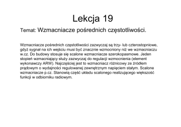 Lekcja 19 Temat: Wzmacniacze pośrednich częstotliwości. Wzmacniacze pośrednich częstotliwości zazwyczaj są trzy- lub czterostopniowe, gdyż sygnał na ich wejściu musi być znacznie wzmocniony niż we wzmacniaczu w.cz. Do budowy stosuje się scalone wzmacniacze szerokopasmowe. Jeden stopień wzmacniający służy zazwyczaj do regulacji wzmocnienia (element wykonawczy ARW). Najczęściej jest to wzmacniacz różnicowy ze źródłem prądowym o wydajności regulowanej zewnętrznym napięciem stałym. Scalone wzmacniacze p.cz. Stanowią część układu scalonego realizującego większość funkcji w odbiorniku radiowym. W odbiornikach z przemianą częstotliwości sygnał z wyjścia mieszacza jest doprowadzony do filtru pośredniej częstotliwości, zapewniającego ostateczne wydzielenie żądanego pasma, i dalej do wzmacniacza pośredniej częstotliwości. Wzmacniacz ten musi zapewnić poziom sygnału dostateczny do prawidłowej pracy demodulatora i jego wzmocnienie zazwyczaj musi być dość duże, co wymaga zastosowania kilku stopni wzmacniających. Ze względu na stałość częstotliwości pośredniej wzmacniacz ten może być zrealizowany z elementów dyskretnych jako nieprzestrajany wzmacniacz rezonansowy. W układach scalonych wzmacniacze pośredniej częstotliwości buduje się zwykle jako wzmacniacze szerokopasmowe, co jest możliwe gdyż częstotliwość pośrednia jest zwykle niezbyt wysoka i można osiągnąć dość duże wzmocnienie pojedynczego stopnia. W odbiornikach radiowych zazwyczaj wymaga się aby odbiornik mógł poprawnie odbierać zarówno słabe jak i silne sygnały. Aby to osiągnąć często konieczne jest zastosowanie w torze wysokiej lub pośredniej częstotliwości stopni wzmacniających o regulowanym wzmocnieniu. Zwykle wzmocnienie to jest regulowane na drodze elektrycznej, co pozwala na zastosowanie automatycznej regulacji wzmocnienia (ARW, AGC – automatic gain control). Do wytworzenia sygnału regulującego wzmocnienie wykorzystuje się sygnał pochodzący z detektora amplitudy w odbiorniku. Sygnał ten powoduje zmniejszenie wzmocnienia wzmacniacza p. cz. przy odbiorze silnych sygnałów i w ten sposób stabilizuje poziom sygnału wyjściowego odbiornika przy wahaniach poziomu sygnału wejściowego, spowodowanych np. zmianami w propagacji fal radiowych. Korzystnie jest gdy sygnał ARW powoduje redukcję wzmocnienia dopiero po osiągnięciu nominalnego poziomu sygnału wyjściowego (ARW z progiem zadziałania), w przeciwnym razie układ ARW będzie redukował czułość odbiornika gdyż wzmocnienie maleje już dla stosunkowo słabych sygnałów. Jeśli zostanie wprowadzony próg zadziałania ARW, to wzmocnienie zaczyna maleć dopiero po osiągnięciu przez sygnał wyjściowy dostatecznie dużego poziomu, zapewniającego poprawną pracę dalszych stopni. Regulacja wzmocnienia we wzmacniaczu w. cz. może odbywać się poprzez zmianę punktu pracy tranzystora. W przypadku tranzystorów bipolarnych wzmocnienie maleje przy zmniejszaniu prądu kolektora, a w przypadku niektórych typów także przy zwiększaniu prądu kolektora. Pierwsza metoda jest stosowana w odbiornikach radiofonicznych a druga w odbiornikach telewizyjnych. Istotnym problemem przy konstruowaniu wzmacniaczy tranzystorowych z regulowanym wzmocnieniem są zmiany impedancji wejściowej i wyjściowej tranzystora w funkcji punktu pracy. Powodują one zmiany szerokości przenoszonego pasma a nawet w skrajnym przypadku rozstrajanie obwodów rezonansowych we wzmacniaczu, Są one szczególnie dokuczliwe podczas regulacji wzmocnienia poprzez zwiększanie prądu kolektora, jednak w zakresie dużych prądów tranzystor pracuje bardziej liniowo, co jest wymagane w zastosowaniach telewizyjnych. We wzmacniaczach z dwubramkowymi tranzystorami MOSFET regulacja wzmocnienia odbywa się poprzez obniżanie napięcia polaryzującego bramkę 2. Dwubramkowy tranzystor MOSFET można traktować jako kaskadowe połączenie dwóch elementarnych tranzystorów MOS. Obniżanie napięcia polaryzacji bramki 2 powoduje zmniejszenie spadku napięcia na dolnym tranzystorze kaskady i tranzystor ten zaczyna pracować w zakresie rezystancyjnym i nachylenie charakterystyki przejściowej maleje. We wzmacniaczach scalonych wzmocnienie tranzystorów bipolarnych można redukować poprzez zmniejszanie prądu kolektora, można też zastosować bardziej złożone układy wielotranzystorowe, takie jak pokazany przykładowo układ z rozdziałem prądu. Podstawowy wzmacniacz stanowi tu para różnicowa T1/T2, prądy kolektorów tych tranzystorów są następnie dzielone w parach różnicowych T3/T4 oraz T5/T6. Jeśli napięcie regulacyjne jest dodatnie to niemal cały prąd wyjściowy pary T1/T2 płynie przez tranzystory T3 i T6 do obciążenia i wzmocnienie jest maksymalne. Przy obniżaniu napięcia regulacyjnego coraz większa część prądu płynie przez tranzystory T4 i T5 bezpośrednio do zasilania i wzmocnienie maleje. Zaletą powyższego układu są małe zmiany impedancji wejściowej i wyjściowej przy zmianach wzmocnienia. Wzmacniacz ogranicznik W przypadku modulacji kąta (FM, PM i pochodne) amplituda sygnału nie przenosi informacji a do demodulacji wystarcza informacja zawarta w częstotliwości chwilowej. Można wtedy ustabilizować amplitudę sygnału poprzez jego wzmocnienie i obcięcie. Zasadniczo każdy wzmacniacz przesterowany powoduje obcięcie sygnału, jednak w technice scalonej do realizacji wzmacniaczy – ograniczników wykorzystuje się wzmacniacze różnicowe. Ich zaletami są symetria ograniczania, łatwość kontroli poziomu ograniczania oraz prosta realizacja w technice scalonej. Amplituda napięcia wyjściowego takiego wzmacniacza nie może przekroczyć wartości (dla wyjścia symetrycznego): Uwy = RL I EE zależnej od prądu IEE polaryzującego parę różnicową i rezystancji obciążenia RL. Zazwyczaj we wzmacniaczu p. cz. łączy się kaskadowo kilka (38) stopni różnicowych, aby osiągnąć żąda
