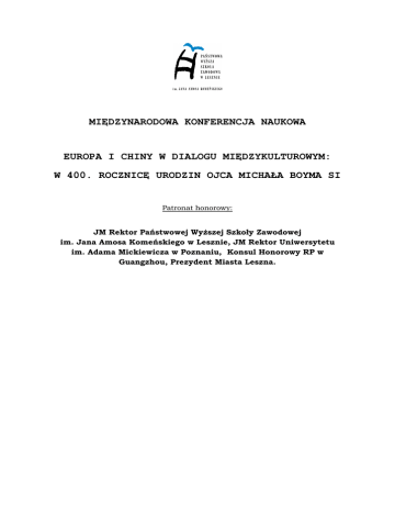 MIĘDZYNARODOWA KONFERENCJA NAUKOWA EUROPA I CHINY W DIALOGU MIĘDZYKULTUROWYM: W 400. ROCZNICĘ URODZIN OJCA MICHAŁA BOYMA SI Patronat honorowy: JM Rektor Państwowej Wyższej Szkoły Zawodowej im. Jana Amosa Komeńskiego w Lesznie, JM Rektor Uniwersytetu im. Adama Mickiewicza w Poznaniu, Konsul Honorowy RP w Guangzhou, Prezydent Miasta Leszna. PROGRAM KONFERENCJI: 20.11. 2012 (wtorek) Przyjazd do Rydzyny i zakwaterowanie w pokojach. Rejestracja uczestników. *** 21.11. 2012 (środa) 7.30 – 9.00 Śniadanie 9.30 – 9.50 Powitanie gości i uroczyste otwarcie konferencji z udziałem: JM Rektora PWSZ, JM Rektora UAM, Konsula Generalnego RP w Guangzhou i Prezydenta Miasta Leszna 10.00 – 11.40 Sesja plenarna część 1 – prowadzenie: R. Dymczyk Przebieg: 10.00 – 10.20 T. Meynard 10.20 – 10.40 S. Feng 10.40 – 11.00 E. Kajdański 11.00 – 11.20 A. W. Mikołajczak 11.20 – 11.40 L. Xiang 11. 40 – 12.00 przerwa na kawę 12.00 – 13.00 Wykłady w sekcjach – część pierwsza: Przebieg: Sekcja pierwsza moderator – K. Mazur 12.00 – 12.20 A. Krzyżanowska – Adamska 12.20 – 12.40 E. Jarmakowska – Kolanus 12.40 – 13.00 M. Morawska Sekcja druga moderator – F. Klak 12.00 – 12.20 J. Wicher 12.20 – 12.40 B. Morawiec 12.40 – 13.00 M. Yel Sekcja trzecia moderator – B. Sipiński 12.00 – 12.20 J. Weizhou 12.20 – 12.40 L. Jingjing 12.40 – 13.00 Ch. Caijun 13.00 – 14.00 Przerwa obiadowa 14.00 – 16.00 Wykłady w sekcjach – część druga: Sekcja pierwsza moderator: T. Hao 14.00 – 14.20 K. Mazur 14.20 – 14.40 Is. Gunes 14.40 – 15.00 B. Kowalczyk 15.00 – 15.20 In. Gunes Sekcja druga moderator: M. Yel 14.20 – 14.40 F. Klak 14.40 – 15.00 A. Berlikaya 15.00 – 15.20 N. Morawiec Sekcja trzecia moderator: M. Morawska 14.20 – 14.40 A. Blicharska 14.40 – 15.00 T. Ewertowski 15.00 – 15.20 T. Algul 15.20 – 16.00 Przerwa 16.00 – 17.00 Promocja książki 17.00 – 19.00 Bankiet 22.11. 2012 (czwartek) 7.30 – 9.00 Śniadanie 10.00 – 14.50 Sesja plenarna część – prowadzenie: A. Mikołajczak Przebieg: 9.30 – 9.50 G. Basti 9.50 – 10.10 T. Hao 10.10 – 10.30 B. Sipiński 10.30 – 11.00 Przerwa na kawę 11.00 – 11.30 M. Miazek Męczyńska 11.30 – 11.50 Y. Yuchang 11.50 – 12.10 R. Dymczyk 12.10 – 12. 30 Przerwa na kawę 12.30 – 12.50 L. Zagoruiko 12.50 – 13.10 A. Blicharska 13.10 – 14.00 Przerwa obiadowa 14.10 – 14.30 B. Sitki Kocakundakci 14.30 – 14.50 K. Krajnyj 15.00 – 15.30 Zamknięcie naukowej części konferencji 15.40 – 16. 00 Przejazd z Rydzyny do Leszna 16.00 – 16.50 Spacer ulicami Leszna do Kolegiaty św. Mikołaja 17.00 – 18.00 Koncert w Kolegiacie 18.30 – 18.50 Powrót do Zamku w Rydzynie 19.00 – 21.00 Uroczysta kolacja i podziękowania 23.11. 2012 (piątek) 1. Zwiedzanie Poznania 2. Zwiedzanie Kórnika 24.11. 2012 (sobota) 1. Zwiedzanie Leszna 20.11. 2012 (niedziela) 1. Zwiedzanie Wrocławia.