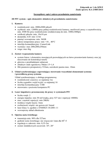 Załącznik nr 1 do SIWZ Znak sprawy KA-2/085/2014 Szczegółowy opis i zakres przedmiotu zamówienia 2D PIV system - opis elementów składowych przedmiotu zamówienia: 1. Kamera · rozdzielczość: min. 2000x2000 pikseli · szybkość: min. 1200Hz przy pełnej rozdzielczości kamery, możliwość pracy z częstotliwością min. 4500 Hz przy rozdzielczości zredukowanej do min. 1000x1000pix · wielkość piksela: min. 10x10 μm · dynamika A/D: min 12 bit · pamięć wewnętrzna: min. 36GB · zakres temperatury pracy: min +10... 40°C · interfejs komunikacyjny: CamerLink · wymiary: max 200x200x250mm · waga: max 6kg 2. Zestaw wyposażenia kamery · system listew i elementów mocujących pozwalających na łatwe przestawianie kamery oraz jej mocowanie do konstrukcji tunelu · głowica z przekładniami zębatymi · obiektyw stało ogniskowy 50mm i F=1,4 · filtr pasmowo przepustowy 532nm, szerokość pasma max. 10nm 3. Układ synchronizujący zapewniający sterowanie wszystkimi elementami systemu i prawidłową pracę systemu Układ synchronizujący z obsługa programową: · rozdzielczość czasowa: co najmniej 1ns · liczba sygnałów wejść/wyjść: co najmniej 16 · interfejs komunikacyjny: USB · sterowanie z poziomu komputera PC 4. Laser impulsowy przeznaczony do pracy w systemach PIV · · · · · · · liczba wnęk: 2 energia impulsu: min 30 mJ/wnękę, przy 527 nm i repetycji 1000Hz max. częstość repetycji: min 20kHz średnica wiązki lasera: 3mm rozbieżność wiązki: nie gorsza niż 3mrad laser klasy 4, zgodnie z EN60825-10:2001-11 wewnętrzny układ chłodzenia 5. Optyka noża świetlnego · · · · transmisja min. 90% dla 527nm grubość noża świetlnego: nie więcej niż 1mm dla M2<5 regulacja w zakresie: min. 0,35-2m zestaw dodatkowych soczewek: 10°, 20° 6. Ramię optyczne do prowadzenia wiązki lasera. Układ przeznaczony do współpracy z laserem Nd:YLF i optyką noża świetlnego. · długość: 1,8m · liczba zwierciadeł: min. 7 · zwierciadła o skuteczności odbicia powyżej 95% · układ balansu · waga: max 20kg 7. Generator posiewu dla powietrza · · · · · · · max. ciśnienie pracy: nie mniej niż 3bar liczba dysz: min. 40 liczba generowanych cząstek posiewu: ok 108/s waga: do 40kg zasilanie: 230VAC zbiornik zabezpieczony zaworem bezpieczeństwa posiew DEHS – 12.5 litra (25x0.5l) 8. Zestaw okablowania zapewniający kompatybilność wszystkich elementów systemu oraz umożliwiający rozbudowę systemu o kolejne elementy sterowania i wyzwalania 9. Oprogramowanie do sterowania urządzeniami, akwizycji danych i obróbki obrazu · możliwość automatycznej obsługi elementów systemu, a w szczególności : sterowanie parametrami laserów impulsowych oraz kamer, sterowanie trawersami, obsługa wzmacniaczy obrazów, migawki zewnętrznej, modułów Scheimpfluga z silnikami, miernika energii itp. (wszystkie wymienione urządzenia muszą być obsługiwane z poziomu jednego oprogramowania) · wyposażenie w funkcję auto kalibracji systemu stereoskopowego na podstawie znanych parametrów płyty kalibracyjnej oraz obrazów z kamer, · możliwość kalibracji systemu stereoskopowego bez użycia znaczników kalibracyjnych oraz automatycznej korekty danych kalibracyjnych w przypadku przesunięcia płaszczyzny noża świetlnego w odniesieniu do płaszczyzny względem której wykonano kalibrację systemu stereoskopowego, · możliwość podglądu obrazów z kamer oraz wyników pomiarów w czasie rzeczywistym, · możliwość rejestracji parametrów elementów systemu i wyników pomiarów na dysku komputera, · realizacja wszystkich funkcji obliczeniowych oraz przetwarzania danych z wykorzystaniem architektury 64-bitowej, · obliczenia wektorów pól prędkości powinny być prowadzone przy zastosowaniu algorytmów korelacji wzajemnej, · możliwość wykorzystania procesorów graficznych dla zwiększenia mocy obliczeniowych i skrócenia czasu przetwarzania obrazów, · możliwość współdzielenia zasobów obliczeniowych opartych na darmowych systemach operacyjnych, · możliwość programowania makr (CL), · możliwości Importu/Exportu danych: BMP, JPG, TIF, Tecplot, DAT, TXT, PS, IM7, IM8 · zintegrowany generator plików AVI oraz standardowe biblioteki DLL dla Matlab i LabView, · możliwość maskowania fragmentów rejestrowanych obrazów z automatycznym wykluczeniem pikseli znajdujących się w maskowanym obszarze z procesu wyznaczania pól prędkości, · możliwość zdefiniowanie procedur badania z możliwością automatycznej zmiany stałej czasowej, fazy, pozycji kamery oraz energii lasera w każdej sekwencji rejestracji obrazów, · automatyczna korekcję przesunięcia i obrotu obrazów PIV spowodowanego wibracjami lub przemieszczeniem sprzętu pomiarowego w czasie prowadzenia pomiarów, · wykorzystanie algorytmów adaptacyjnych PIV pozwalający na automatyczne dobranie parametrów przetwarzania obrazu (wielkość, kształt, orientację) w celu dokładnego wyznaczenia wektorów pól prędkości o zróżnicowanych wielkościach, · automatyczny zapis informacji o parametrach systemu (czas pomiędzy impulsami lasera, czas ekspozycji kamery, czas wykonania akwizycji obrazu) z każdym rejestrowanym obrazem, · możliwość rozbudowy oprogramowania o moduły pozwalające na przetwarzanie obrazów pod kątem 3D-PIV, Tomo-PIV · możliwość obrazowania przestrzennego pól prędkości na bazie systemu stereoskopowego · wykorzystanie algorytmów MART i MTE w celu rekonstrukcji przestrzeni dla pomiarów wolumetrycznych pól prędkości z zastosowaniem algorytmów autokorelacji przy zastosowaniu 2 kamer 10. Moduł oprogramowania do obsługi kamer szybkich 11. Moduł oprogramowania do określania rozkładu dwóch składowych pól prędkości. · Obliczenia powinny być prowadzone przy zastosowaniu autokorelacji danych pomiarowych. Oprogramowanie powinno umożliwiać eksport wyników do formatu używanego przez programy zaawansowanej obróbki i prezentacji