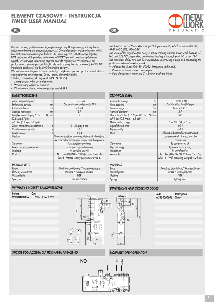 ELEMENT CZASOWY – INSTRUKCJA TIMER USER MANUAL GB PL Element czasowy jest elementem logiki pneumatycznej, którego funkcją jest uzyskanie opóźnienia dla sygnału pneumatycznego „x”. Oferta elementów logicznych Metal Work Pneumatic zawiera następujące funkcje: OR (suma logiczna), AND (iloczyn logiczny), NOT (negacja), YES (potwierdzenie) oraz MEMORY (pamięć). Wartość opóźnienia sygnału wyjściowego ustawia się poprzez pokrętło regulacyjne. W zależności od podłączenia zasilania (port „a” lub „b”) element czasowy będzie pracował jako 3/2 NC (normalnie zamknięty) lub 3/2 NO (normalnie otwarty). Wartość maksymalnego opóźnienia może być zwiększona poprzez podłączenie dodatkowego zbiornika zewnętrznego. Cechy i zalety elementów logiki: • Uchwyt montażowy do szyny Ω (DIN EN 50022) zintegrowany w korpusie elementu. • Wbudowany wskaźnik cisnienia. • Wbudowane złącza wtykowe pod przewód Ø 4. The Timer is part of Metal Work range of logic elements, which also includes OR, AND, NOT, YES, MEMORY. The value of the signal output delay is set by rotating a knob. It can work both as 3/2 NC and 3/2 NO, depending on whether feeding is through port “a“ or port “b”. The maximum delay time can be increased by unscrewing a plug and connecting the port to an external auxiliary tank. • Adaptor for Ω bar (DIN EN 50022) integrated in the body. • Pressure indicator via an orange pin. • Pipe clamping system using Ø 4 built-in push-on fittings. DANE TECHNICZNE TECHNICAL DATA – 10 ÷ + 60 Zakres temperatur pracy °C Złącza wtykowe pod przewód Ø 4 Podłączenia zaworu mm 2.5 ÷ 8 Ciśnienie robocze bar 2.7 Średnica nominalna mm 100 Przepływ nominaly przy 6 bar Nl/min (0.6 Mpa, 87 psi) ∆P 1 bar (0.1 Mpa, 14.5 psi) 0 ÷ 30, przy 6 bar Zakres nastawianego opóźnienia s < 0.1 Czas kasowania sygnału s ± 0.4 Powtarzalność s Filtrowane sprężone powietrze, olejone lub nie olejone. Medium W przypadku smarowania - konieczność kontynuacji Przez sprężone powietrze Sterowanie Przez sprężynę mechaniczną Powrót do pozycji wyjściowej W dowolnej pozycji Instalacja Na szynie Ω (DIN EN 50022) rozmiar 35x7 lub Montaż 35x15 - Montaż ścienny poprzez otwory Ø 4. Temperature range°C Valve couplingmm Pressure rangebar Nominal diametermm Flow rate at 6 bar (0.6 Mpa, 87 psi) Nl/min MATERIAŁY UŻYTE Korpus Elementy wewnętrzne Uszczelnienia Sprężyna Aluminium anodowane / Tworzywo sztuczne Mosiądz / Tworzywo sztuczne NBR Stal sprężynowa WYMIARY I INDEKSY ZAMÓWIENIOWE ∆P 1 bar (0.1 Mpa, 14.5 psi) Delay setting range s Signal shutoff time s Repeatabilitys Fluid Operating Repositioning Installation Assembly – 10 to + 60 Push-in fitting for Ø 4 pipe From 2.5 to 8 2.7 100 From 0 to 30, at 6 bar < 0.1 ± 0.4 Filtered, lubricated or unlubricated compressed air. If used, must be continuous By compressed air By mechanical spring In any direction On Ω bar (DIN EN 50022) size 35 x 7 or 35 x 15 - Wall mounting using Ø 4.2 holes MATERIALS Body Internal parts Gaskets Spring Anodised aluminium / Technopolymer Brass / Technopolymer NBR Spring steel DIMENSIONS AND ORDERING CODES Indeks Opis W3604000006 ELEMENT CZASOWY Code Description W3604000006 Timer SPOSÓB PODŁĄCZENIA DLA UZYSKANIA FUNKCJI NO NORMALLY OPEN OPERATION NO 1 SPOSÓB PODŁĄCZENIA DLA UZYSKANIA FUNKCJI NC NORMALLY CLOSED OPERATION NC ZMIANA WARTOŚCI OPÓŹNIENIA W ZALEŻNOSCI OD CIŚNIENIA ZASILAJĄCEGO ORAZ NASTAWY CHANGE IN THE DELAY WITH CHANGE IN PRESSURE Ciśnienie na x [bar] / Pressure at X [bar] Czas opóźnienia [s] / Delay time [sec] ZWIĘKSZENIE OPÓŹNIENIA HOW TO INCREASE THE DELAY Objętość zbiornika [cm3] / Tank volume [cm3] Objętość zbiornika / Bit Filter Bowl Volume ( used as a tank) Czas [sec] / Time [sec] A = przyłącze (zaślepione) dla dodatkowego zbiornika zewnętrznego B = zbiornik zewnętrzny www.metalwork.eu A = coupling (plugged) for external additional tanks B = external tank M0040500 POL_GB - IM00_10/2015 2