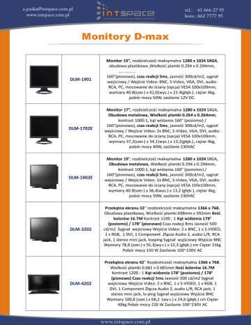 [email protected] www.intspace.com.pl tel.: 61 666 27 95 kom.: 662 7777 95 Monitory D-max Monitor 19”, rozdzielczość maksymalna 1280 x 1024 SXGA, obudowa plastikowa ,Wielkość plamki 0.294 x 0.294mm, kontrast 1000:1, kąt widzenia 160° (poziomo) / DLM-1901 160°(pionowo), czas reakcji 5ms, jasność 300cd/m2, sygnał wejściowy / Wejście Video: BNC, S-Video, VGA, DVI, audio: RCA, PC, mocowanie do ściany (opcja) VESA 100x100mm, wymiary 40.8(szer.) x 42,0(wys.) x 22.4(głęb.), ciężar 4kg, pobór mocy 50W, zasilanie 12V DC. DLM-1702E Monitor 17”, rozdzielczość maksymalna 1280 x 1024 SXGA, Obudowa metalowa, Wielkość plamki 0.264 x 0.264mm, kontrast 1000:1, kąt widzenia 160° (poziomo) / 160°(pionowo), czas reakcji 5ms, jasność 300cd/m2, sygnał wejściowy / Wejście Video: 2x BNC, S-Video, VGA, DVI, audio: RCA, PC, mocowanie do ściany (opcja) VESA 100x100mm, wymiary 37,2(szer.) x 34,1(wys.) x 13,2(głęb.), ciężar 4kg, pobór mocy 40W, zasilanie 230VAC DLM-1902E Monitor 19”, rozdzielczość maksymalna 1280 x 1024 SXGA, Obudowa metalowa, Wielkość plamki 0.294 x 0.294mm, kontrast 1000:1, kąt widzenia 160° (poziomo) / 160°(pionowo), czas reakcji 5ms, jasność 300cd/m2, sygnał wejściowy / Wejście Video: 2x BNC, S-Video, VGA, DVI, audio: RCA, PC, mocowanie do ściany (opcja) VESA 100x100mm, wymiary 40.9(szer.) x 36,4(wys.) x 13,2 (głęb.), ciężar 4kg, pobór mocy 50W, zasilanie 230VAC DLM-3202 Przekątna ekranu 32” rozdzielczość maksymalna 1366 x 768, Obudowa plastikowa, Wielkość plamki 698mm x 392mm Ilość kolorów 16.7M Kontrast 1100 : 1 Kąt widzenia 178° (poziomo) / 178° (pionowo) Czas reakcji 8ms Jasność 500 cd/m2 Sygnał wejściowy Wejście Video: 2 x BNC, 1 x S-VIDEO, 1 x RGB, 1 DVI, 1 Component Złącza Audio 2, audio L/R, RCA jack, 1 stereo mini jack, looping Sygnał wyjściowy Wyjście BNC Wymiary 78,8 (szer.) x 55,3(wy s.) x 22,3 (głęb.) cm Ciężar 21kg Pobór mocy 150 W Zasilanie 100~230V AC DLM-4202 Przekątna ekranu 42” Rozdzielczość maksymalna 1366 x 768. Wielkość plamki 0.681 x 0.681mm Ilość kolorów 16.7M Kontrast 1200 : 1 Kąt widzenia 178° (poziomo) / 178° (pionowo) Czas reakcji 5ms Jasność 500 cd/m2 Sygnał wejściowy Wejście Video: 2 x BNC, 1 x S-VIDEO, 1 x RGB, 1 DVI, 1 Component Złącza Audio 2, audio L/R, RCA jack, 1 stereo mini jack, lo ping Sygnał wyjściowy Wyjście BNC Wymiary 100,8 (szer.) x 68,2 (wy s.) x 24,6 (głęb.) cm Ciężar 40kg Pobór mocy 220 W Zasilanie 100~230V AC www.intspace.com.pl [email protected] www.intspace.com.pl tel.: 61 666 27 95 kom.: 662 7777 95 Monitory D-max DLM-4202 Przekątna ekranu 42” Rozdzielczość maksymalna 1366 x 768. Wielkość plamki 0.681 x 0.681 mm Ilość kolorów 16.7 M Kontrast 1200 : 1 Kąt widzenia 178° (poziomo) / 178° (pionowo) Czas reakcji 5 ms Jasność 500 cd/m2 Sygnał wejściowy Wejście Video: 2 x BNC, 1 x S-VIDEO, 1 x RGB, 1 DVI, 1 Component Złącza Audio 2, audio L/R, RCA jack, 1 stereo mini jack, loo ping Sygnał wyjściowy Wyjście BNC Wymiary 100,8 (szer.) x 68,2 (wys.) x 24,6 (głęb.) cm Ciężar 40 kg Pobór mocy 220 W Zasilanie 100~230V AC Zapraszamy do współpracy www.intspace.com.pl