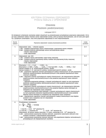 KRYTERIA OCENIANIA ODPOWIEDZI Próbna Matura z OPERONEM Chemia Poziom podstawowy Listopad 2011 W niniejszym schemacie oceniania zadań otwartych są prezentowane przykładowe poprawne odpowiedzi. W tego typu zadaniach należy również uznać odpowiedzi ucznia, jeśli są inaczej sformułowane, ale ich sens jest zgodny z podanym schematem, oraz inne poprawne odpowiedzi w nim nieprzewidziane. Numer zadania Poprawna odpowiedź i zasady przyznawania punktów Liczba punktów 1. Odpowiedź: CaCl2 – chlorek wapnia 1 pkt – podanie poprawnego wzoru chemicznego i poprawnej nazwy związku 0 pkt – podanie jedynie poprawnego wzoru lub poprawnej nazwy – błędne odpowiedzi – brak odpowiedzi 0–1 2. Odpowiedź: rad, 223 1 pkt – podanie nazwy pierwiastka i jego liczby masowej 0 pkt – podanie jedynie poprawnej nazwy nuklidu lub poprawnej liczby masowej – błędne odpowiedzi – brak odpowiedzi 0–1 3. Równanie 1: 2 K + 2 H2O $ 2 KOH + H2Równanie 2: 2 KOH + H2SO4 $ K2SO4 + 2 H2O lub KOH + H2SO4 $ KHSO4 + H2O Nazwa związku A i B: wodorotlenek potasu, wodór Nazwa związku C i D: siarczan(VI) potasu (wodorosiarczan(VI) potasu), woda 3 pkt – poprawne napisanie równań zachodzących reakcji chemicznych (w tym poprawne dobranie współczynników stechiometrycznych) oraz podanie poprawnych nazw czterech związków 2 pkt – napisanie równań zachodzących reakcji chemicznych, ale niepoprawne dobranie współczynników stechiometrycznych oraz podanie poprawnych nazw czterech związków – napisanie poprawnie jednego z równań zachodzących reakcji (w tym poprawne dobranie współczynników stechiometrycznych) oraz podanie poprawnych nazw czterech związków 1 pkt – napisanie równań zachodzących reakcji chemicznych, ale niepoprawne dobranie współczynników stechiometrycznych oraz podanie błędnej nazwy któregoś ze związków lub niepodanie nazw związków – napisanie poprawnie tylko jednego z równań zachodzących reakcji chemicznych (w tym poprawne dobranie współczynników stechiometrycznych) oraz podanie błędnej nazwy któregoś ze związków lub niepodanie nazw związków 0 pkt – niepoprawne zapisanie równań zachodzących reakcji chemicznych oraz błędne podanie nazw związków lub ich niepodanie – brak odpowiedzi 0–3 4. Przykładowe rozwiązanie: m 84 g n= s = g = 1,5 mola M 56 mol 1 mol Fe — 6,02 · 1023 atomów Fe 1,5 mol Fe — x atomów Fe x = 9,03 · 1023 atomów Fe Odpowiedź: 84 gramy żelaza stanowią 1,5 mola i zawierają 9,03 · 1023 atomów Fe. 2 pkt – zastosowanie poprawnej metody obliczeń, poprawne wykonanie obliczeń oraz podanie wyników z odpowiednimi jednostkami 1 pkt – zastosowanie poprawnej metody obliczeń, ale popełnienie błędów rachunkowych prowadzących do niepoprawnych wyników w w w. o p e r o n . p l 1 Chemia. Poziom podstawowy Próbna Matura z OPERONEM i „Gazetą Wyborczą” Numer zadania Poprawna odpowiedź i zasady przyznawania punktów Liczba punktów – zastosowanie poprawnej metody obliczeń, poprawne wykonanie obliczeń, ale podanie wyników z błędną jednostką lub bez jednostki – zastosowanie poprawnej metody obliczeń, poprawne obliczenia i podanie poprawnego wyniku tylko dla liczby moli, ale brak dalszych obliczeń 0 pkt – zastosowanie błędnej metody obliczeń lub brak odpowiedzi 0–2 5. Doświadczenie I: wydzielanie się pęcherzyków bezbarwnego gazu Doświadczenie II: brak objawów reakcji Doświadczenie III: brak objawów reakcji Doświadczenie IV: wytrąca się osad 4 pkt – podanie czterech poprawnych opisów obserwacji doświadczeń 3 pkt – podanie tylko trzech poprawnych opisów obserwacji doświadczeń 2 pkt – podanie tylko dwóch poprawnych opisów obserwacji 1 pkt – podanie tylko jednego poprawnego opisu obserwacji doświadczenia 0 pkt – brak poprawnych odpowiedzi 0–4 6. Doświadczenie I: 2 H+ + CO2– 3 $ H2O + CO2Doświadczenie IV: Ba2+ + SO2– 4 $ BaSO4. 2 pkt – poprawne napisanie dwóch równań reakcji w formie jonowej skróconej, w tym poprawne dobranie współczynników stechiometrycznych 1 pkt – poprawne napisanie dwóch równań reakcji w formie jonowej skróconej, ale niepoprawne dobranie współczynników stechiometrycznych – poprawnie napisanie jednego równania reakcji w formie jonowej skróconej (w tym poprawne dobranie współczynników stechiometrycznych) 0 pkt – niepoprawne zapisanie równań reakcji chemicznych bądź brak odpowiedzi 0–2 7. Doświadczenie I: Tlenek siarki(VI) ma charakter kwasowy. Doświadczenie II: Tlenek magnezu ma charakter zasadowy. Doświadczenie III: Tlenek azotu(II) ma charakter obojętny. 3 pkt – podanie poprawnych wniosków z trzech doświadczeń 2 pkt – podanie poprawnych wniosków tylko z dwóch doświadczeń 1 pkt – podanie poprawnego wniosku tylko z jednego doświadczenia 0 pkt – brak poprawnych odpowiedzi 0–3 8. Odpowiedź: Roztwór nasycony 1 pkt – poprawnie określony typ roztworu 0 pkt – błędnie określony typ roztworu lub brak odpowiedzi 0–1 9. Przykładowe rozwiązanie: mNaCl = 37,3 g mr = mNaCl + mH2O = 37,3 g + 100 g = 137,3 g m 37,3 g C p = m s $ 100% = $ 100% = 27,2% 137,3 g r Typ roztworu: nienasycony. 3 pkt – zastosowanie poprawnej metody obliczeń, poprawne wykonanie obliczeń, podanie wyniku z odpowiednią jednostką oraz poprawne podanie typu 25-procentowego roztworu 2 pkt – zastosowanie poprawnej metody obliczeń, poprawne wykonanie obliczeń, podanie wyniku z odpowiednią jednostką, ale błędne podanie typu 25-procentowego roztworu – zastosowanie poprawnej metody obliczeń, poprawne wykonanie obliczeń, ale podanie wyniku z niepoprawną jednostką oraz poprawne podanie typu 25-procentowego roztworu – zastosowanie poprawnej metody obliczeń, ale popełnienie błędów rachunkowych prowadzących do niepoprawnego wyniku liczbowego i podanie wyniku z poprawną jednostką, poprawne podanie typu 25-procentowego roztworu 1 pkt – zastosowanie poprawnej metody obliczeń, ale pope