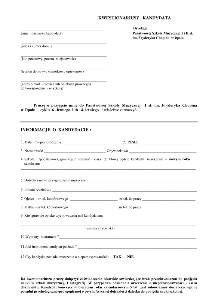 KWESTIONARIUSZ KANDYDATA ______________________________________ (imię i nazwisko kandydata) _______________________________________________ (ulica i numer domu) Dyrekcja Państwowej Szkoły Muzycznej I i II st. im. Fryderyka Chopina w 0polu _______________________________________________ (kod pocztowy, poczta, miejscowość) _______________________________________________ (telefon domowy, komórkowy opiekunów) _______________________________________________ (adres e-mail – rodzica lub opiekuna prawnego) do korespondencji ze szkołą) Proszę o przyjęcie mnie do Państwowej Szkoły Muzycznej I st. im. Fryderyka Chopina w Opolu cyklu 6 –letniego lub 4- letniego / właściwe zaznaczyć/ INFORMACJE O KANDYDACIE : 1. Data i miejsce urodzenia _________________________________2. PESEL_______________________________ 3. Narodowość __________________________________ Obywatelstwo _____________________________________ 4. Szkoła, /podstawowa, gimnazjum, średnia/ klasa do której będzie kandydat uczęszczał w nowym roku szkolnym: ________________________________________________________________________________________________ 5. Dotychczasowe przygotowanie muzyczne : ___________________________________________________________ 6. Imiona rodziców : _______________________________________________________________________________ 7. Ojciec – nr tel. komórkowego __________________________ nr tel. do pracy _____________________________ 8. Matka – nr tel. komórkowego ___________________________ nr tel. do pracy _____________________________ 9. Kto sprawuje opiekę wychowawczą nad kandydatem: ________________________________________________________________________________________________ (imiona i nazwiska) 10.Wybrany instrument ?___________________________________________________________________________ 11.Jaki instrument kandydat posiada ? _________________________________________________________________ 12.Czy kandydat posiada orzeczenie o niepełnosprawności : TAK - NIE Do kwestionariusza proszę dołączyć zaświadczenie lekarskie stwierdzające brak przeciwwskazań do podjęcia nauki w szkole muzycznej, 1 fotografię. W przypadku posiadania orzeczenia o niepełnosprawności - ksero dokumentu. Kandydat kończący w bieżącym roku kalendarzowym 5 lat jest zobowiązany dostarczyć opinię poradni psychologiczno-pedagogicznej o psychofizycznej dojrzałości dziecka do podjęcia nauki szkolnej. Wyrażam zgodę na przetwarzanie moich danych osobowych do celów rekrutacji, realizacji procesu nauczania w PSM I i II st. w Opolu, promocji szkoły zgodnie z Ustawą o Ochronie Danych Osobowych z dnia 29.08.1997r. /Dz.U. z 2002r. Nr 101, poz. 926 z późn. zmianami/. Składając kwestionariusz przyjmuję postanowienie Regulaminu Rekrutacji PSM w Opolu. Ma Pan/Pani prawo dostępu do treści swoich danych, ich poprawiania i uzupełniania. *wymagane są dwa podpisy ________________________________________________ data (podpis matki / prawnego opiekuna) __________________________________________________ data (podpis ojca / prawnego opiekuna)
