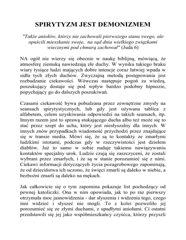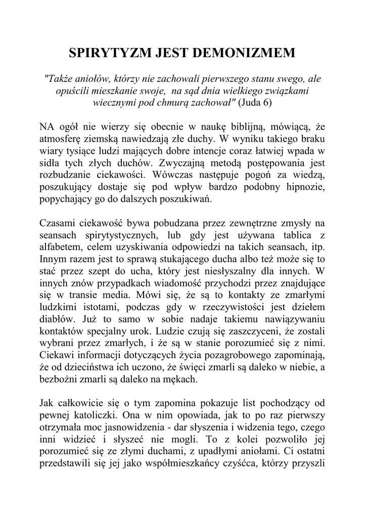SPIRYTYZM JEST DEMONIZMEM "Także aniołów, którzy nie zachowali pierwszego stanu swego, ale opuścili mieszkanie swoje, na sąd dnia wielkiego związkami wiecznymi pod chmurą zachował" (Juda 6) NA ogół nie wierzy się obecnie w naukę biblijną, mówiącą, że atmosferę ziemską nawiedzają złe duchy. W wyniku takiego braku wiary tysiące ludzi mających dobre intencje coraz łatwiej wpada w sidła tych złych duchów. Zwyczajną metodą postępowania jest rozbudzanie ciekawości. Wówczas następuje pogoń za wiedzą, poszukujący dostaje się pod wpływ bardzo podobny hipnozie, popychający go do dalszych poszukiwań. Czasami ciekawość bywa pobudzana przez zewnętrzne zmysły na seansach spirytystycznych, lub gdy jest używana tablica z alfabetem, celem uzyskiwania odpowiedzi na takich seansach, itp. Innym razem jest to sprawą stukającego ducha albo też może się to stać przez szept do ucha, który jest niesłyszalny dla innych. W innych znów przypadkach wiadomość przychodzi przez znajdujące się w transie media. Mówi się, że są to kontakty ze zmarłymi ludzkimi istotami, podczas gdy w rzeczywistości jest dziełem diabłów. Już to samo w sobie nadaje takiemu nawiązywaniu kontaktów specjalny urok. Ludzie czują się zaszczyceni, że zostali wybrani przez zmarłych, i że są w stanie porozumieć się z nimi. Ciekawi informacji dotyczących życia pozagrobowego zapominają, że od dzieciństwa ich uczono, że święci zmarli są daleko w niebie, a bezbożni zmarli są daleko na mękach. Jak całkowicie się o tym zapomina pokazuje list pochodzący od pewnej katoliczki. Ona w nim opowiada, jak to po raz pierwszy otrzymała moc jasnowidzenia - dar słyszenia i widzenia tego, czego inni widzieć i słyszeć nie mogli. To z kolei pozwoliło jej porozumieć się ze złymi duchami, z upadłymi aniołami. Ci ostatni przedstawili się jej jako współmieszkańcy czyśćca, którzy przyszli do niej po pomoc. Naprzykrzając się jej w modlitwach, coraz bardziej podporządkowywali ją swej kontroli. W ostatniej chwili uratowało ją przestudiowanie niektórych pism Prawdy. Od tamtego czasu ćwiczyła swą wolę i modlitwy broniące ją przed jakąkolwiek społecznością z demonami. Wyrafinowane metody używane przez demony Nierzadko duchy te uosabiają Niebiańskiego Ojca i Chrystusa, nalegają na częstsze modlitwy, oskarżają o grzech, zalecają czytanie Pisma Świętego, itp. Okazuje się, że ma to na celu zdobycie większego zaufania i rozluźnienia woli u wybranych ofiar. Dopiero później czynione są niecne propozycje. Biblia jest wyszydzana a modlitwa wyśmiewana, itp. Jeśli wówczas osobnik boi się i stara się przełamać hipnotyczny łańcuch, złe duchy wyśmiewają się z niego, a czasami mówią mu, że wkrótce będą go mieć całkowicie w swej władzy i na zawsze będą go prażyć w ogniu. Jeśli osoba taka usiłuje się modlić, wkraczają i przerywają jej mówiąc, że Bóg teraz i tak jej nie wysłucha, że odeszła zbyt daleko, itp. W niektórych wypadkach sprawy zachodzą tak daleko, że następuje całkowite załamanie ludzkiej woli i duchy całkowicie opanowują swe ofiary, niemądrze wykorzystując ich ciała. Czynią je podłymi, czasem niezrównoważonymi umysłowo, aż ostatecznie zyskują opinię niebezpiecznych jednostek i osadzani są w szpitalach dla umysłowo chorych. Nie twierdzimy, że wszyscy chorzy umysłowo opanowani są przez demony, ale zgodnie z doniesieniami, połowa mieszkańców szpitali dla umysłowo chorych jest opanowana przez demony, które w nich wstępują kierując ich wolą. Bóg przez Swoje Słowo przestrzegł Swój lud przed takimi złudzeniami. Pozwalając niektórym pomimo tego wpaść w te sidła, daje On nam po prostu wielką lekcję, a mianowicie, pokazuje okropne rezultaty nieposłuszeństwa i lekceważenia Bożego Słowa. Doktryny demonów Święty Paweł opisując nasze czasy, jako jeden z wyróżniających je znaków wymienia fakt interesowania się przez wielu ludzi tymi zwodniczymi duchami, których nauki i praktyki oddalają od Boga. Apostoł podaje również wiadomość, że przez te zwodzące duchy wielu zacznie wyznawać doktryny demonów, diabelskie nauki (1 Tym. 4:1). Jest to smutna refleksja, że we wspaniałych czasach oświecenia najbardziej światłe jednostki stają się wyznawcami najstraszniejszej doktryny uczącej o życiu pozagrobowym - o wiecznych mękach. Demoniczną doktryną jest z pewnością taka doktryna, która twierdzi, pozbawiając tym samym czci imię Boga, że 999 osób na 1.000 będzie wiecznie torturowanych, bądź to z powodu Boskiej niekompetencji w przygotowaniu dla nich lepszych zarządzeń, bądź też dlatego, że Bóg postanowił już i zarządził tak przed aktem stworzenia. Ta demoniczna doktryna podbiła w niewolę wielu godnych szacunku ludzi, którzy pogardzaliby sami sobą, gdyby mieli stworzyć taki plan, jaki przypisują Bogu. Dzięki Bogu, że nie odległy jest już czas, gdy te zwodnicze duchy zostaną całkowicie związane i ograniczone, tak aby nie zwodziły już więcej ludzkości. Ale oszustwa już tak długo panują nad biedną ludzkością, że jest ona w dużym stopniu pod ich kontrolą. Fałszerstwo, które doprowadziło do wszystkich obecnych błędów, to pierwsze kłamstwo szatana, wypowiedziane do naszych rodziców w Edenie. Tam przekręcając słowa wypowiedziane przez Boga, szatan rzekł: "Żadnym sposobem śmiercią nie pomrzecie" (1 Mojż. 3:4). I od tamtej chwili przez 6.000 lat szatan razem ze swymi wszystkimi upadłymi aniołami działał zgodnie z tą linią. Jego poselstwo "Żadnym sposobem śmiercią nie pomrzecie" mówi, że kiedy wydaje się, iż człowiek umiera, to staje się on bardziej żywy niż przed śmiercią. Za sprawą błędu, że umarli żyją, szatan i upadli aniołowie wpoili całemu światu nonsensowny, pogański i pozostający w sprzeczności z naukami Biblii przesąd, nauczający o niebie, czyśćcu i piekle. Kat