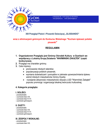 ul.Olsztyńska 28, 11-001 Dywity; tel. 89 5120123 www.gokdywity.eu; email: [email protected] XIII Przegląd Pieśni i Piosenki Dziecięcej „GLISSANDO” wraz z eliminacjami gminnymi do Konkursu Wokalnego "Kocham śpiewać polskie piosenki" REGULAMIN 1. Organizatorem Przeglądu jest Gminny Ośrodek Kultury w Dywitach we współpracy z Lokalną Grupą Działania "WARMINSKI ZAKĄTEK" (część konkursowa). 2. Przegląd ma charakter gminny. 3. Cele imprezy: promowanie młodych talentów; popularyzacja polskich piosenek; wymiana doświadczeń i pomysłów w zakresie upowszechniania śpiewu wśród młodych mieszkańców Gminy Dywity; rozwijanie aktywności mieszkańców obszaru LGD "Warmiński Zakątek" poprzez promocję i organizację lokalnej twórczości kulturalnej; 4. Kategorie przeglądu: I. SOLIŚCI: - przedszkolaki; - uczniowie klas I-III; - uczniowie klas IV-VI; - uczniowie gimnazjum. II. DUETY: - przedszkolaki; - uczniowie klas I-III; - uczniowie klas IV-VI; - uczniowie gimnazjum. III. ZESPOŁY WOKALNE: - przedszkolaki; - uczniowie klas I-III; - uczniowie klas IV-VI; - uczniowie gimnazjum. Udział w eliminacjach Konkursu "Kocham śpiewać polskie piosenki" biorą udział wyłącznie soliści w następujących kategoriach wiekowych: - uczniowie klas I-III; - uczniowie klas IV-VI; - uczniowie gimnazjum. Zwycięzców części konkursowej dla solistów (po 1 w każdej kategorii) wybierze Jury złożone z 3 niezależnych jurorów. Zwycięzcy będą reprezentować Gminę Dywity w międzygminnym etapie konkursu, w połowie kwietnia 2016r.. 5. Zwycięzcy części konkursowej "Kocham śpiewać polskie piosenki" otrzymają drobne nagrody rzeczowe ufundowane przez LGD "Warmiński Zakątek". Uczestnicy przeglądu otrzymają prezenty edukacyjne dla swoich placówek. 6. Warunki uczestnictwa: Do udziału w Przeglądzie uczestnicy zgłaszani są na kartach zgłoszeń wg załączonego wzoru (uwaga oddzielne karty dla solistów!), w nieprzekraczalnym terminie do 18 marca 2016r. (Zgłoszenia można też wysyłać drogą internetową na adres [email protected] z tytułem „Glissando 2016”). Każda placówka może wydelegować nie więcej niż 4 podmioty wykonawcze. Każdy wykonawca/zespół prezentuje maksymalnie 2 utwory w języku polskim. Prezentacja może odbyć się a’capella, z akompaniamentem lub z półplaybacku (CD, taśma magnetofonowa, mp3). Do zgłoszeń prosimy dołączać pliki z podkładem. 7. Przegląd odbędzie się 31 marca 2016 roku (czwartek) o godz. 10.00 , w Gminnym Ośrodku Kultury w Dywitach. 8. Informacje dostępne są na stronie www.gokdywity.eu, lub pod nr telefonu - 89 5120123. Koordynatorem konkursu jest Pan Krzysztof Włodarski. W dniu "GLISSANDA" od godziny 8.30 do 9.30 zapraszamy na próby techniczne!