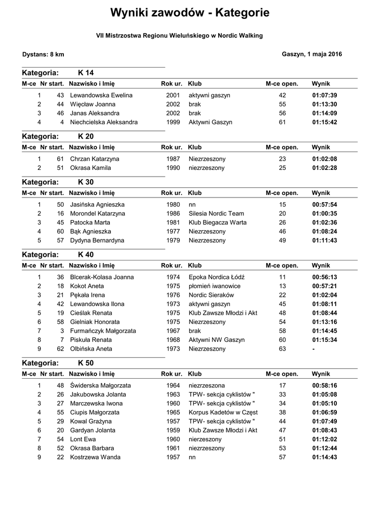 Wyniki zawodów - Kategorie VII Mistrzostwa Regionu Wieluńskiego w Nordic Walking Gaszyn, 1 maja 2016 Dystans: 8 km Kategoria: K 14 M-ce Nr start. Nazwisko i Imię 1 2 3 4 43 44 46 4 Kategoria: Lewandowska Ewelina Więcław Joanna Janas Aleksandra Niechcielska Aleksandra 61 51 Kategoria: Chrzan Katarzyna Okrasa Kamila 50 16 45 60 57 Kategoria: Jasińska Agnieszka Morondel Katarzyna Patocka Marta Bąk Agnieszka Dydyna Bernardyna 36 18 21 42 19 58 3 7 62 Kategoria: Blcerak-Kolasa Joanna Kokot Aneta Pękała Irena Lewandowska Ilona Cieślak Renata Gielniak Honorata Furmańczyk Małgorzata Piskuła Renata Olbińska Aneta 48 26 27 55 29 20 54 52 22 01:07:39 01:13:30 01:14:09 01:15:42 Rok ur. Klub 1987 1990 Niezrzeszony niezrzeszony M-ce open. 23 25 Wynik 01:02:08 01:02:28 Rok ur. Klub 1980 1986 1981 1977 1979 nn Silesia Nordic Team Klub Biegacza Warta Niezrzeszony Niezrzeszony M-ce open. 15 20 26 46 49 Wynik 00:57:54 01:00:35 01:02:36 01:08:24 01:11:43 Rok ur. Klub 1974 1975 1976 1973 1975 1975 1967 1968 1973 Epoka Nordica Łódź płomień iwanowice Nordic Sieraków aktywni gaszyn Klub Zawsze Młodzi i Akt Niezrzeszony brak Aktywni NW Gaszyn Niezrzeszony M-ce open. 11 13 22 45 48 54 58 60 63 Wynik 00:56:13 00:57:21 01:02:04 01:08:11 01:08:44 01:13:16 01:14:45 01:15:34 - K 50 M-ce Nr start. Nazwisko i Imię 1 2 3 4 5 6 7 8 9 42 55 56 61 K 40 M-ce Nr start. Nazwisko i Imię 1 2 3 4 5 6 7 8 9 aktywni gaszyn brak brak Aktywni Gaszyn Wynik K 30 M-ce Nr start. Nazwisko i Imię 1 2 3 4 5 2001 2002 2002 1999 M-ce open. K 20 M-ce Nr start. Nazwisko i Imię 1 2 Rok ur. Klub Świderska Małgorzata Jakubowska Jolanta Marczewska Iwona Ciupis Małgorzata Kowal Grażyna Gardyan Jolanta Lont Ewa Okrasa Barbara Kostrzewa Wanda Rok ur. Klub 1964 1963 1960 1965 1957 1959 1960 1961 1957 niezrzeszona TPW- sekcja cyklistów " TPW- sekcja cyklistów " Korpus Kadetów w Częst TPW- sekcja cyklistów " Klub Zawsze Młodzi i Akt nierzeszony niezrzeszony nn M-ce open. 17 33 34 38 44 47 51 53 57 Wynik 00:58:16 01:05:08 01:05:10 01:06:59 01:07:49 01:08:43 01:12:02 01:12:44 01:14:43 Wyniki zawodów - Kategorie VII Mistrzostwa Regionu Wieluńskiego w Nordic Walking Gaszyn, 1 maja 2016 Dystans: 8 km 10 5 Kategoria: Niechcielska Ewa 40 24 28 30 33 Kategoria: Sobańska Grazyna Paszkiewicz-Kęsiak Anita Krowicka Halina Kochaniak Maria Szymankiewicz Anna 12 2 Kategoria: Musiał Marcel Komar Bartosz 11 10 63 Kategoria: Wierzbicki Piotr Panek Szymon Kowalczyk Łukasz 37 8 1 6 Kategoria: Treściński Leszek Migalski Tomasz Magnuski Dariusz Szecel Arkadiusz 41 25 17 Kategoria: Duda Krzysztof Kacprzak SŁAWEK Kilan Piotr 14 31 56 35 38 39 49 59 niezrzeszona Forever Young Łódź Sekcja Cyklistów RELAX Epoka Nordica Łódź Relaks Wieluń 18 29 30 41 43 Wynik 01:00:13 01:03:06 01:03:43 01:07:24 01:07:48 Rok ur. Klub 2011 1998 brak brak M-ce open. 9 19 Wynik 00:55:13 01:00:20 Rok ur. Klub 1988 1996 1989 Aktywni Gaszyn Aktywni Gaszyn Niezrzeszony M-ce open. 24 28 40 Wynik 01:02:09 01:02:56 01:07:21 Rok ur. Klub 1981 1984 1980 1978 RTB Podkowa Janów brak NW SPEED KRAPKOWI Jednoosobowy Kklub Sp M-ce open. 5 8 27 35 Wynik 00:52:56 00:54:26 01:02:51 01:05:23 Rok ur. Klub 1975 1975 1972 Silesia Nordic Team LZS Justynów płomień iwanowice M-ce open. 3 4 6 Wynik 00:51:29 00:52:16 00:53:49 M 50 M-ce Nr start. Nazwisko i Imię 1 2 3 4 5 6 7 8 1956 1953 1948 1953 1949 M-ce open. M 40 M-ce Nr start. Nazwisko i Imię 1 2 3 Rok ur. Klub M 30 M-ce Nr start. Nazwisko i Imię 1 2 3 4 01:15:44 M 20 M-ce Nr start. Nazwisko i Imię 1 2 3 62 M 14 M-ce Nr start. Nazwisko i Imię 1 2 Aktywni Gaszyn K 60+ M-ce Nr start. Nazwisko i Imię 1 2 3 4 5 1964 Reczulski Mariusz Jeziorny Ryszard Ciupis Krzysztof Torchala Andrzej Gniła Mirosław Dwornicki Janusz Gaj Marian LONT WIESŁAW Rok ur. Klub 1966 1963 1961 1961 1958 1958 1957 1960 Viking Nordic Team Częs TPW sekcja cyklistów "R Korpus Kadetów w Częst Aktywnie NW Gaszyn niezrzeszony Nordic Walking Sieradz niezrzeszony NN M-ce open. 2 7 12 14 21 32 36 37 Wynik 00:50:51 00:54:19 00:57:02 00:57:40 01:01:52 01:05:00 01:05:45 01:06:38 Wyniki zawodów - Kategorie VII Mistrzostwa Regionu Wieluńskiego w Nordic Walking Gaszyn, 1 maja 2016 Dystans: 8 km 9 10 53 9 Kategoria: Okrasa Zygmunt PIGUŁA KRZYSZTOF 23 47 15 32 niezrzeszony DELIA COSMETICS TEA 39 59 01:07:18 01:14:48 M 60+ M-ce Nr start. Nazwisko i Imię 1 2 3 4 1958 1962 Mroczkowski Janusz Kosmenda Kazimierz Marondel Jan Ciesielski Jerzy Rok ur. Klub 1951 1946 1954 1952 epoka nordica łódź niezrzeszony bb FUNDACJA KRWINKA M-ce open. 16 31 50 52 Wynik 00:58:09 01:03:52 01:11:44 01:12:03