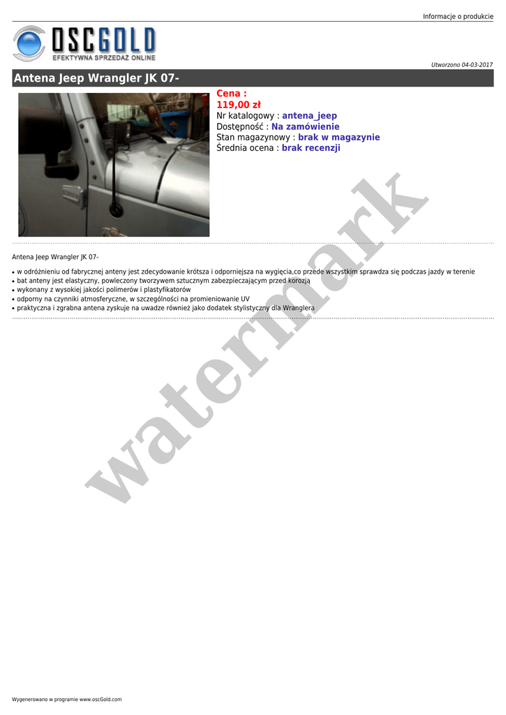 Informacje o produkcie Utworzono 04-03-2017 Antena Jeep Wrangler JK 07Cena : 119,00 zł Antena Jeep Wrangler JK 07● ● ● ● w odróżnieniu od fabrycznej anteny jest zdecydowanie krótsza i odporniejsza na wygięcia,co przede wszystkim sprawdza się podczas jazdy w terenie bat anteny jest elastyczny, powleczony tworzywem sztucznym zabezpieczającym przed korozją wykonany z wysokiej jakości polimerów i plastyfikatorów odporny na czynniki atmosferyczne, w szczególności na promieniowanie UV praktyczna i zgrabna antena zyskuje na uwadze również jako dodatek stylistyczny dla Wranglera w at ● er m ar k Nr katalogowy : antena_jeep Dostępność : Na zamówienie Stan magazynowy : brak w magazynie Średnia ocena : brak recenzji Wygenerowano w programie www.oscGold.com