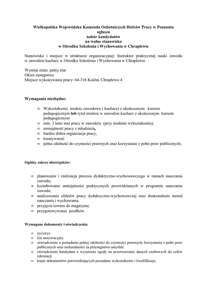 Wielkopolska Wojewódzka Komenda Ochotniczych Hufców Pracy w Poznaniu ogłasza nabór kandydatów na wolne stanowisko w Ośrodku Szkolenia i Wychowania w Chraplewie Stanowisko i miejsce w strukturze organizacyjnej: Instruktor praktycznej nauki zawodu w zawodzie kucharz w Ośrodku Szkolenia i Wychowania w Chraplewie Wymiar etatu: pełny etat Okres zastępstwa Miejsce wykonywania pracy: 64-316 Kuślin, Chraplewo 4 Wymagania niezbędne: • • • • • • Wykształcenie średnie zawodowe ( kucharz) z ukończonym kursem pedagogicznym lub tytuł mistrza w zawodzie kucharz z ukończonym kursem pedagogicznym min. 3 letni staż pracy w zawodzie (przy średnim wykształceniu), umiejętność pracy z młodzieżą, bardzo dobra organizacja pracy, kreatywność pełna zdolność do czynności prawnych oraz korzystanie z pełni praw publicznych; Ogólny zakres obowiązków: • • • • • planowanie i realizacja procesu dydaktyczno-wychowawczego w ramach nauczania zawodu; kształtowanie umiejętności praktycznych przewidzianych w programie nauczania zawodu; analizowanie efektów pracy dydaktyczno-wychowawczej oraz doskonalenie metod nauczania i wychowania; przyjęcie towaru do magazynu; przygotowywanie posiłków Wymagane dokumenty i oświadczenia: • • • • • życiorys list motywacyjny oświadczenie o posiadaniu pełnej zdolności do czynności prawnych, korzystaniu z pełni praw publicznych oraz niekaralności za przestępstwa umyślne oświadczenie kandydata o wyrażeniu zgody na przetwarzanie danych osobowych do celów rekrutacji kopie dokumentów potwierdzających posiadane wykształcenie i kwalifikacje, • kopie dokumentów potwierdzających doświadczenie zawodowe (świadectwa pracy, zaświadczenia o zatrudnieniu ) Prosimy o przesyłanie ofert na adres: Wielkopolska Wojewódzka Komenda OHP 61-485 Poznań, ul. 28 Czerwca 1956 roku nr 211, osobiście w Sekretariacie Wielkopolskiej Wojewódzkiej Komendy OHP lub na adres: [email protected] z podaniem w ofercie nr 47/16 Aplikacje należy składać do dnia 14.10. 2016 roku Dodatkowe informacje: Do składania ofert zachęcamy również osoby niepełnosprawne. Aplikacje otrzymane po terminie (decyduje data stempla pocztowego) nie zawierające numeru ogłoszenie nie będą rozpatrywane Kontaktować będziemy się tylko z kandydatami spełniającymi wymagania formalne Informacje o wynikach naboru będą umieszczone na stronie internetowej BIP Dodatkowe informacje można uzyskać pod nr tel 61-831-24-79 Rozmowy kwalifikacyjne odbywają się w siedzibie WWK OHP w Poznaniu. Michał Tadeusz Comba Wojewódzki Komendant WWK OHP