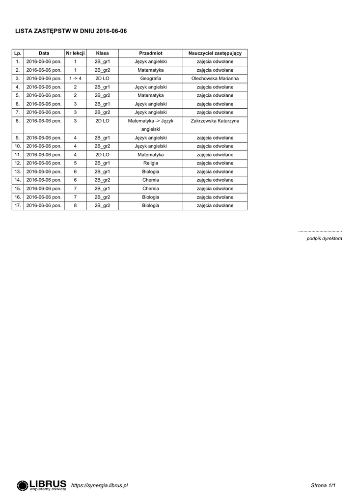 LISTA ZASTĘPSTW W DNIU 2016-06-06 Lp. Data Nr lekcji Klasa Przedmiot Nauczyciel zastępujący 1. 2016-06-06 pon. 1 2B_gr1 Język angielski zajęcia odwołane 2. 2016-06-06 pon. 1 2B_gr2 Matematyka zajęcia odwołane 3. 2016-06-06 pon. 1 -> 4 2D LO Geografia Olechowska Marianna 4. 2016-06-06 pon. 2 2B_gr1 Język angielski zajęcia odwołane 5. 2016-06-06 pon. 2 2B_gr2 Matematyka zajęcia odwołane 6. 2016-06-06 pon. 3 2B_gr1 Język angielski zajęcia odwołane 7. 2016-06-06 pon. 3 2B_gr2 Język angielski zajęcia odwołane 8. 2016-06-06 pon. 3 2D LO Matematyka -> Język Zakrzewska Katarzyna angielski 9. 2016-06-06 pon. 4 2B_gr1 Język angielski zajęcia odwołane 10. 2016-06-06 pon. 4 2B_gr2 Język angielski zajęcia odwołane 11. 2016-06-06 pon. 4 2D LO Matematyka zajęcia odwołane 12. 2016-06-06 pon. 5 2B_gr1 Religia zajęcia odwołane 13. 2016-06-06 pon. 6 2B_gr1 Biologia zajęcia odwołane 14. 2016-06-06 pon. 6 2B_gr2 Chemia zajęcia odwołane 15. 2016-06-06 pon. 7 2B_gr1 Chemia zajęcia odwołane 16. 2016-06-06 pon. 7 2B_gr2 Biologia zajęcia odwołane 17. 2016-06-06 pon. 8 2B_gr2 Biologia zajęcia odwołane ................................. podpis dyrektora https://synergia.librus.pl Strona 1/1