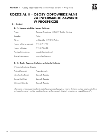 Rozdział II – Osoby odpowiedzialne za informacje zawarte w Prospekcie ROZDZIAŁ II – OSOBY ODPOWIEDZIALNE ZA INFORMACJE ZAWARTE W PROSPEKCIE 2.1. Emitent 2.1.1. Nazwa, siedziba i adres Emitenta Firma: Zakłady Chemiczne „POLICE” Spółka Akcyjna Siedziba: Police Adres: ul. Kuźnicka 1 72-010 Police Numer telefonu: centrala (91) 317 17 17 Numer telefaksu: (91) 317 36 03 Poczta elektroniczna: [email protected] Strona internetowa: www.zchpolice.com 2.1.2. Osoby fizyczne działające w imieniu Emitenta W imieniu Emitenta działają: Andrzej Kurowski Prezes Zarządu Mirosław Bachórski Członek Zarządu Janusz Motyliński Członek Zarządu Wojciech Kolenda Członek Zarządu Informacja o miejscu zamieszkania osób fizycznych działających w imieniu Emitenta została objęta wnioskiem o niepublikowanie i została przedstawiona w „Informacjach objętych wnioskiem o niepublikowanie”. 26 Rozdział II – Osoby odpowiedzialne za informacje zawarte w Prospekcie 2.1.3. Oświadczenie Emitenta My niżej podpisani oświadczamy, że informacje zawarte w Prospekcie są prawdziwe, rzetelne i nie pomijają żadnych faktów ani okoliczności, których ujawnienie w Prospekcie jest wymagane przepisami prawa, a także że zgodnie z naszą najlepszą wiedzą, nie istnieją, poza ujawnionymi w Prospekcie, istotne zobowiązania Emitenta ani okoliczności, które mogłyby wywrzeć znaczący wpływ na sytuację prawną, majątkową i finansową Emitenta oraz osiągane przez niego wyniki finansowe. ……………………………… ……………………………… Andrzej Kurowski Mirosław Bachórski ……………………………… ……………………………… Janusz Motyliński Wojciech Kolenda 2.1.4. Oświadczenie Emitenta My niżej podpisani oświadczamy, że wedle naszej najlepszej wiedzy sprawozdanie finansowe oraz dane porównywalne, zamieszczone w Prospekcie, sporządzone zostały zgodnie z obowiązującymi zasadami rachunkowości oraz że odzwierciedlają w sposób prawdziwy, rzetelny i jasny sytuację majątkową i finansową oraz wynik finansowy Emitenta. ……………………………… ……………………………… Andrzej Kurowski Mirosław Bachórski ……………………………… ……………………………… Janusz Motyliński Wojciech Kolenda 2.1.5. Oświadczenie Emitenta My niżej podpisani oświadczamy, że podmiot uprawniony do badania sprawozdań finansowych, w tym będących podstawą sporządzenia danych porównywalnych, zamieszczonych w prospekcie, został wybrany zgodnie z przepisami prawa oraz że podmiot ten oraz rewidenci dokonujący badania spełniali warunki do wyrażenia bezstronnej i niezależnej opinii o badaniu, zgodnie z właściwymi przepisami prawa krajowego. ……………………………… ……………………………… Andrzej Kurowski Mirosław Bachórski ……………………………… ……………………………… Janusz Motyliński Wojciech Kolenda 27 Rozdział II – Osoby odpowiedzialne za informacje zawarte w Prospekcie 2.2. Wprowadzający i Podmiot Dominujący 2.2.1. Wprowadzający Wymóg wprowadzenia informacji o Wprowadzającym papiery wartościowe do publicznego obrotu nie ma zastosowania (brak wprowadzającego papiery wartościowe do publicznego obrotu w rozumieniu art. 4 pkt 5 ustawy Prawo o Publicznym Obrocie Papierami Wartościowymi). 2.2.2. Podmiot Dominujący 2.2.2.1. Nazwa, siedziba i adres Podmiotu Dominującego Nazwa (firma): Skarb Państwa Rzeczypospolitej Polskiej reprezentowany przez Ministra Skarbu Państwa Siedziba: Warszawa Adres: ul. Krucza 36/ Wspólna 6 00-522 Warszawa Numer telefonu: centrala (22) 695 80 00 (22) 695 90 00 Numer telefaksu: (22) 628 08 72 (22) 621 33 61 Poczta elektroniczna: [email protected] Strona internetowa: www.msp.gov.pl 2.2.2.2. Osoby fizyczne działające w imieniu Podmiotu Dominującego W imieniu Podmiotu Dominującego działa: Jacek Socha – Minister Skarbu Państwa Informacja o miejscu zamieszkania osoby fizycznej działającej w imieniu Podmiotu Dominującego została objęta wnioskiem o niepublikowanie i została przedstawiona w „Informacjach objętych wnioskiem o niepublikowanie”. 2.2.2.3. Opis powiązań Podmiotu Dominującego oraz osób fizycznych działających w imieniu Podmiotu Dominującego z Emitentem Poza opisanymi w niniejszym Prospekcie Emisyjnym pomiędzy Podmiotem Dominującym i osobą działającą w jego imieniu a Emitentem nie występują żadne inne powiązania umowne, kapitałowe i personalne. 2.2.2.4. Oświadczenie o odpowiedzialności osoby wymienionej w pkt 2.2.2.2. Niniejszym oświadczam, że informacje zawarte w Prospekcie dotyczące Podmiotu Dominującego są prawdziwe, rzetelne i nie pomijają żadnych faktów ani okoliczności, których ujawnienie w Prospekcie jest wymagane przepisami prawa. ……………………………… Jacek Socha – Minister Skarbu Państwa 28 Rozdział II – Osoby odpowiedzialne za informacje zawarte w Prospekcie 2.3. Podmioty sporządzające Prospekt 2.3.1. Emitent 2.3.1.1. Nazwa, siedziba i adres Emitenta Firma: Zakłady Chemiczne „POLICE” Spółka Akcyjna Siedziba: Police Adres: ul. Kuźnicka 1 72-010 Police Numer telefonu: (91) 317 17 17 Numer telefaksu: (91) 317 36 03 Poczta elektroniczna: [email protected] Strona internetowa: www.zchpolice.com 2.3.1.2. Osoby fizyczne działające w imieniu Emitenta W imieniu Emitenta działają: Andrzej Kurowski Mirosław Bachórski Janusz Motyliński Wojciech Kolenda Prezes Zarządu Członek Zarządu Członek Zarządu Członek Zarządu Informacja o miejscu zamieszkania osób fizycznych działających w imieniu Emitenta została objęta wnioskiem o niepublikowanie i została przedstawiona w „Informacjach objętych wnioskiem o niepublikowanie”. Emitent odpowiada za wszystkie informacje zawarte w Prospekcie oraz za sporządzenie Rozdziału II (punkty 2.1 i 2.3.1.) oraz Rozdziału IX niniejszego Prospektu. 2.3.1.3. Powiązania sporządz