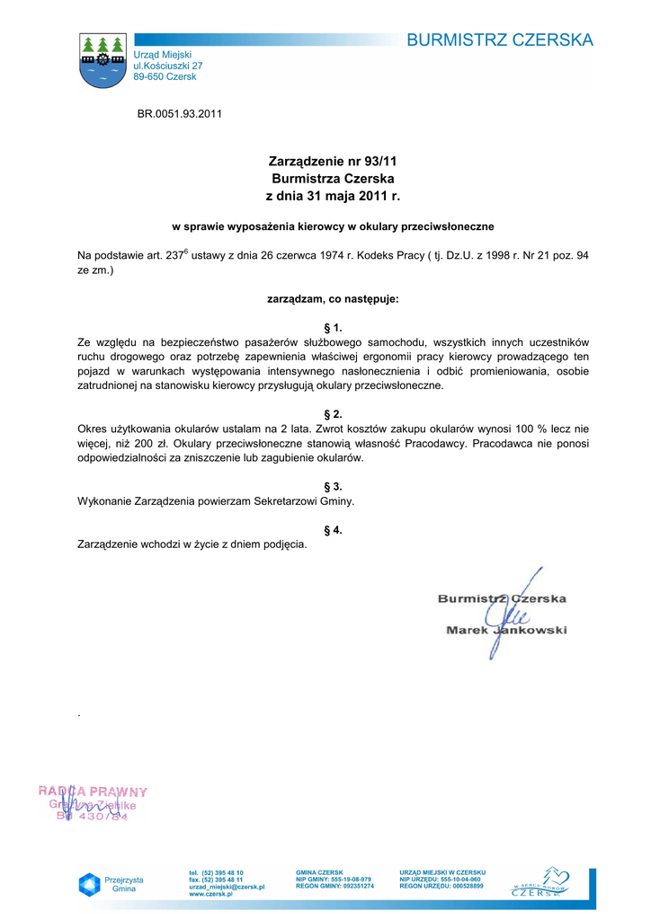 BR.0051.93.2011 Zarządzenie nr 93/11 Burmistrza Czerska z dnia 31 maja 2011 r. w sprawie wyposaŜenia kierowcy w okulary przeciwsłoneczne 6 Na podstawie art. 237 ustawy z dnia 26 czerwca 1974 r. Kodeks Pracy ( tj. Dz.U. z 1998 r. Nr 21 poz. 94 ze zm.) zarządzam, co następuje: § 1. Ze względu na bezpieczeństwo pasaŜerów słuŜbowego samochodu, wszystkich innych uczestników ruchu drogowego oraz potrzebę zapewnienia właściwej ergonomii pracy kierowcy prowadzącego ten pojazd w warunkach występowania intensywnego nasłonecznienia i odbić promieniowania, osobie zatrudnionej na stanowisku kierowcy przysługują okulary przeciwsłoneczne. § 2. Okres uŜytkowania okularów ustalam na 2 lata. Zwrot kosztów zakupu okularów wynosi 100 % lecz nie więcej, niŜ 200 zł. Okulary przeciwsłoneczne stanowią własność Pracodawcy. Pracodawca nie ponosi odpowiedzialności za zniszczenie lub zagubienie okularów. § 3. Wykonanie Zarządzenia powierzam Sekretarzowi Gminy. § 4. Zarządzenie wchodzi w Ŝycie z dniem podjęcia. .