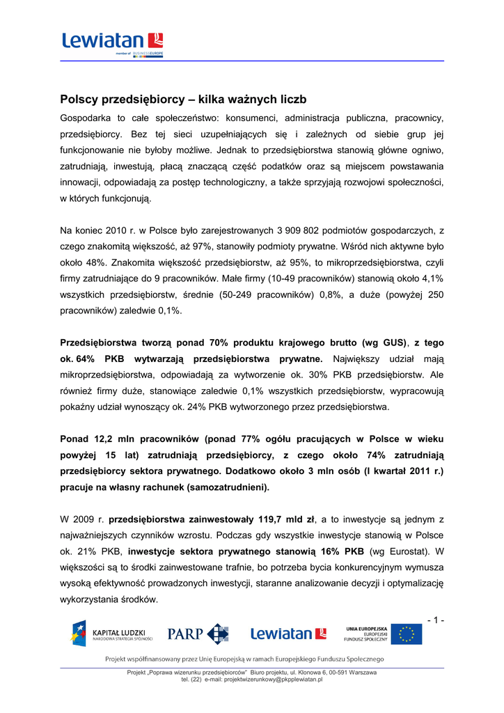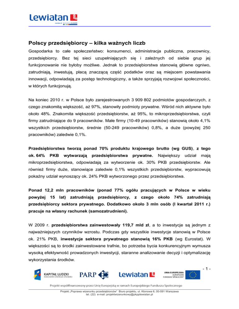 Polscy przedsiębiorcy – kilka ważnych liczb Gospodarka to całe społeczeństwo: konsumenci, administracja publiczna, pracownicy, przedsiębiorcy. Bez tej sieci uzupełniających się i zależnych od siebie grup jej funkcjonowanie nie byłoby możliwe. Jednak to przedsiębiorstwa stanowią główne ogniwo, zatrudniają, inwestują, płacą znaczącą część podatków oraz są miejscem powstawania innowacji, odpowiadają za postęp technologiczny, a także sprzyjają rozwojowi społeczności, w których funkcjonują. Na koniec 2010 r. w Polsce było zarejestrowanych 3 909 802 podmiotów gospodarczych, z czego znakomitą większość, aż 97%, stanowiły podmioty prywatne. Wśród nich aktywne było około 48%. Znakomita większość przedsiębiorstw, aż 95%, to mikroprzedsiębiorstwa, czyli firmy zatrudniające do 9 pracowników. Małe firmy (10-49 pracowników) stanowią około 4,1% wszystkich przedsiębiorstw, średnie (50-249 pracowników) 0,8%, a duże (powyżej 250 pracowników) zaledwie 0,1%. Przedsiębiorstwa tworzą ponad 70% produktu krajowego brutto (wg GUS), z tego ok. 64% PKB wytwarzają przedsiębiorstwa prywatne. Największy udział mają mikroprzedsiębiorstwa, odpowiadają za wytworzenie ok. 30% PKB przedsiębiorstw. Ale również firmy duże, stanowiące zaledwie 0,1% wszystkich przedsiębiorstw, wypracowują pokaźny udział wynoszący ok. 24% PKB wytworzonego przez przedsiębiorstwa. Ponad 12,2 mln pracowników (ponad 77% ogółu pracujących w Polsce w wieku powyżej 15 lat) zatrudniają przedsiębiorcy, z czego około 74% zatrudniają przedsiębiorcy sektora prywatnego. Dodatkowo około 3 mln osób (I kwartał 2011 r.) pracuje na własny rachunek (samozatrudnieni). W 2009 r. przedsiębiorstwa zainwestowały 119,7 mld zł, a to inwestycje są jednym z najważniejszych czynników wzrostu. Podczas gdy wszystkie inwestycje stanowią w Polsce ok. 21% PKB, inwestycje sektora prywatnego stanowią 16% PKB (wg Eurostat). W większości są to środki zainwestowane trafnie, bo potrzeba bycia konkurencyjnym wymusza wysoką efektywność prowadzonych inwestycji, staranne analizowanie decyzji i optymalizację wykorzystania środków. -1- Projekt „Poprawa wizerunku przedsiębiorców” Biuro projektu, ul. Klonowa 6, 00-591 Warszawa tel. (22) e-mail: [email protected] Przedsiębiorcy są także bardzo ważnym elementem systemu podatkowego. W 2010 r. przedsiębiorstwa mające osobowość prawną wpłaciły do budżetu państwa blisko 27,9 mld zł podatku dochodowego od osób prawnych (CIT), a przedsiębiorcy prowadzący działalność nie posiadającą osobowości prawnej (prowadzący pozarolniczą działalność gospodarczą) ponad 24,4 mld zł podatku od dochodów osób fizycznych (PIT), co razem stanowi około 20% wszystkich wpływów do budżetu państwa z tytułu podatków. Przedsiębiorstwa odpowiadają także za odprowadzanie do budżetu podatku od towarów i usług (VAT), podatku akcyzowego, płacą część składki na ubezpieczenie pracownika oraz odpowiadają za odprowadzenie składki płaconej przez ich pracowników. Bardzo istotnym czynnikiem rozwoju są innowacje – czyli wdrożenia nowych produktów, procesów, metod marketingowych lub organizacyjnych. To właśnie w przedsiębiorstwach powstaje większość innowacji. Wynalazki są często opracowywane przez instytucje naukowo-badawcze i wyższe uczelnie, jednak w znakomitej większości to przedsiębiorstwa odpowiadają za ich wdrożenie – za to, że te nowe rozwiązania będą mogły faktycznie zaistnieć i być wykorzystywane. Wiele przedsiębiorstw, szczególnie w branżach o szybkim rozwoju technologii, jak np. farmacja oraz informacja i telekomunikacja, prowadzi własne działy badań i rozwoju. Niestety w Polsce mamy ciągle bardzo niskie nakłady na badania i rozwój, które stanowią jedynie 0,7% PKB (według szacunków Eurostat w całej UE udział ten wynosi średnio ok. 2% PKB). Dodatkowo nieproporcjonalnie niższe są nakłady na B+R sektora prywatnego, które stanowią mniej niż jedną trzecią wszystkich nakładów w Polsce (dla krajów UE średnio dwie trzecie nakładów na B+R pochodzi z sektora prywatnego). Także jeśli chodzi o liczbę międzynarodowych patentów Polska nie ma się czym pochwalić podmioty z Polski złożyły w 2008 r. 6 wniosków patentowych do Europejskiego Urzędu Patentowego, podczas gdy przeciętnie podmioty z krajów UE złożyły 120 wniosków (liczby wniosków w przeliczeniu na milion mieszkańców, wg Eurostat). Zatem w dziedzinie innowacyjności polscy przedsiębiorcy mają jeszcze bardzo wiele do zrobienia i w dużej mierze to właśnie od nich będzie zależało czy polska gospodarka stanie się prawdziwie innowacyjną gospodarką opartą na wiedzy. Przedsiębiorcy są także motorem rozwoju kapitału ludzkiego. Dzięki oferowanym przez nich szkoleniom i programom rozwojowym, pracownicy lepiej adaptują się do bardzo szybko zmieniających się warunków rynkowych i poprawiają swoją konkurencyjność. Działania -2- Projekt „Poprawa wizerunku przedsiębiorców” Biuro projektu, ul. Klonowa 6, 00-591 Warszawa tel. (22) e-mail: [email protected] pracodawców mają także wpływ na budowanie kapitału społecznego. Rozwój społecznej odpowiedzialności biznesu (CSR) nie są jeszcze stosowane w Polsce w sposób zaplanowany przez większość firm, jednak obserwujemy zdecydowany wzrost zainteresowania przedsiębiorców tymi działaniami. Stają się one koniecznym elementem funkcjonowania organizacji np. już 58% spółek twierdzi, że podejmuje działania, które są przejawem ich społecznego zaangażowania. Wzrost gospodarczy i materialne funkcjonowanie całego społeczeństwa zależą od kondycji przedsiębiorstw i od decyzji biznesowych podejmowanych przez przedsiębiorców. Niezwykle istotne jest zatem zachowanie dobrej kondycji sektora przedsiębiorstw, szczególnie w okresie kryzysu gospodarczego. Według danych GUS rentowność netto przedsiębiors