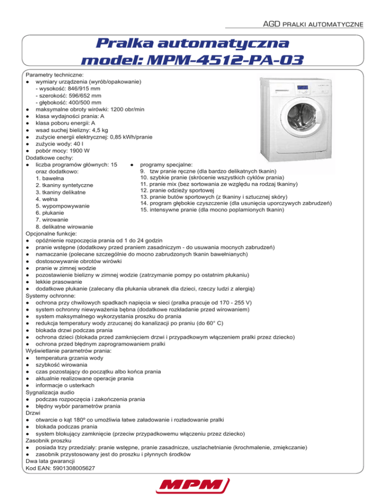 Pralka automatyczna model: MPM-4512-PA-03