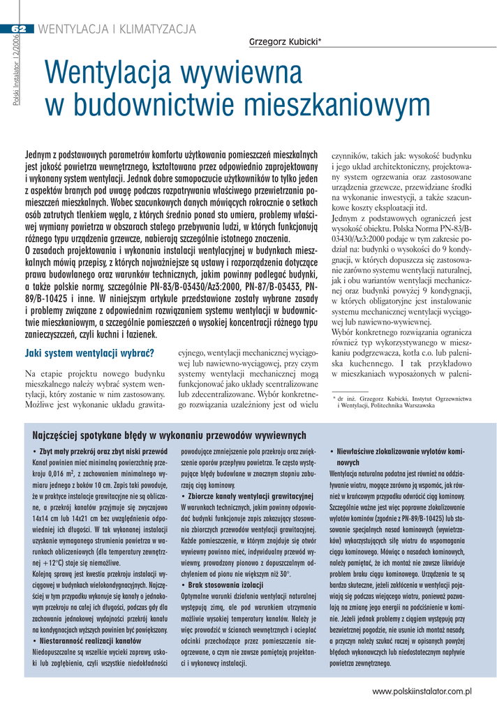 Polski Instalator 12/2006 62 WENTYLACJA I KLIMATYZACJA Grzegorz Kubicki* Wentylacja wywiewna w budownictwie mieszkaniowym Jednym z podstawowych parametrów komfortu u¿ytkowania pomieszczeñ mieszkalnych jest jakoœæ powietrza wewnêtrznego, kszta³towana przez odpowiednio zaprojektowany i wykonany system wentylacji. Jednak dobre samopoczucie u¿ytkowników to tylko jeden z aspektów branych pod uwagê podczas rozpatrywania w³aœciwego przewietrzania pomieszczeñ mieszkalnych. Wobec szacunkowych danych mówi¹cych rokrocznie o setkach osób zatrutych tlenkiem wêgla, z których œrednio ponad sto umiera, problemy w³aœciwej wymiany powietrza w obszarach sta³ego przebywania ludzi, w których funkcjonuj¹ ró¿nego typu urz¹dzenia grzewcze, nabieraj¹ szczególnie istotnego znaczenia. O zasadach projektowania i wykonania instalacji wentylacyjnej w budynkach mieszkalnych mówi¹ przepisy, z których najwa¿niejsze s¹ ustawy i rozporz¹dzenia dotycz¹ce prawa budowlanego oraz warunków technicznych, jakim powinny podlegaæ budynki, a tak¿e polskie normy, szczególnie PN-83/B-03430/Az3:2000, PN-87/B-03433, PN89/B-10425 i inne. W niniejszym artykule przedstawione zosta³y wybrane zasady i problemy zwi¹zane z odpowiednim rozwi¹zaniem systemu wentylacji w budownictwie mieszkaniowym, a szczególnie pomieszczeñ o wysokiej koncentracji ró¿nego typu zanieczyszczeñ, czyli kuchni i ³azienek. Jaki system wentylacji wybraæ? Na etapie projektu nowego budynku mieszkalnego nale¿y wybraæ system wentylacji, który zostanie w nim zastosowany. Mo¿liwe jest wykonanie uk³adu grawita- cyjnego, wentylacji mechanicznej wyci¹gowej lub nawiewno-wyci¹gowej, przy czym systemy wentylacji mechanicznej mog¹ funkcjonowaæ jako uk³ady scentralizowane lub zdecentralizowane. Wybór konkretnego rozwi¹zania uzale¿niony jest od wielu czynników, takich jak: wysokoœæ budynku i jego uk³ad architektoniczny, projektowany system ogrzewania oraz zastosowane urz¹dzenia grzewcze, przewidziane œrodki na wykonanie inwestycji, a tak¿e szacunkowe koszty eksploatacji itd. Jednym z podstawowych ograniczeñ jest wysokoœæ obiektu. Polska Norma PN-83/B03430/Az3:2000 podaje w tym zakresie podzia³ na: budynki o wysokoœci do 9 kondygnacji, w których dopuszcza siê zastosowanie zarówno systemu wentylacji naturalnej, jak i obu wariantów wentylacji mechanicznej oraz budynki powy¿ej 9 kondygnacji, w których obligatoryjne jest instalowanie systemu mechanicznej wentylacji wyci¹gowej lub nawiewno-wywiewnej. Wybór konkretnego rozwi¹zania ogranicza równie¿ typ wykorzystywanego w mieszkaniu podgrzewacza, kot³a c.o. lub paleniska kuchennego. I tak przyk³adowo w mieszkaniach wyposa¿onych w paleni* dr in¿. Grzegorz Kubicki, Instytut Ogrzewnictwa i Wentylacji, Politechnika Warszawska Najczêœciej spotykane b³êdy w wykonaniu przewodów wywiewnych • Zbyt ma³y przekrój oraz zbyt niski przewód Kana³ powinien mieæ minimaln¹ powierzchniê przekroju 0,016 m2, z zachowaniem minimalnego wymiaru jednego z boków 10 cm. Zapis taki powoduje, ¿e w praktyce instalacje grawitacyjne nie s¹ obliczane, a przekrój kana³ów przyjmuje siê zwyczajowo 14x14 cm lub 14x21 cm bez uwzglêdnienia odpowiedniej ich d³ugoœci. W tak wykonanej instalacji uzyskanie wymaganego strumienia powietrza w warunkach obliczeniowych (dla temperatury zewnêtrznej +12°C) staje siê niemo¿liwe. Kolejn¹ spraw¹ jest kwestia przekroju instalacji wyci¹gowej w budynkach wielokondygnacyjnych. Najczêœciej w tym przypadku wykonuje siê kana³y o jednakowym przekroju na ca³ej ich d³ugoœci, podczas gdy dla zachowania jednakowej wydajnoœci przekrój kana³u na kondygnacjach wy¿szych powinien byæ powiêkszony. • Niestarannoœæ realizacji kana³ów Niedopuszczalne s¹ wszelkie wycieki zaprawy, uskoki lub zag³êbienia, czyli wszystkie niedok³adnoœci powoduj¹ce zmniejszenie pola przekroju oraz zwiêkszenie oporów przep³ywu powietrza. Te czêsto wystêpuj¹ce b³êdy budowlane w znacznym stopniu zaburzaj¹ ci¹g kominowy. • Zbiorcze kana³y wentylacji grawitacyjnej W warunkach technicznych, jakim powinny odpowiadaæ budynki funkcjonuje zapis zakazuj¹cy stosowania zbiorczych przewodów wentylacji grawitacyjnej. Ka¿de pomieszczenie, w którym znajduje siê otwór wywiewny powinno mieæ, indywidualny przewód wywiewny, prowadzony pionowo z dopuszczalnym odchyleniem od pionu nie wiêkszym ni¿ 30°. • Brak stosowania izolacji Optymalne warunki dzia³ania wentylacji naturalnej wystêpuj¹ zim¹, ale pod warunkiem utrzymania mo¿liwie wysokiej temperatury kana³ów. Nale¿y je wiêc prowadziæ w œcianach wewnêtrznych i ocieplaæ odcinki przechodz¹ce przez pomieszczenia nieogrzewane, o czym nie zawsze pamiêtaj¹ projektanci i wykonawcy instalacji. • Niew³aœciwe zlokalizowanie wylotów kominowych Wentylacja naturalna podatna jest równie¿ na oddzia³ywanie wiatru, mog¹ce zarówno j¹ wspomóc, jak równie¿ w krañcowym przypadku odwróciæ ci¹g kominowy. Szczególnie wa¿ne jest wiêc poprawne zlokalizowanie wylotów kominów (zgodnie z PN-89/B-10425) lub stosowanie specjalnych nasad kominowych (wywietrzaków) wykorzystuj¹cych si³ê wiatru do wspomagania ci¹gu kominowego. Mówi¹c o nasadach kominowych, nale¿y pamiêtaæ, ¿e ich monta¿ nie zawsze likwiduje problem braku ci¹gu kominowego. Urz¹dzenia te s¹ bardzo skuteczne, je¿eli zak³ócenia w wentylacji pojawiaj¹ siê podczas wiej¹cego wiatru, poniewa¿ pozwalaj¹ na zmianê jego energii na podciœnienie w kominie. Je¿eli jednak problemy z ci¹giem wystêpuj¹ przy bezwietrznej pogodzie, nie usunie ich monta¿ nasady, a przyczyn nale¿y szukaæ raczej w opisanych powy¿ej b³êdach wykonawczych lub niedostatecznym nap³ywie powietrza zewnêtrznego. www.polskiinstalator.com.pl noœæ, poziom emitowanego ha³asu oraz mo¿liwoœci jego ograniczenia itd. W pewnym uproszczeniu zestawienie tych czynników przedstawione zosta³o w tabeli 1. Wentylacja grawitacyjna Przyk