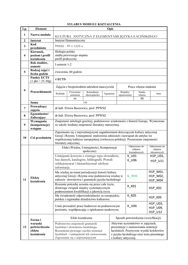 Lp. Element 1 Nazwa modułu 2 Instytut Kod przedmiotu Kierunek, poziom i profil kształcenia Rok studiów, semestr Rodzaj zajęć i liczba godzin Punkty ECTS (1 pkt = 25-30g) 3 4 5 SYLABUS MODUŁU KSZTAŁCENIA Opis KULTURA ANTYCZNA Z ELEMENTAMI JĘZYKA ŁACIŃSKIEGO Instytut Humanistyczny PPWSZ - FP-1-1225-s filologia polska studia pierwszego stopnia profil praktyczny I semestr 1-2 ćwiczenia, 60 godzin 4 ECTS Zajęcia z bezpośrednim udziałem nauczyciela 6 7 8 9 10 Pracochłonność Suma Prowadzący zajęcia Egzaminator/ Zaliczający Wymagania (kompetencje) wstępne Cel przedmiotu Wykłady Ćwiczenia/ seminaria 60 Konsultacje obowiązkowe Egzaminy Praca własna studenta Projekty/ opracowania Efekty kształcenia 50 dr hab. Elwira Buszewicz, prof. PPWSZ dr hab. Elwira Buszewicz, prof. PPWSZ Znajomość mitologii greckiej, podstawowe wiadomości z historii Europy. Wyniesiona ze szkoły średniej znajomość literatury starożytnej. Zapoznanie się z najważniejszymi zagadnieniami dotyczącymi kultury antycznej Grecji i Rzymu. Umiejętność znalezienia odniesień i nawiązań do antyku we współczesnej kulturze europejskiej (zwłaszcza polskiej). Poszerzenie znajomości literatury antycznej. Odniesienie do Odniesienie do Efekt (Wiedza, Umiejętności, Kompetencje efektów efektów społeczne) kierunkowych obszarowych Ma wiedzę na temat periodyzacji historii kultury antycznej Grecji i Rzymu oraz podstawową wiedzę w zakresie słownictwa i gramatyki języka łacińskiego Rozumie potrzebę uczenia się przez całe życie, dostrzega związek między systematycznym podnoszeniem kwalifikacji a jakością życia. Ma świadomość odpowiedzialności za europejskie, polskie i regionalne dziedzictwo kulturowe. Umie prowadzić prace badawcze na podstawowym poziomie, współpracując z opiekunem naukowym. 12 Forma i warunki potwierdzenia efektu kształcenia Inne 110 Umiejętnie korzysta z różnego typu słowników, baz danych, katalogów, bibliografii. Potrafi selekcjonować i hierarchizować zdobyte informacje. 11 Nauka własna K_U01 K_U06 H1P_U01, H1P_U11 K_W04 H1P_W01, H1P_W02, H1P_W04 K_K01 K_K05 K_U04 H1P_K01 H1P_K05 H1P_U03, H1P_U09, H1P_U12 Efekt kształcenia Sposób potwierdzenia (weryfikacji) Podstawowa znajomość gramatyki łacińskiej i słownictwa łacińskiego. Rozumienie pewnego zasobu sentencji łacińskich i umiejętność ich zastosowania. Zapoznanie się z najważniejszymi Aktywne uczestnictwo w zajęciach, prezentacje z zastosowania sentencji łacińskich. Pozytywne wyniki kolokwiów z języka łacińskiego oraz testu pisemnego z kultury antycznej. 13 Treści merytoryczne przedmiotu 14 Wykaz literatury podstawowej 15 Wykaz literatury uzupełniającej (pomocniczej) zagadnieniami dotyczącymi kultury antycznej Grecji i Rzymu. Umiejętność znalezienia odniesień i nawiązań do antyku we współczesnej kulturze europejskiej. Świadomość wkładu starożytności w funkcjonujące dzisiaj mechanizmy społeczne, polityczne i kulturowe. Umiejętność chronologizacji literatury antycznej. 1. Rola kultury antycznej dzisiaj. Najstarsze kultury europejskie: Kultura minojska, kultura mykeńska. 2. Wieki Ciemne w Grecji. Igrzyska Olimpijskie, wyrocznia w Delfach, Homer i jego dzieła. 3. Epoka archaiczna- najważniejsze wydarzenia historyczne. Architektura, rzeźba, ceramika. Literatura: Hezjod, liryka jońska. 4. Epoka klasyczna- najważniejsze wydarzenia historyczne. Sztuka epoki archaicznej (rzeźba, ceramika). Powstanie teatru. Tragedia i komedia grecka. 5. Epoka hellenistyczna- najważniejsze wydarzenia historyczne. Sztuka epoki hellenistycznej. Osiągnięcia naukowe. 6. Etruskowie i rzymska epoka królewska- najważniejsze wydarzenia historyczne. Religia rzymska. 7. Epoka republiki (literacka epoka archaiczna)- najważniejsze wydarzenia historyczne. Komedia nowa. Rzymski kalendarz. 8. Schyłek epoki republiki i epoka cycerońska w literaturze. Cyceron, Cezar i poezja neoterycka. Najważniejsze wydarzenia historyczne tego okresu- przemiany ustrojowe. 9. Epoka augustowska w literaturze. Najważniejsze wydarzenia historyczne tego okresu, założenia polityki Augusta. Mecenat. Wergiliusz, Horacy i Owidiusz. 10. Literacka epoka cesarstwa. Upadek Imperium Romanum. Najważniejsze zjawiska w literaturze tego okresu. Apulejusz i pierwsza powieść. 11. Język łaciński: alfabet, akcent. Zasady czytania. Części mowy i sposoby ich odmiany. 12. Deklinacja I i II, odmiana rzeczowników i przymiotników 13. Koniugacja I-IV, Indicativuspraesentisactiviipassivi 14. Imperfectum, Futurumprimum (ind.act. i pass.). 15. Elementarna wiedza o budowie zdań. Accusativus cum infinitivo. 16. Deklinacja III i jej typy 17. Deklinacja IV i V 18. Stopniowanie przymiotników. Liczebniki. 19. Indicativus perfecti. 20. Coniunctivus – ogólna charakterystyka trybu, przykłady zastosowań K. Kumaniecki „Historia kultury starożytnej Grecji i Rzymu”, M. Cytowska, H. Szelest „Literatura Grecka i Rzymska w zarysie”, „Mała encyklopedia kultury antycznej”- praca zbiorowa, „Słownik cytatów łacińskich. Wyrażenia- sentencje – przysłowia”, oprac. Z. Lewandowski, K. Woś Cz. Jędraszko, „łacina na co dzień” PODRĘCZNIK?????? Ajschylos „Persowie”, Eurypides „Medea”, Arystofanes „Osy”,Liryka starożytnej Grecji”- oprac. J. Danielewicz (wybór wierszy) M.T. Cyceron „Sen Scypiona” w:”O Rzeczpospolitej”, Katullus „Poezje”- wybór wierszy, Marcjalis „Epigramy”, wybór wierszy.