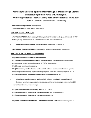 Krotoszyn: Dostawa sprzętu medycznego jednorazowego użytku: anestezjologia dla SPZOZ w Krotoszynie. Numer ogłoszenia: 163552 - 2011; data zamieszczenia: 17.06.2011 OGŁOSZENIE O ZAMÓWIENIU - dostawy Zamieszczanie ogłoszenia: obowiązkowe. Ogłoszenie dotyczy: zamówienia publicznego. SEKCJA I: ZAMAWIAJĄCY I. 1) NAZWA I ADRES: Samodzielny Publiczny Zakład Opieki Zdrowotnej , ul. Młyńska 2, 63-700 Krotoszyn, woj. wielkopolskie, tel. 062 5880390 w. 253, faks 062 5880402. • Adres strony internetowej zamawiającego: www.spzoz.krotoszyn.pl I. 2) RODZAJ ZAMAWIAJĄCEGO: Samodzielny publiczny zakład opieki zdrowotnej. SEKCJA II: PRZEDMIOT ZAMÓWIENIA II.1) OKREŚLENIE PRZEDMIOTU ZAMÓWIENIA II.1.1) Nazwa nadana zamówieniu przez zamawiającego: Dostawa sprzętu medycznego jednorazowego użytku: anestezjologia dla SPZOZ w Krotoszynie.. II.1.2) Rodzaj zamówienia: dostawy. II.1.3) Określenie przedmiotu oraz wielkości lub zakresu zamówienia: Dostawa sprzętu medycznego jednorazowego użytku: anestezjologia dla SPZOZ w Krotoszynie pakiet nr 1-5.. II.1.4) Czy przewiduje się udzielenie zamówień uzupełniających: tak. • Określenie przedmiotu oraz wielkości lub zakresu zamówień uzupełniających • Dostawa sprzętu medycznego jednorazowego użytku: anestezjologia, maksymalnie 20% wartości zamówienia podstawowego. II.1.5) Wspólny Słownik Zamówień (CPV): 33.17.11.00-0. II.1.6) Czy dopuszcza się złożenie oferty częściowej: tak, liczba części: 5. II.1.7) Czy dopuszcza się złożenie oferty wariantowej: nie. II.2) CZAS TRWANIA ZAMÓWIENIA LUB TERMIN WYKONANIA: Okres w miesiącach: 12. SEKCJA III: INFORMACJE O CHARAKTERZE PRAWNYM, EKONOMICZNYM, FINANSOWYM I TECHNICZNYM III.1) WADIUM Informacja na temat wadium: nie dotyczy III.2) ZALICZKI • Czy przewiduje się udzielenie zaliczek na poczet wykonania zamówienia: nie III.4) INFORMACJA O OŚWIADCZENIACH LUB DOKUMENTACH, JAKIE MAJĄ DOSTARCZYĆ WYKONAWCY W CELU POTWIERDZENIA SPEŁNIANIA WARUNKÓW UDZIAŁU W POSTĘPOWANIU ORAZ NIEPODLEGANIA WYKLUCZENIU NA PODSTAWIE ART. 24 UST. 1 USTAWY • III.4.1) W zakresie wykazania spełniania przez wykonawcę warunków, o których mowa w art. 22 ust. 1 ustawy, oprócz oświadczenia o spełnieniu warunków udziału w postępowaniu, należy przedłożyć: • III.4.2) W zakresie potwierdzenia niepodlegania wykluczeniu na podstawie art. 24 ust. 1 ustawy, należy przedłożyć: • oświadczenie o braku podstaw do wykluczenia • aktualny odpis z właściwego rejestru, jeżeli odrębne przepisy wymagają wpisu do rejestru, w celu wykazania braku podstaw do wykluczenia w oparciu o art. 24 ust. 1 pkt 2 ustawy, wystawiony nie wcześniej niż 6 miesięcy przed upływem terminu składania wniosków o dopuszczenie do udziału w postępowaniu o udzielenie zamówienia albo składania ofert, a w stosunku do osób fizycznych oświadczenie w zakresie art. 24 ust. 1 pkt 2 ustawy • III.4.3) Dokumenty podmiotów zagranicznych Jeżeli wykonawca ma siedzibę lub miejsce zamieszkania poza terytorium Rzeczypospolitej Polskiej, przedkłada: III.4.3.1) dokument wystawiony w kraju, w którym ma siedzibę lub miejsce zamieszkania potwierdzający, że: • nie otwarto jego likwidacji ani nie ogłoszono upadłości - wystawiony nie wcześniej niż 6 miesięcy przed upływem terminu składania wniosków o dopuszczenie do udziału w postępowaniu o udzielenie zamówienia albo składania ofert III.6) INNE DOKUMENTY Inne dokumenty niewymienione w pkt III.4) albo w pkt III.5) Oferta winna zawierać wszystkie dokumenty i oświadczenia wymienione rozdziale VI niniejszej SIWZ oraz : a) Formularz ofertowy podpisany przez osobę upoważnioną do składania oświadczenia woli w imieniu wykonawcy z wykorzystaniem wzoru - załącznik nr 1. b) Formularz cenowy podpisany przez osobę upoważnioną do składania oświadczenia woli w imieniu wykonawcy z wykorzystaniem wzoru - załącznik nr 2. Do oferty należy dołączyć wypełnione Formularze cenowe również w formie elektronicznej (plik.xls) z niezablokowanymi formułami. Formularze cenowe w formie pliku.xls umieszczone są i dostępne do ściągnięcia na stronie internetowej Zamawiającego www.bip.spzoz.krotoszyn.pl . c) Projekt umowy podpisany przez osobę upoważnioną do składania oświadczenia woli w imieniu wykonawcy z wykorzystaniem wzoru - załącznik nr 4. W przypadku podpisania oferty oraz poświadczenia za zgodność z oryginałem kopii dokumentów przez osobę niewymienioną w dokumencie rejestracyjnym (ewidencyjnym) Wykonawcy, należy do oferty dołączyć stosowne pełnomocnictwo. III.7) Czy ogranicza się możliwość ubiegania się o zamówienie publiczne tylko dla wykonawców, u których ponad 50 % pracowników stanowią osoby niepełnosprawne: nie SEKCJA IV: PROCEDURA IV.1) TRYB UDZIELENIA ZAMÓWIENIA IV.1.1) Tryb udzielenia zamówienia: przetarg nieograniczony. IV.2) KRYTERIA OCENY OFERT IV.2.1) Kryteria oceny ofert: najniższa cena. IV.2.2) Czy przeprowadzona będzie aukcja elektroniczna: nie. IV.3) ZMIANA UMOWY Czy przewiduje się istotne zmiany postanowień zawartej umowy w stosunku do treści oferty, na podstawie której dokonano wyboru wykonawcy: tak Dopuszczalne zmiany postanowień umowy oraz określenie warunków zmian § 6 PROJEKTU UMOWY: 2. Strony ustalają możliwość zmiany cen wynikających z okoliczności, których nie można było przewidzieć w chwili zawarcia niniejszej umowy. Za okoliczność taką uważa się : - zmianę stawek podatku VAT. 3. W przypadku ustawowej zmiany stawki podatku VAT na przedmiot niniejszego zamówienia, jej zmiana następuje z mocy prawa. § 13 PROJEKTU UMOWY:1. Zmiana postanowień zawartej umowy może nastąpić wyłącznie w sytuacji przewidzianej w § 6 umowy oraz w przypadkach wymienionych poniżej, za zgodą obu stron wyrażoną na piśmie, pod rygorem nieważności. 2. Strony dopuszczają zmiany umowy w zakresie: - numeru katalogowego produktu (w tym przypadku zmiana może być dokonana na podstawie pi