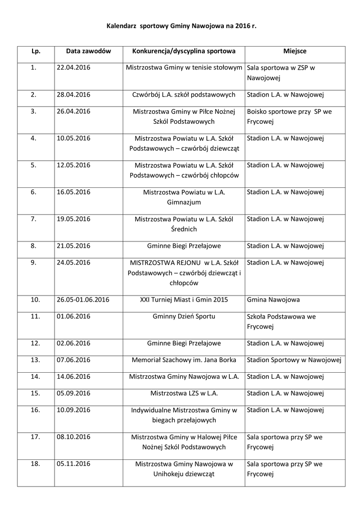 Kalendarz sportowy Gminy Nawojowa na 2016 r. Lp. Data zawodów