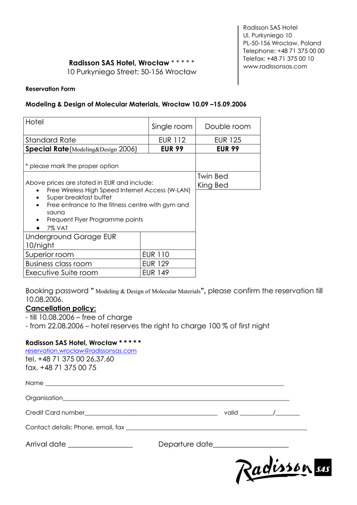 Radisson SAS Hotel Ul. Purkyniego 10 PL-50-156 Wroclaw, Poland Telephone: +48 71 375 00 00 Telefax: +48 71 375 00 10 www.radissonsas.com Radisson SAS Hotel, Wrocław * * * * * 10 Purkyniego Street; 50-156 Wrocław Reservation Form Modeling & Design of Molecular Materials, Wrocław 10.09 –15.09.2006 Hotel Standard Rate Special Rate(Modeling&Design 2006) Single room Double room EUR 112 EUR 99 EUR 125 EUR 99 * please mark the proper option Above prices are stated in EUR and include: • Free Wireless High Speed Internet Access (W-LAN) • Super breakfast buffet • Free entrance to the fitness centre with gym and sauna • Frequent Flyer Programme points • 7% VAT Underground Garage EUR 10/night Superior room Business class room Executive Suite room Twin Bed King Bed EUR 110 EUR 129 EUR 149 Booking password ” Modeling & Design of Molecular Materials”, please confirm the reservation till 10.08.2006. Cancellation policy: - till 10.08.2006 – free of charge - from 22.08.2006 – hotel reserves the right to charge 100 % of first night Radisson SAS Hotel, Wrocław * * * * * [email protected] tel. +48 71 375 00 26,37,60 fax. +48 71 375 00 75 Name _______________________________________________________________________________ Organisation___________________________________________________________________________ Credit Card number____________________________________________ valid ___________/________ Contact details: Phone, email, fax ____________________________________________________________ Arrival date __________________ Departure date_____________________