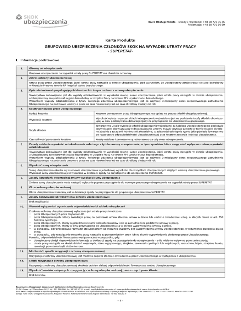 Biuro Obsługi Klienta – szkody i roszczenia: +48 58 770 36 36 Reklamacje: +48 58 770 36 90 Karta Produktu GRUPOWEGO UBEZPIECZENIA CZŁONKÓW SKOK NA WYPADEK UTRATY PRACY - SUPERETATI. Informacje podstawowe 1. Główny cel ubezpieczenia Grupowe ubezpieczenie na wypadek utraty pracy SUPERETAT ma charakter ochronny. 2. Zakres ochrony ubezpieczeniowej Utrata pracy przez Ubezpieczonego, jeżeli utrata pracy nastąpiła w okresie ubezpieczenia, pod warunkiem, że Ubezpieczony zarejestrował się jako bezrobotny w Urzędzie Pracy na terenie RP i uzyskał status bezrobotnego. 3. Opis odszkodowań przysługujących klientowi lub innym osobom z umowy ubezpieczenia Towarzystwo zobowiązane jest do wypłaty odszkodowania w wysokości równej sumie ubezpieczenia, jeżeli utrata pracy nastąpiła w okresie ubezpieczenia, a Ubezpieczony zarejestrował się jako bezrobotny w Urzędzie Pracy na terenie RP i uzyskał status bezrobotnego. Warunkiem wypłaty odszkodowania z tytułu kolejnego zdarzenia ubezpieczeniowego jest co najmniej 3-miesięczny okres nieprzerwanego zatrudnienia Ubezpieczonego na podstawie umowy o pracę na czas nieokreślony lub na czas określony dłuższy niż rok. 4. 5. Koszty ponoszone przez Ubezpieczonego Rodzaj kosztów Kosztem ponoszonym przez Ubezpieczonego jest opłata na poczet składki ubezpieczeniowej. Wysokość kosztów Wysokość opłaty na poczet składki ubezpieczeniowej ustalana jest na podstawie taryfy składek obowiązującej w dniu podpisywania deklaracji zgody na przystąpienie do ubezpieczenia grupowego. Taryfa składek Towarzystwo ustala wysokość składki ubezpieczeniowej należnej za każdego Ubezpieczonego na podstawie taryfy składek obowiązującej w dniu zawierania umowy. Stawki taryfowe zawarte w taryfie składek określono zgodnie z zasadami matematyki aktuarialnej, w zależności od stopnia ryzyka jakie poniesie Towarzystwo po rozpoczęciu odpowiedzialności ubezpieczeniowej oraz kosztów zawarcia i obsługi ubezpieczenia. Częstotliwość ponoszenia kosztów Koszty ustalane i ponoszone są jednorazowo za cały okres ubezpieczenia. Zasady ustalania wysokości odszkodowania należnego z tytułu umowy ubezpieczenia, w tym czynników, które mogą mieć wpływ na zmianę wysokości odszkodowania Towarzystwo zobowiązane jest do wypłaty odszkodowania w wysokości równej sumie ubezpieczenia, jeżeli utrata pracy nastąpiła w okresie ubezpieczenia, a Ubezpieczony zarejestrował się jako bezrobotny w Urzędzie Pracy na terenie RP i uzyskał status bezrobotnego. Warunkiem wypłaty odszkodowania z tytułu kolejnego zdarzenia ubezpieczeniowego jest co najmniej 3-miesięczny okres nieprzerwanego zatrudnienia Ubezpieczonego na podstawie umowy o pracę na czas nieokreślony lub na czas określony dłuższy niż rok. 6. Wysokość sumy ubezpieczenia Sumę ubezpieczenia określa się w umowie ubezpieczenia w jednakowej wysokości dla wszystkich Ubezpieczonych objętych umową ubezpieczenia grupowego. Wysokość sumy ubezpieczenia jest wskazana w deklaracji zgody na przystąpienie do ubezpieczenia SUPERETAT. 7. Zasady i przesłanki ewentualnej zmiany wysokości sumy ubezpieczenia Zmiana sumy ubezpieczenia może nastąpić wyłącznie poprzez przystąpienie do nowego grupowego ubezpieczenia na wypadek utraty pracy SUPERETAT. 8. Okres ochrony ubezpieczeniowej Okres ubezpieczenia wskazany jest w deklaracji zgody na przystąpienie do grupowego ubezpieczenia SUPERETAT. 9. Zasady kontynuacji lub wznowienia ochrony ubezpieczeniowej Brak możliwości. 10. Warunki wyłączenia i ograniczenia odpowiedzialności zakładu ubezpieczeń Z zakresu ochrony ubezpieczeniowej wyłączona jest utrata pracy świadczona: • przez Ubezpieczonych poza terytorium RP, • przez Ubezpieczonych, którzy świadczyli pracę na podstawie umów zlecenia, umów o dzieło lub umów o świadczenie usług, o których mowa w art. 750 Kodeksu cywilnego, • przez Ubezpieczonych, którzy są przedstawicielami wolnych zawodów i nie są zatrudnieni na podstawie umowy o pracę, • przez Ubezpieczonych, którzy w dniu przystąpienia do ubezpieczenia są w okresie wypowiedzenia umowy o pracę, • w przypadku, gdy pracodawca rozwiązał stosunek pracy lub stosunek służbowy bez wypowiedzenia z winy Ubezpieczonego, w rozumieniu przepisów prawa pracy, • w przypadku, gdy rozwiązanie stosunku pracy nastąpiło za porozumieniem stron lub na skutek wypowiedzenia złożonego przez Ubezpieczonego. Ponadto, odpowiedzialność Towarzystwa wyłączona jest w przypadku, gdy: • Ubezpieczony złożył nieprawdziwe informacje w deklaracji zgody na przystąpienie do ubezpieczenia – o ile miało to wpływ na powstanie szkody, • utrata pracy nastąpiła na skutek działań wojennych, stanu wyjątkowego, strajków, zamieszek cywilnych lub wojskowych, rozruchów, bójek, strajków, buntu, rewolucji, powstania bądź aktów terroru. 11. Możliwość i sposób rezygnacji z ochrony ubezpieczeniowej Rezygnacja z ochrony ubezpieczeniowej jest możliwa poprzez złożenie oświadczenia przez Ubezpieczonego o wystąpieniu z ubezpieczenia. 12. Skutki rezygnacji z ochrony ubezpieczeniowej Rezygnacja z ochrony ubezpieczeniowej skutkuje brakiem dalszej odpowiedzialności Towarzystwa wobec Ubezpieczonego. 13. Wysokość kosztów związanych z rezygnacją z ochrony ubezpieczeniowej, ponoszonych przez klienta Brak kosztów. Towarzystwo Ubezpieczeń Wzajemnych Spółdzielczych Kas Oszczędnościowo-Kredytowych 81-743 Sopot, ul. Władysława IV 22, tel.: 801 888 666, fax: 58 550 97 31, e-mail: [email protected], www.skokubezpieczenia.pl, www.skokubezpieczenia24.pl TUW SKOK zarejestrowane w Sądzie Rejonowym Gdańsk-Północ w Gdańsku, VIII Wydział Gospodarczy Krajowego Rejestru Sądowego, KRS: 0000117377, NIP: 118-01-30-637, REGON: 011132747 Zarząd TUW SKOK: Grzegorz Buczkowski, Krzysztof Kosznik, Katarzyna Bieranowska; kapitał zakładowy: 19 000 000,00 zł –1– 14. Zasady i tryb zgłaszania zdarzenia ubezpieczeniowego 