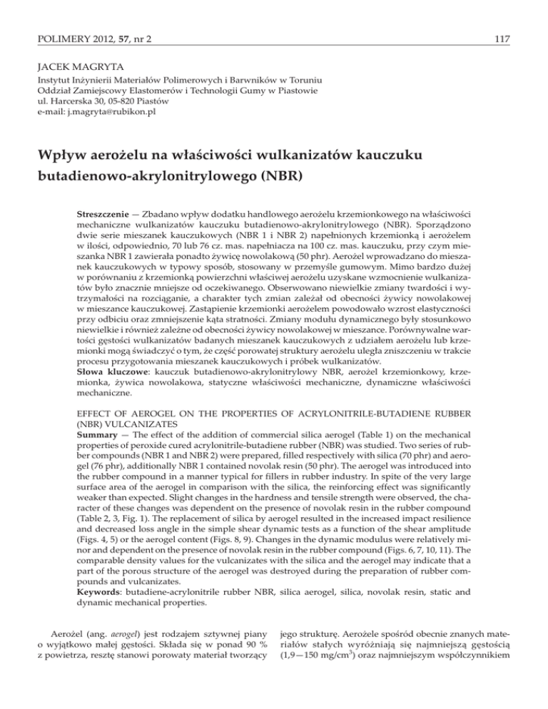 POLIMERY 2012, 57, nr 2 117 JACEK MAGRYTA Instytut In¿ynierii Materia³ów Polimerowych i Barwników w Toruniu Oddzia³ Zamiejscowy Elastomerów i Technologii Gumy w Piastowie ul. Harcerska 30, 05-820 Piastów e-mail: [email protected] Wp³yw aero¿elu na w³aœciwoœci wulkanizatów kauczuku butadienowo-akrylonitrylowego (NBR) Streszczenie — Zbadano wp³yw dodatku handlowego aero¿elu krzemionkowego na w³aœciwoœci mechaniczne wulkanizatów kauczuku butadienowo-akrylonitrylowego (NBR). Sporz¹dzono dwie serie mieszanek kauczukowych (NBR 1 i NBR 2) nape³nionych krzemionk¹ i aero¿elem w iloœci, odpowiednio, 70 lub 76 cz. mas. nape³niacza na 100 cz. mas. kauczuku, przy czym mieszanka NBR 1 zawiera³a ponadto ¿ywicê nowolakow¹ (50 phr). Aero¿el wprowadzano do mieszanek kauczukowych w typowy sposób, stosowany w przemyœle gumowym. Mimo bardzo du¿ej w porównaniu z krzemionk¹ powierzchni w³aœciwej aero¿elu uzyskane wzmocnienie wulkanizatów by³o znacznie mniejsze od oczekiwanego. Obserwowano niewielkie zmiany twardoœci i wytrzyma³oœci na rozci¹ganie, a charakter tych zmian zale¿a³ od obecnoœci ¿ywicy nowolakowej w mieszance kauczukowej. Zast¹pienie krzemionki aero¿elem powodowa³o wzrost elastycznoœci przy odbiciu oraz zmniejszenie k¹ta stratnoœci. Zmiany modu³u dynamicznego by³y stosunkowo niewielkie i równie¿ zale¿ne od obecnoœci ¿ywicy nowolakowej w mieszance. Porównywalne wartoœci gêstoœci wulkanizatów badanych mieszanek kauczukowych z udzia³em aero¿elu lub krzemionki mog¹ œwiadczyæ o tym, ¿e czêœæ porowatej struktury aero¿elu uleg³a zniszczeniu w trakcie procesu przygotowania mieszanek kauczukowych i próbek wulkanizatów. S³owa kluczowe: kauczuk butadienowo-akrylonitrylowy NBR, aero¿el krzemionkowy, krzemionka, ¿ywica nowolakowa, statyczne w³aœciwoœci mechaniczne, dynamiczne w³aœciwoœci mechaniczne. EFFECT OF AEROGEL ON THE PROPERTIES OF ACRYLONITRILE-BUTADIENE RUBBER (NBR) VULCANIZATES Summary — The effect of the addition of commercial silica aerogel (Table 1) on the mechanical properties of peroxide cured acrylonitrile-butadiene rubber (NBR) was studied. Two series of rubber compounds (NBR 1 and NBR 2) were prepared, filled respectively with silica (70 phr) and aerogel (76 phr), additionally NBR 1 contained novolak resin (50 phr). The aerogel was introduced into the rubber compound in a manner typical for fillers in rubber industry. In spite of the very large surface area of the aerogel in comparison with the silica, the reinforcing effect was significantly weaker than expected. Slight changes in the hardness and tensile strength were observed, the character of these changes was dependent on the presence of novolak resin in the rubber compound (Table 2, 3, Fig. 1). The replacement of silica by aerogel resulted in the increased impact resilience and decreased loss angle in the simple shear dynamic tests as a function of the shear amplitude (Figs. 4, 5) or the aerogel content (Figs. 8, 9). Changes in the dynamic modulus were relatively minor and dependent on the presence of novolak resin in the rubber compound (Figs. 6, 7, 10, 11). The comparable density values for the vulcanizates with the silica and the aerogel may indicate that a part of the porous structure of the aerogel was destroyed during the preparation of rubber compounds and vulcanizates. Keywords: butadiene-acrylonitrile rubber NBR, silica aerogel, silica, novolak resin, static and dynamic mechanical properties. Aero¿el (ang. aerogel) jest rodzajem sztywnej piany o wyj¹tkowo ma³ej gêstoœci. Sk³ada siê w ponad 90 % z powietrza, resztê stanowi porowaty materia³ tworz¹cy jego strukturê. Aero¿ele spoœród obecnie znanych materia³ów sta³ych wyró¿niaj¹ siê najmniejsz¹ gêstoœci¹ (1,9—150 mg/cm3) oraz najmniejszym wspó³czynnikiem POLIMERY 2012, 57, nr 2 118 przewodnictwa ciep³a. Jako pierwszy aero¿ele otrzyma³ w 1931 r. Samuel Stephens Kistler, wówczas jednak nie znalaz³y one ¿adnego praktycznego zastosowania i prace Kistlera zosta³y w du¿ym stopniu zapomniane. W charakterze sk³adnika mieszanek kauczukowych przydatny wydaje siê byæ zw³aszcza aero¿el krzemionkowy, krzemionka bowiem jest szeroko stosowanym nape³niaczem. Obecnie handlowo dostêpne s¹ aero¿ele krzemionkowe zawieraj¹ce ok. 95 % powietrza (zatem o ma³ej gêstoœci) i powierzchni w³aœciwej ok. 800 m2/g. Cz¹stki takiego aero¿elu maj¹ wymiary 20—40 nm. Publikacji dotycz¹cych u¿ycia krzemionkowego aero¿elu w mieszankach kauczukowych jest niewiele. K. Niciñski, G. Hermann i wspó³pr. [1, 2] wykorzystywali aero¿ele o powierzchni w³aœciwej 2-krotnie mniejszej ni¿ obecnie dostêpne, a ich produkcjê zakoñczono w roku 1996. Nowszych publikacji z tej tematyki nie ma, ze starszych zaœ wynika, ¿e dodatek aero¿elu powoduje zwiêkszenie wytrzyma³oœci na rozci¹ganie i twardoœci wulkanizatów oraz poprawê ich izolacyjnoœci termicznej i odpornoœci na œcieranie. Mo¿na siê spodziewaæ, i¿ mieszanki zawieraj¹ce aero¿el bêd¹ mia³y ma³¹ gêstoœæ oraz interesuj¹ce w³aœciwoœci dynamiczne (ca³kowity brak lub wystêpowanie s³abego efektu Payne’a oraz niewielkie zdolnoœci t³umi¹ce, o ile nie bêd¹ siê tworzy³y sieci s³abych oddzia³ywañ fizycznych) [1, 2]. W literaturze mo¿na jedynie znaleŸæ informacje o innych ni¿ w cytowanych pracach zastosowaniach aero¿eli, zwi¹zanych z elastomerami. Aero¿ele u¿ywano, np. w celu wzmacniania wyrobów z kauczuku silikonowego [3], aero¿el zaœ otrzymany z glinokrzemianów wykorzystywano w wyrobach z lateksu kauczuku naturalnego [4, 5]. Mieszanki lateksowe sieciowano w sposób konwencjonalny (siark¹ w obecnoœci przyspieszaczy), co w przypadku bardzo porowatego materia³u, ze wzglêdu na jego s³abe przewodnictwo cieplne, prowadzi³o do nierównomiernego usieciowania. W interesuj¹cej pracy [6] badano podobne kompozyty lateksu kauczuku naturalnego (NR) i glinokrzemianowego aero¿elu uzyska