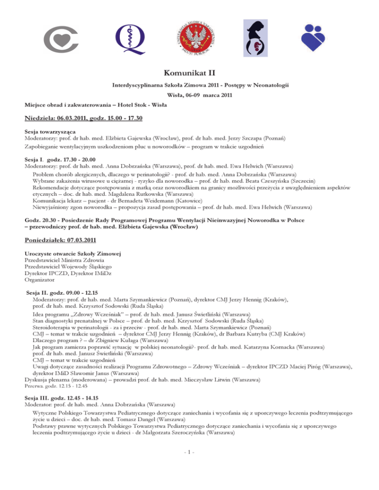 Komunikat II Interdyscyplinarna Szkoła Zimowa 2011 - Postępy w Neonatologii Wisła, 06-09 marca 2011 Miejsce obrad i zakwaterowania – Hotel Stok - Wisła Niedziela: 06.03.2011, godz. 15.00 - 17.30 Sesja towarzysząca Moderatorzy: prof. dr hab. med. Elżbieta Gajewska (Wrocław), prof. dr hab. med. Jerzy Szczapa (Poznań) Zapobieganie wentylacyjnym uszkodzeniom płuc u noworodków – program w trakcie uzgodnień Sesja I. godz. 17.30 - 20.00 Moderatorzy: prof. dr hab. med. Anna Dobrzańska (Warszawa), prof. dr hab. med. Ewa Helwich (Warszawa) Problem chorób alergicznych, dlaczego w perinatologii? - prof. dr hab. med. Anna Dobrzańska (Warszawa) Wybrane zakażenia wirusowe u ciężarnej - ryzyko dla noworodka – prof. dr hab. med. Beata Czeszyńska (Szczecin) Rekomendacje dotyczące postępowania z matką oraz noworodkiem na granicy możliwości przeżycia z uwzględnieniem aspektów etycznych – doc. dr hab. med. Magdalena Rutkowska (Warszawa) Komunikacja lekarz – pacjent - dr Bernadeta Weidemann (Katowice) Niewyjaśniony zgon noworodka – propozycja zasad postępowania – prof. dr hab. med. Ewa Helwich (Warszawa) Godz. 20.30 - Posiedzenie Rady Programowej Programu Wentylacji Nieinwazyjnej Noworodka w Polsce – przewodniczy prof. dr hab. med. Elżbieta Gajewska (Wrocław) Poniedziałek: 07.03.2011 Uroczyste otwarcie Szkoły Zimowej Przedstawiciel Ministra Zdrowia Przedstawiciel Wojewody Śląskiego Dyrektor IPCZD, Dyrektor IMiDz Organizator Sesja II. godz. 09.00 - 12.15 Moderatorzy: prof. dr hab. med. Marta Szymankiewicz (Poznań), dyrektor CMJ Jerzy Hennig (Kraków), prof. dr hab. med. Krzysztof Sodowski (Ruda Śląska) Idea programu „Zdrowy Wcześniak” – prof. dr hab. med. Janusz Świetliński (Warszawa) Stan diagnostyki prenatalnej w Polsce – prof. dr hab. med. Krzysztof Sodowski (Ruda Śląska) Steroidoterapia w perinatologii - za i przeciw - prof. dr hab. med. Marta Szymankiewicz (Poznań) CMJ – temat w trakcie uzgodnień – dyrektor CMJ Jerzy Hennig (Kraków), dr Barbara Kutryba (CMJ Kraków) Dlaczego program ? – dr Zbigniew Kułaga (Warszawa) Jak program zamierza poprawić sytuację w polskiej neonatologii?- prof. dr hab. med. Katarzyna Kornacka (Warszawa) prof. dr hab. med. Janusz Świetliński (Warszawa) CMJ – temat w trakcie uzgodnień Uwagi dotyczące zasadności realizacji Programu Zdrowotnego – Zdrowy Wcześniak – dyrektor IPCZD Maciej Piróg (Warszawa), dyrektor IMiD Sławomir Janus (Warszawa) Dyskusja plenarna (moderowana) – prowadzi prof. dr hab. med. Mieczysław Litwin (Warszawa) Przerwa. godz. 12.15 - 12.45 Sesja III. godz. 12.45 - 14.15 Moderator: prof. dr hab. med. Anna Dobrzańska (Warszawa) Wytyczne Polskiego Towarzystwa Pediatrycznego dotyczące zaniechania i wycofania się z uporczywego leczenia podtrzymującego życie u dzieci – doc. dr hab. med. Tomasz Dangel (Warszawa) Podstawy prawne wytycznych Polskiego Towarzystwa Pediatrycznego dotyczące zaniechania i wycofania się z uporczywego leczenia podtrzymującego życie u dzieci - dr Małgorzata Szeroczyńska (Warszawa) -1- Sesja IV. godz. 15.30 - 17.30 Moderatorzy: doc. dr hab. med. Marek Szczepański (Białystok), dr med. Wojciech Walas (Opole) Resuscytacja noworodka (ze szczególnym uwzględnieniem sali porodowej) Resuscytacja noworodka aktualne wytyczne - prof. dr hab. med. Ryszard Lauterbach (Kraków) Postępowanie z noworodkiem z encefalopatią niedotlenieniowo-niedokrwienną - zasady kwalifikacji do hipotermii leczniczej - doc. dr hab. med. Ewa Gulczyńska (Łódź) Użyteczność wybranych biochemicznych markerów niedotlenienia okołoporodowego w ocenie funkcji przewodu pokarmowego u przedwcześnie urodzonych noworodków – dr med. Ewa Musialik-Świetlińska (Katowice) Czy pacjenta oddziału intensywnej opieki medycznej diagnozować w kierunku refluksu żołądkowo-przełykowego i leczyć? – prof. dr hab. med. Piotr Socha (Warszawa), dr Anna Rybak (Warszawa), Sesja V. godz. 17.30 - 19.00 Moderatorzy: doc. dr hab. med. Ewa Gulczyńska (Łódź), dr med. Dorota Pawlik (Kraków) Neonatologia w niepublicznych jednostkach służby zdrowia – prof. dr hab. med. Ryszard Lauterbach (Kraków) Badania leków w neonatologii – dr med. Marek Migdał (Warszawa), Mierniki jakości świadczeń w neonatologii – doc. dr hab. med. Marek Szczepański (Białystok) Wtorek: 08.03.2011 Sesja VI. godz. 09.00 - 13.30 Moderatorzy: prof. dr hab. med. Beata Czeszyńska (Szczecin), dr med. Krystyna Bober-Olesińska (Warszawa) Zdrowy noworodek na sali porodowej propozycja algorytmu postępowania - dr Magdalena Składanowska (Warszawa) Podstawowe zabiegi pielęgnacyjne na sali porodowej i w pierwszych dniach życia - zalecenia - dr med. Beata Pawlus (Warszawa) Złota godzina - koncepcja - prof. dr hab. med. Janusz Świetliński (Warszawa) Zasady postępowania z dziećmi z BPD po wypisaniu ze szpitala – prof. dr hab. med. Jerzy Szczapa (Poznań) Termoregulacja - propozycja algorytmu - dr med. Justyna Tołłoczko (Warszawa) Pielęgnacja skóry - zalecenia - dr med. Maria Wilińska (Warszawa) SpO2 - propozycja algorytmu - dr Anna Kowal (Warszawa) Sesja VII. godz. 15.00 - 17.00 Moderatorzy: prof. dr hab. med. Urszula Godula-Stuglik (Zabrze), prof. dr hab. med. Ryszard Lauterbach (Kraków) Złota godzina Cd. Diagnostyka EOS propozycja algorytmu - dr med. Maria Wilińska (Warszawa) Terapia EOS propozycja algorytmu - dr med. Krystyna Bober-Olesińska (Warszawa) Sesja VIII. godz. 17.30 - Prezentacja zaleceń konkursowych Moderatorzy: prof. dr hab. med. Katarzyna Kornacka (Warszawa), prof. dr hab. med. Janusz Książyk (Warszawa) - termin zgłoszeń mija 31 stycznia Dotychczas zgłoszono: prof. dr hab. med. Ryszard Lauterbach (Kraków) - Sepsa u noworodka. Wiadomości ogólne oraz postępowanie diagnostyczno-terapeutyczne dr med. Piotr Kruczek (Kraków), dr Piotr Szymański (Kraków)- Algorytm zamykania przetrwałego przewodu tętniczego u wcześniaków z bardzo niską urodzeniową masą ciała doc. dr