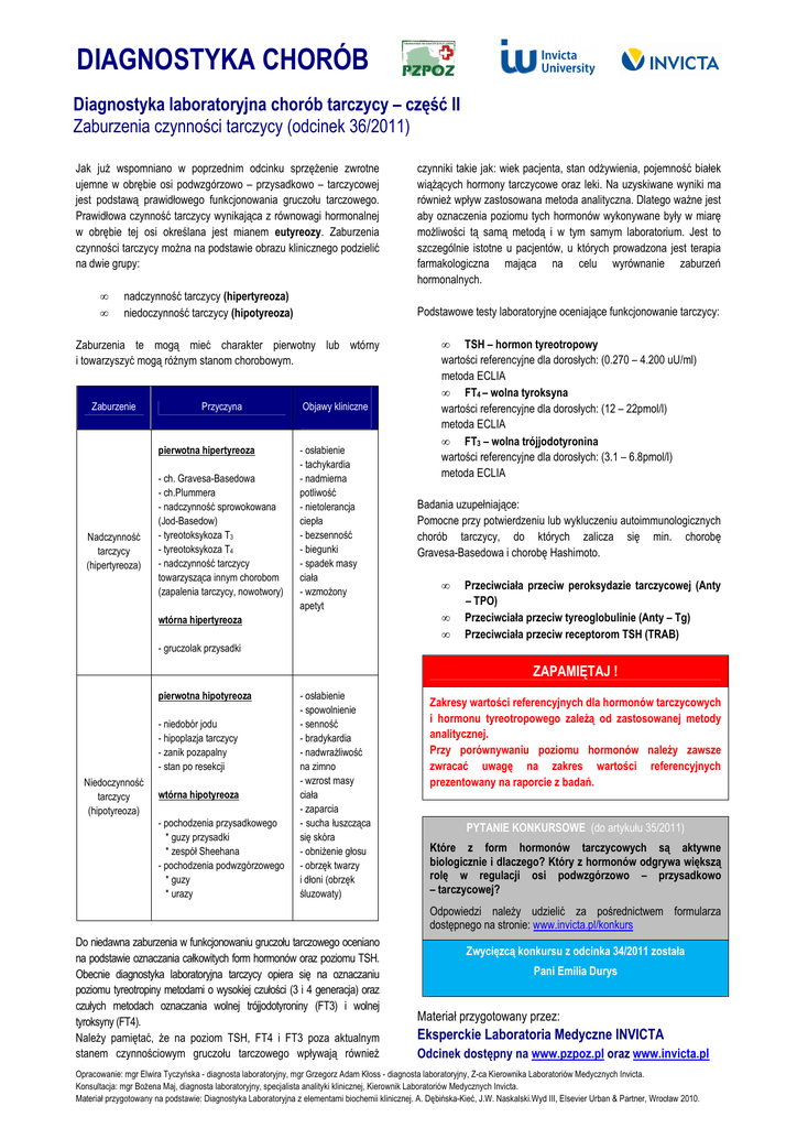 DIAGNOSTYKA CHORÓB Diagnostyka laboratoryjna chorób tarczycy – część II Zaburzenia czynności tarczycy (odcinek 36/2011) Jak juŜ wspomniano w poprzednim odcinku sprzęŜenie zwrotne ujemne w obrębie osi podwzgórzowo – przysadkowo – tarczycowej jest podstawą prawidłowego funkcjonowania gruczołu tarczowego. Prawidłowa czynność tarczycy wynikająca z równowagi hormonalnej w obrębie tej osi określana jest mianem eutyreozy. Zaburzenia czynności tarczycy moŜna na podstawie obrazu klinicznego podzielić na dwie grupy: • • nadczynność tarczycy (hipertyreoza) niedoczynność tarczycy (hipotyreoza) Podstawowe testy laboratoryjne oceniające funkcjonowanie tarczycy: Zaburzenia te mogą mieć charakter pierwotny lub wtórny i towarzyszyć mogą róŜnym stanom chorobowym. Zaburzenie Przyczyna pierwotna hipertyreoza Nadczynność tarczycy (hipertyreoza) - ch. Gravesa-Basedowa - ch.Plummera - nadczynność sprowokowana (Jod-Basedow) - tyreotoksykoza T3 - tyreotoksykoza T4 - nadczynność tarczycy towarzysząca innym chorobom (zapalenia tarczycy, nowotwory) czynniki takie jak: wiek pacjenta, stan odŜywienia, pojemność białek wiąŜących hormony tarczycowe oraz leki. Na uzyskiwane wyniki ma równieŜ wpływ zastosowana metoda analityczna. Dlatego waŜne jest aby oznaczenia poziomu tych hormonów wykonywane były w miarę moŜliwości tą samą metodą i w tym samym laboratorium. Jest to szczególnie istotne u pacjentów, u których prowadzona jest terapia farmakologiczna mająca na celu wyrównanie zaburzeń hormonalnych. Objawy kliniczne - osłabienie - tachykardia - nadmierna potliwość - nietolerancja ciepła - bezsenność - biegunki - spadek masy ciała - wzmoŜony apetyt wtórna hipertyreoza • TSH – hormon tyreotropowy wartości referencyjne dla dorosłych: (0.270 – 4.200 uU/ml) metoda ECLIA • FT4 – wolna tyroksyna wartości referencyjne dla dorosłych: (12 – 22pmol/l) metoda ECLIA • FT3 – wolna trójjodotyronina wartości referencyjne dla dorosłych: (3.1 – 6.8pmol/l) metoda ECLIA Badania uzupełniające: Pomocne przy potwierdzeniu lub wykluczeniu autoimmunologicznych chorób tarczycy, do których zalicza się min. chorobę Gravesa-Basedowa i chorobę Hashimoto. • • • Przeciwciała przeciw peroksydazie tarczycowej (Anty – TPO) Przeciwciała przeciw tyreoglobulinie (Anty – Tg) Przeciwciała przeciw receptorom TSH (TRAB) - gruczolak przysadki ZAPAMIĘTAJ ! pierwotna hipotyreoza - niedobór jodu - hipoplazja tarczycy - zanik pozapalny - stan po resekcji Niedoczynność tarczycy (hipotyreoza) wtórna hipotyreoza - pochodzenia przysadkowego * guzy przysadki * zespół Sheehana - pochodzenia podwzgórzowego * guzy * urazy - osłabienie - spowolnienie - senność - bradykardia - nadwraŜliwość na zimno - wzrost masy ciała - zaparcia - sucha łuszcząca się skóra - obniŜenie głosu - obrzęk twarzy i dłoni (obrzęk śluzowaty) Zakresy wartości referencyjnych dla hormonów tarczycowych i hormonu tyreotropowego zaleŜą od zastosowanej metody analitycznej. Przy porównywaniu poziomu hormonów naleŜy zawsze zwracać uwagę na zakres wartości referencyjnych prezentowany na raporcie z badań. PYTANIE KONKURSOWE (do artykułu 35/2011) Które z form hormonów tarczycowych są aktywne biologicznie i dlaczego? Który z hormonów odgrywa większą rolę w regulacji osi podwzgórzowo – przysadkowo – tarczycowej? Odpowiedzi naleŜy udzielić za pośrednictwem formularza dostępnego na stronie: www.invicta.pl/konkurs Do niedawna zaburzenia w funkcjonowaniu gruczołu tarczowego oceniano na podstawie oznaczania całkowitych form hormonów oraz poziomu TSH. Obecnie diagnostyka laboratoryjna tarczycy opiera się na oznaczaniu poziomu tyreotropiny metodami o wysokiej czułości (3 i 4 generacja) oraz czułych metodach oznaczania wolnej trójjodotyroniny (FT3) i wolnej tyroksyny (FT4). NaleŜy pamiętać, Ŝe na poziom TSH, FT4 i FT3 poza aktualnym stanem czynnościowym gruczołu tarczowego wpływają równieŜ Zwycięzcą konkursu z odcinka 34/2011 została Pani Emilia Durys Materiał przygotowany przez: Eksperckie Laboratoria Medyczne INVICTA Odcinek dostępny na www.pzpoz.pl oraz www.invicta.pl Opracowanie: mgr Elwira Tyczyńska - diagnosta laboratoryjny, mgr Grzegorz Adam Kłoss - diagnosta laboratoryjny, Z-ca Kierownika Laboratoriów Medycznych Invicta. Konsultacja: mgr BoŜena Maj, diagnosta laboratoryjny, specjalista analityki klinicznej, Kierownik Laboratoriów Medycznych Invicta. Materiał przygotowany na podstawie: Diagnostyka Laboratoryjna z elementami biochemii klinicznej. A. Dębińska-Kieć, J.W. Naskalski.Wyd III, Elsevier Urban & Partner, Wrocław 2010.