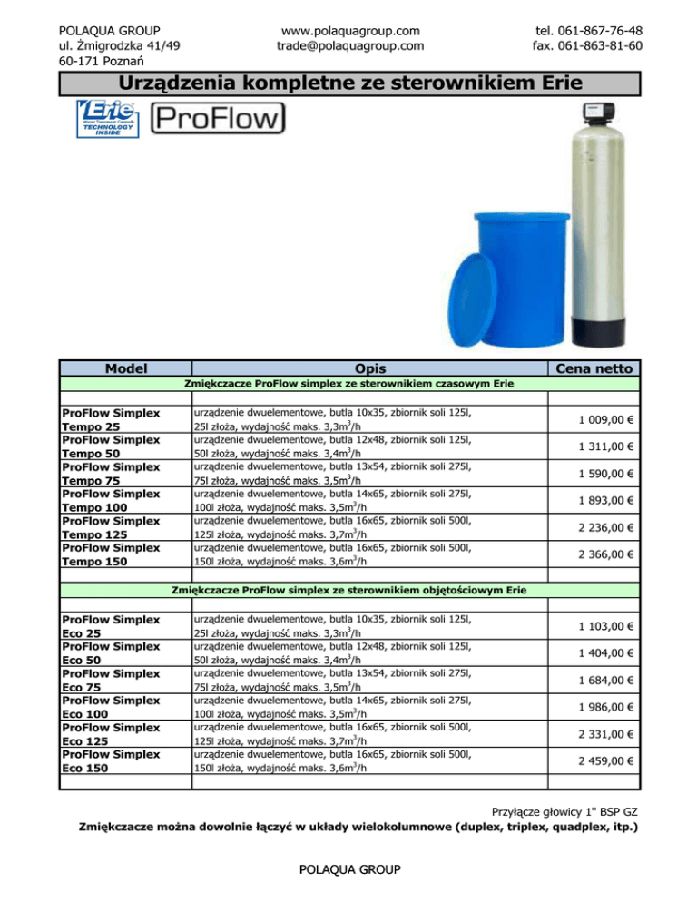 POLAQUA GROUP ul. śmigrodzka 41/49 60-171 Poznań www.polaquagroup.com [email protected] tel. 061-867-76-48 fax. 061-863-81-60 Urządzenia kompletne ze sterownikiem Erie Model Opis Cena netto Zmiękczacze ProFlow simplex ze sterownikiem czasowym Erie ProFlow Simplex Tempo 25 ProFlow Simplex Tempo 50 ProFlow Simplex Tempo 75 ProFlow Simplex Tempo 100 ProFlow Simplex Tempo 125 ProFlow Simplex Tempo 150 urządzenie dwuelementowe, butla 10x35, 25l złoŜa, wydajność maks. 3,3m3/h urządzenie dwuelementowe, butla 12x48, 50l złoŜa, wydajność maks. 3,4m3/h urządzenie dwuelementowe, butla 13x54, 75l złoŜa, wydajność maks. 3,5m3/h urządzenie dwuelementowe, butla 14x65, 100l złoŜa, wydajność maks. 3,5m3/h urządzenie dwuelementowe, butla 16x65, 125l złoŜa, wydajność maks. 3,7m3/h urządzenie dwuelementowe, butla 16x65, 150l złoŜa, wydajność maks. 3,6m3/h zbiornik soli 125l, zbiornik soli 125l, zbiornik soli 275l, zbiornik soli 275l, zbiornik soli 500l, zbiornik soli 500l, 1 009,00 € 1 311,00 € 1 590,00 € 1 893,00 € 2 236,00 € 2 366,00 € Zmiękczacze ProFlow simplex ze sterownikiem objętościowym Erie ProFlow Simplex Eco 25 ProFlow Simplex Eco 50 ProFlow Simplex Eco 75 ProFlow Simplex Eco 100 ProFlow Simplex Eco 125 ProFlow Simplex Eco 150 urządzenie dwuelementowe, butla 10x35, 25l złoŜa, wydajność maks. 3,3m3/h urządzenie dwuelementowe, butla 12x48, 50l złoŜa, wydajność maks. 3,4m3/h urządzenie dwuelementowe, butla 13x54, 75l złoŜa, wydajność maks. 3,5m3/h urządzenie dwuelementowe, butla 14x65, 100l złoŜa, wydajność maks. 3,5m3/h urządzenie dwuelementowe, butla 16x65, 125l złoŜa, wydajność maks. 3,7m3/h urządzenie dwuelementowe, butla 16x65, 150l złoŜa, wydajność maks. 3,6m3/h zbiornik soli 125l, zbiornik soli 125l, zbiornik soli 275l, zbiornik soli 275l, zbiornik soli 500l, zbiornik soli 500l, 1 103,00 € 1 404,00 € 1 684,00 € 1 986,00 € 2 331,00 € 2 459,00 € Przyłącze głowicy 1" BSP GZ Zmiękczacze moŜna dowolnie łączyć w układy wielokolumnowe (duplex, triplex, quadplex, itp.) POLAQUA GROUP POLAQUA GROUP ul. śmigrodzka 41/49 60-171 Poznań www.polaquagroup.com [email protected] Model tel. 061-867-76-48 fax. 061-863-81-60 Opis Cena netto Zmiękczacze dwukolumnowe ProFlow do pracy ciągłej naprzemiennej ze sterownikiem Erie ProFlow Duplex Alternating 2x25 ProFlow Duplex Alternating 2x50 ProFlow Duplex Alternating 2x75 ProFlow Duplex Alternating 2x100 ProFlow Duplex Alternating 2x125 ProFlow Duplex Alternating 2x150 2 2 2 2 2 2 2 2 2 2 2 2 * butle 10x35, jeden zbiornik soli 125l, x 25l złoŜa, wydajność maks. 3,3m3/h* butle 12x48, jeden zbiornik soli 275l, x 50l złoŜa, wydajność maks. 3,4m3/h* butle 13x54, jeden zbiornik soli 500l, x 75l złoŜa, wydajność maks. 3,5m3/h* butle 14x65, jeden zbiornik soli 500l, x 100l złoŜa, wydajność maks. 3,5m3/h* butle 16x65, jeden zbiornik soli 750l, x 125l złoŜa, wydajność maks. 3,7m3/h* butle 16x65, jeden zbiornik soli 750l, x 150l złoŜa, wydajność maks. 3,6m3/h* wydajność podana dla jednej kolumny 2 085,00 € 2 966,00 € 3 402,00 € 3 961,00 € 4 360,00 € 4 704,00 € Zmiękczacze dwukolumnowe ProFlow do pracy ciągłej równoległej ze sterownikiem Erie ProFlow Duplex High Flow 2x25 ProFlow Duplex High Flow 2x50 ProFlow Duplex High Flow 2x75 ProFlow Duplex High Flow 2x100 ProFlow Duplex High Flow 2x125 ProFlow Duplex High Flow 2x150 2 butle 10x35, jeden zbiornik soli 125l, 2 x 25l złoŜa, wydajność maks. 6,7m3/h** 2 butle 12x48, jeden zbiornik soli 275l, 2 x 50l złoŜa, wydajność maks. 6,8m3/h** 2 butle 13x54, jeden zbiornik soli 500l, 2 x 75l złoŜa, wydajność maks. 7,0m3/h** 2 butle 14x65, jeden zbiornik soli 500l, 2 x 100l złoŜa, wydajność maks. 7,0m3/h** 2 butle 16x65, jeden zbiornik soli 750l, 2 x 125l złoŜa, wydajność maks. 7,4m3/h** 2 butle 16x65, jeden zbiornik soli 750l, 2 x 150l złoŜa, wydajność maks. 7,2m3/h** ** wydajność podana dla pracy dwóch kolumn poza regeneracją Przyłącze głowic 1" BSP GZ POLAQUA GROUP 2 214,00 € 3 150,00 € 3 613,00 € 4 207,00 € 4 630,00 € 4 997,00 € POLAQUA GROUP ul. śmigrodzka 41/49 60-171 Poznań Model www.polaquagroup.com [email protected] Opis tel. 061-867-76-48 fax. 061-863-81-60 Cena netto Zmiękczacze trzykolumnowe ProFlow do pracy ciągłej równoległej ze sterownikiem Erie 3 3 3 ProFlow Triplex 3x50 3 3 ProFlow Triplex 3x75 3 3 ProFlow Triplex 3 3x100 3 ProFlow Triplex 3 3x125 3 ProFlow Triplex 3 3x150 * ProFlow Triplex 3x25 butle 10x35, trzy zbiorniki soli 125l, x 25l złoŜa, wydajność maks. 10,0m3/h* butle 12x48, trzy zbiorniki soli 125l, x 50l złoŜa, wydajność maks. 10,2m3/h* butle 13x54, trzy zbiorniki soli 275l, x 75l złoŜa, wydajność maks. 10,4m3/h* butle 14x65, trzy zbiorniki soli 275l, x 100l złoŜa, wydajność maks. 10,4m3/h* butle 16x65, trzy zbiorniki soli 500l, x 125l złoŜa, wydajność maks. 11,1m3/h* butle 16x65, trzy zbiorniki soli 500l, x 150l złoŜa, wydajność maks. 10,8m3/h* wydajność podana dla pracy trzech kolumn poza regeneracją Przyłącze głowic 1" BSP GZ POLAQUA GROUP 3 843,00 € 4 748,00 € 5 588,00 € 6 495,00 € 7 527,00 € 7 913,00 €