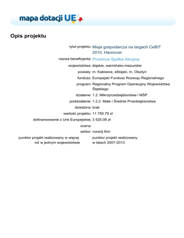Opis projektu tytuł projektu: Misja gospodarcza na targach CeBIT 2010, Hannover nazwa beneficjenta: Proximus Spółka Akcyjna województwa: śląskie, warmińsko-mazurskie powiaty: m. Katowice, elbląski, m. Olsztyn fundusz: Europejski Fundusz Rozwoju Regionalnego program: Regionalny Program Operacyjny Województwa Śląskiego działanie: 1.2. Mikroprzedsiębiorstwa i MŚP poddziałanie: 1.2.2. Małe i Średnie Przedsiębiorstwa dziedzina: brak wartość projektu: 11 750.78 zł dofinansowanie z Unii Europejskiej: 3 525.08 zł ocena: sektor: rozwój firm punktor projekt realizowany w więcej niż w jednym województwie punktor projekt realizowany w latach 2007-2013