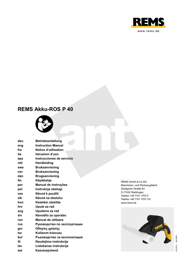 REMS Akku-ROS P 40 REMS GmbH & Co KG Maschinen- und Werkzeugfabrik Stuttgarter Straße 83 D-71332 Waiblingen Telefon +49 7151 1707-0 Telefax +49 7151 1707-110 www.rems.de 291305 R Betriebsanleitung Instruction Manual Notice d’utilisation Istruzioni d’uso Instrucciones de servicio Handleiding Bruksanvisning Bruksanvisning Brugsanvisning Käyttöohje Manual de instruções Instrukcja obsługi Návod k použití Návod na obsluhu Kezelési utasítás Upute za rad Uputstvo za rad Navodilo za uporabo Manual de utilizare Руководство по эксплуатации Οδηγίες χρήσης Kullanım kılavuzu Ръководство за експлоатация Naudojimo instrukcija Lietošanas instrukcija Kasutusjuhend 05 / 2013 deu eng fra ita spa nld swe nor dan fin por pol ces slk hun hrv scg slv ron rus grc tur bul lit lav est Fig. 1 7 1 8 2 4 6 5 3 pol pol / ces 1. Dane techniczne 1.1. Numery artykułów REMS Akku-ROS P 40 Ostrze do REMS Akku-ROS P 40 Ładowarka do REMS Akku-ROS P 40 291300 291301 291302 1.2. Zakres pracy, wydajność Rury z tworzyw sztucznych: PVC, PP, PE, rury wielowarstwowe Ø ≤ 40 mm Grubość ściany s ≤ 6,7 mm Wydajność cięcia 4 – 5 s/ cięcie Wydajność trwała 200 cięć Czas pracy 35 min 1.3. Dane elektryczne Akumulatorowe nożyce do rur z wbudowanym akumulatorem NiMH Ładowarka do akumulatora NiMH Wejście Wyjście 1.4. Wydajność akumulatora Liczba cięć z jednym ładowaniem akumulatora Czas ładowania akumulatora 9,6 V =; 1,0 Ah; 6 A 100 – 240 V ~ 12 V =; 500 mA; 6 W ca. 250 2 godziny 1.5. Wymiary Dł. × Szer. × Wys.: 225 × 180 × 103 mm (8,8” × 7,1” × 4”) 1.6.Waga 1,2 kg (2,5 lb) 1.7. Informacja o hałasie Wartość emisji odnosząca się do miejsca pracy 73 dB(A) 1.8.Wibracje Ważona efektywna wartość przyspieszenia 2,5 m/s² Podana wartość emisyjna drgań została zmierzona na podstawie znormalizowanego postępowania kontrolnego i może być stosowana do porównania z innymi urządzeniami. Wartość ta może także służyć do wstępnego oszacowania momentu przerwania pracy. Uwaga: Wartość emisyjna drgań podczas rzeczywistej pracy urządzenia może się różnić od wartości podanej wyżej, zależnie od sposobu, w jaki urządzenie jest stosowane. W zależności od rzeczywistych warunków pracy (praca przerywana) może okazać się koniecznym ustalenie środków bezpieczeństwa dla ochrony osoby obsługującej urządzenie. 4.2. Zmiana ostrza (3) Przełącznik suwakowy (4) ustawić na „OFF“! Akku-Rohrschere tak ułożyć, żeby można było zdjąć śruby z obudowy. Zdjąć górną pokrywę obudowy. Odkręcić śrubę mocującą napęd i wyjąć napęd. Wyjąć sprężynę do powrotu ostrza. Zdjąć wszystkie nakrętki nośnika ostrza, wymienić ostrze. Ruchome części lekko natłuścić. 5. Postępowanie w przypadku zakłóceń 5.1. Zakłócenie Podczas cięcia akumulatorowe nożyce zatrzymują się. Przyczyna ● Materiał nie nadaje się do cięcia nożycami REMS Akku-ROS P 40. ● Akumulator słaby albo rozładowany. ● Tępe ostrze. 5.2. Zakłócenie Nożyce akumulatorowe nie działają przy wciśniętym impulsowym przełączniku bezpieczeństwa (7). Przyczyna ● Przełącznik suwakowy ON/OFF jest ustawiony na „OFF“. ● Rura nie naciska na wyłacznik bezpieczeństwa (6). ● Akumulator jest słaby albo rozładowany. ● Tępe ostrze. 6. Gwarancja producenta 2. Uruchamianie Łącze elektryczne Uważać na napięcie sieciowe! Przed podłączeniem ładowarki sprawdzić, czy pokazane na tabliczce znamionowej napięcie jest zgodne z napięciem sieciowym. Na budowach, w wilgotnym otoczeniu, na zewnątrz budynków i w innych podobnych warunkach podłączać ładowarkę do sieci tylko z urządzeniem różnicowo-prądowym 30 mA (FI-przełącznik). Przed pierwszym użyciem naładować akumulator. Do ładowania używać tylko ładowarki dostarczanej z akumulatorowymi nożycami do rur REMS Akku-ROS P 40. Włożyć wtyczkę ładowarki do gniazdka (1) po wewnętrznej stronie uchwytu ręcznego (2). Wtyczkę sieciową ładowarki włączyc do gniazdka sieciowego. Ładować akumulator 2 godziny. Po naładowaniu najpierw wyjąć wtyczkę z gniazdka sieciowego, a następnie wtyczkę z gniazdka w nożycach (1). Akumulator osiąga swoją pełną wydajność dopiero po kilku naładowaniach. Ładowarka nie nadaje się do stosowania na zewnątrz budynków. 3.Eksploatacja Uwaga, niebezpieczeństwo zranienia! Proszę nigdy nie zbliżać rąk do obszaru cięcia ostrza (3)! Istnieje niebezpieczeństwo, że zostaną odcięte palce! Proszę trzymać włosy, odzież i rękawice z dala od obszaru cięcia. 3.1. Przebieg pracy Zaznaczyć na rurze miejsce cięcia. Przełącznik suwakowy „ON/OFF“ (4) ustawić na pozycję „ON“. Włożyć rurę w prowadnicę (5) i wcisnąć wyłącznik bezpieczeństwa (6). Uruchomić Impusowy przełącznik bezpieczeństwa (7). Ostrze (3) odetnie rurę. Po obcięciu rury nożyce akumulatorowe wyłączają się same automatycznie, jeśli tylko wyłącznik bezpieczeństwa (6) jest zwoniony. Poprzez naciśnięcie przycisku cofającego (8) ostrze (3) cofnie się i wróci do pierotnego położenia. Po zakończeniu pracy z nożycami REMS Akku-ROS P 40, proszę ustawić przełącznik suwakowy na „OFF”. Proszę naładować akumulator znowu do następnego użycia nożyc. 4.Konserwacja Przed wszelkimi pracami naprawczymi ustawić przełącznik suwakowy (4) na „OFF“! Te prace mogą byc wykonywane tylko przez osoby przeszkolone! 4.1. Przegląd/ Konserwacja Silnik ma szczotki węglowe, które się ścierają. Dlatego od czasu do czasu nożyce akumulatorowe muszą zostać sprawdzone przez autoryzowany warsztat serwisowy firmy REMS. Ponieważ szczotki węglowe nie podlegają wymianie, w przypadku ich zużycia musi zostać wymieniony silnik. Gwarancja udzielana jest na okres 12 miesięcy licząc od daty przekazania nowego urządzenia pierwszemu użytkownikowi, nie dłużej jednak niż 24 miesiące o