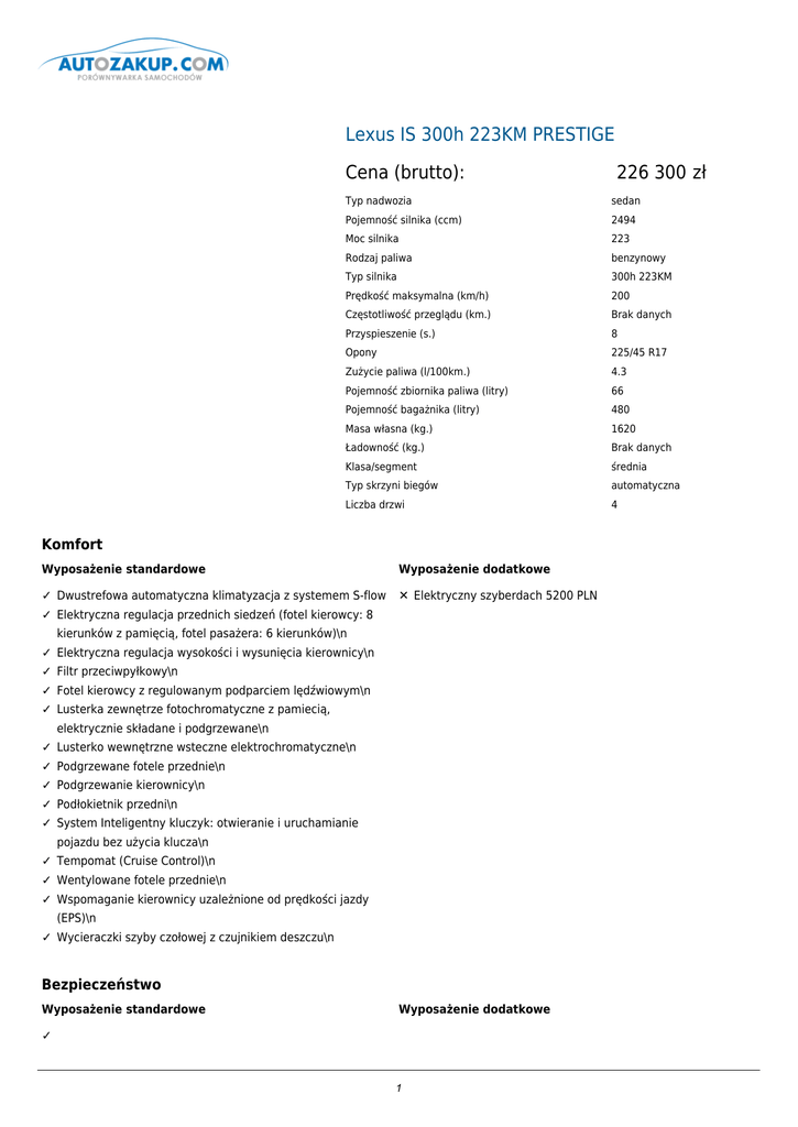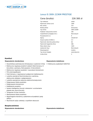 Lexus IS 300h 223KM PRESTIGE Cena (brutto): Typ nadwozia sedan Pojemność silnika (ccm) 2494 Moc silnika 223 Rodzaj paliwa benzynowy Typ silnika 300h 223KM Prędkość maksymalna (km/h) 200 Częstotliwość przeglądu (km.) Brak danych Przyspieszenie (s.) 8 Opony 225/45 R17 Zużycie paliwa (l/100km.) 4.3 Pojemność zbiornika paliwa (litry) 66 Pojemność bagażnika (litry) 480 Masa własna (kg.) 1620 Ładowność (kg.) Brak danych Klasa/segment średnia Typ skrzyni biegów automatyczna Liczba drzwi 4 Komfort Wyposażenie standardowe Wyposażenie dodatkowe ✓ Dwustrefowa automatyczna klimatyzacja z systemem S-flow ✕ Elektryczny szyberdach 5200 PLN ✓ Elektryczna regulacja przednich siedzeń (fotel kierowcy: 8 kierunków z pamięcią, fotel pasażera: 6 kierunków)\n ✓ Elektryczna regulacja wysokości i wysunięcia kierownicy\n ✓ Filtr przeciwpyłkowy\n ✓ Fotel kierowcy z regulowanym podparciem lędźwiowym\n ✓ Lusterka zewnętrze fotochromatyczne z pamiecią, elektrycznie składane i podgrzewane\n ✓ Lusterko wewnętrzne wsteczne elektrochromatyczne\n ✓ Podgrzewane fotele przednie\n ✓ Podgrzewanie kierownicy\n ✓ Podłokietnik przedni\n ✓ System Inteligentny kluczyk: otwieranie i uruchamianie pojazdu bez użycia klucza\n ✓ Tempomat (Cruise Control)\n ✓ Wentylowane fotele przednie\n ✓ Wspomaganie kierownicy uzależnione od prędkości jazdy (EPS)\n ✓ Wycieraczki szyby czołowej z czujnikiem deszczu\n Bezpieczeństwo Wyposażenie standardowe 226 300 zł Wyposażenie dodatkowe ✓ 1 Aktywna pokrywa silnika (PUH)\n 2 ✓ Boczne kurtyny powietrzne\n ✓ Dwustopniowe poduszki powietrzne kierowcy i pasażera (przednie)\n ✓ Konstrukcja przednich siedzeń zmniejszająca urazy szyi i głowy w przypadku kolizji (WIL)\n ✓ Lampy przeciwmgielne przednie\n ✓ Pasy bezpieczeństwa z napinaczami i ogranicznikami siły napięcia foteli przednich i tylnych zew.\n ✓ Poduszki powietrzne boczne w oparciach foteli przednich (TAP)\n ✓ Poduszki powietrzne chroniące kolana kierowcy i pasażera\n ✓ System antykradzieżowy (alarm z czujnikiem ruchu wewnętrz pojazdu)\n ✓ System antypoślizgowy (ABS)\n ✓ System monitorowania "martwego pola" (BSM)\n ✓ System ostrzegania o niskim ciśnieniu w oponach (TPMS)\n ✓ System ostrzegania o ruchu poprzecznym z tyłu pojazdu (RCTA))\n ✓ System rozdzielający siłę hamowania (EBD)\n ✓ System stabilizacji toru jazdy (VSC)\n ✓ System wspomagania hamowania awaryjnego (BA)\n ✓ System wspomagania wjazdu pod górę (HAC)\n ✓ Systemy kontroli trakcji (TRC)\n ✓ Wyłącznik dezaktywujący poduszkę powietrzną pasażera\n ✓ Zaczepy do mocowania fotelika dziecięcego w systemie ISO FIX\n ✓ Zintegrowany system zarządzania dynamiką pojazdu (VDIM)\n Dodatki Wyposażenie standardowe Wyposażenie dodatkowe ✓ 3-ramienna, skórzana kierownica z łopatkami do zmiany ✕ Aluminiowe obręcze kół 17'' z oponami typu biegów ✓ Bezstopniowa skrzynia biegów E-CVT z trybem Run Flat 3390 PLN ✕ Aluminiowe obręcze kół 18'', pięcioramienne sekwencyjnym 7480 PLN ✓ Centralny zamek z podwójną blokadą ✕ Dopłata do lakieru metalik/perła 4100 PLN ✓ Czujniki parkowania (8 sztuk) ✕ Roleta tylnej szyby regulowana elektrycznie 2010 PLN ✓ Drewniane elementy wykończenia wnętrza\n ✓ Dywaniki (4 szt.) w kolorze wykładziny podłogowej\n ✓ Immobilizer\n ✓ Inteligentna karta: inteligentny kluczyk w postaci płaskiej karty\n ✓ Kamera cofania (obraz na wyświetlaczu 7'')\n ✓ Kanapa tylna składana (dzielona w stosunku 60:40)\n ✓ Kolorowy wyświetlacz informacyjny 4,2''\n ✓ Nakładki progowe z aluminium\n ✓ Napęd na oś tylną (RWD)\n ✓ 3 Obręcze kół ze stopów lekkich 17", 225/45 R17\n 4 ✓ Obsługa Bluetooth\n ✓ Przednie reflektory LED\n ✓ Reflektory z czujnikami zmierzchu\n ✓ Rozmrażacz wycieraczek szyby czołowej\n ✓ Selektor trybów jazdy: 3 tryby (Eco, Normal, Sport)\n ✓ Silnik 2.5l R4 działający w cyklu Atkinsona\n ✓ Skórzana gałka dźwigni zmiany biegów\n ✓ Spryskiwacze reflektorów\n ✓ Sterowanie głosowe\n ✓ Światła do jazdy dziennej LED\n ✓ System aktywnej kontroli dźwięku silnika\n ✓ System audio klasy premium Mark Levinson®: radio AM/FM z DAB, odtwarzacz CD/DVD, 15 głośników\n ✓ System nawigacji GPS z mapami na dysku twardym HDD\n ✓ Szyby regulowane elektrycznie (przód + tył)\n ✓ Tapicerka skórzana\n ✓ Tryb samochodu elektrycznego EV\n ✓ Tuner DAB\n ✓ Uruchamianie silnika za pomocą przycisku\n ✓ Wejścia USB i AUX dla zewnętrznych urządzeń audio\n ✓ Wyświetlacz multimedialny 7'', z możliwością wyświetlania informacji ze smartphone'a\n ✓ Zegar analogowy na desce rozdzielczej\n ✓ zestaw naprawczy kół\n Doprecyzowanie oferty ✕ Pakiet PCS - 6890 PLN Aktywny tempomat (ACC) System ochrony przedzderzeniowej (PCS) ✕ Pakiet LDA - 3550 PLN systemy sygnalizacji opuszczenia pasa ruchu (LDA) oraz adaptacyjnych świateł długich (AHB) Kontakt: Nazwa użytkownika: admin Nazwa firmy: qqq Adres: qqq 12, 41-706 qqq1, NIP: 954 REGON: 1 Telefon: 123, 1 Fax: 1 Email: 1 www: 5