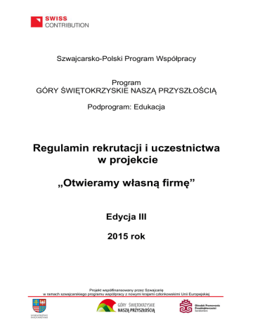 Szwajcarsko-Polski Program Współpracy Program GÓRY ŚWIĘTOKRZYSKIE NASZĄ PRZYSZŁOŚCIĄ Podprogram: Edukacja Regulamin rekrutacji i uczestnictwa w projekcie „Otwieramy własną firmę” Edycja III 2015 rok Projekt współfinansowany przez Szwajcarię w ramach szwajcarskiego programu współpracy z nowymi krajami członkowskimi Unii Europejskiej Niniejszy Regulamin określa zasady rekrutacji i uczestnictwa w projekcie „Otwieramy własną firmę”, zwanego dalej „projektem”, realizowanego w ramach programu ,,GÓRY ŚWIĘTOKRZYSKIE NASZĄ PRZYSZŁOŚCIĄ”- III edycja, 2015 rok. §1 1. 2. 3. 4. 5. Informacje o projekcie Projekt „Otwieramy własną firmę” jest częścią programu ,,Góry Świętokrzyskie naszą przyszłością” realizowanego przez Ośrodek Promowania Przedsiębiorczości oraz Województwo Świętokrzyskie oraz Gminę Dwikozy w ramach Szwajcarsko Polskiego Programu Współpracy, Priorytet 1: Bezpieczeństwo, stabilność, wsparcie reform; Obszar tematyczny nr 1: Inicjatywy na rzecz rozwoju regionalnego regionów peryferyjnych i słabo rozwiniętych. Projekt jest współfinansowany przez Szwajcarię w ramach szwajcarskiego programu współpracy z nowymi krajami członkowskimi Unii Europejskiej. Projekt obejmuje swym zasięgiem gminy w powiatach: kieleckim, opatowskim, ostrowieckim i sandomierskim (wyłączone miasta: Kielce i Ostrowiec Św.). Celem bezpośrednim projektu jest przygotowanie potencjalnych przedsiębiorców do uruchomienia własnej firmy, poprzez możliwość uczestniczenia w bezpłatnym, czterodniowym szkoleniu z zakresu zasad rejestracji działalności gospodarczej, wyboru formy opodatkowania, korzyści wynikających z prowadzenia własnej firmy w oparciu o lokalne zasoby oraz zasad przygotowania biznes planu, który jest dokumentem niezbędnym w procedurze ubiegania się o dotację inwestycyjną dla uruchamiających działalność gospodarczą w ramach programu ,,Góry Świętokrzyskie naszą przyszłością”, podprogram Rozwój lokalny. Ukończenie szkolenia jest jednym z kryteriów strategicznych w procedurze ubiegania się o dotację inwestycyjną dla uruchamiających działalność gospodarczą w ramach programu ,,Góry Świętokrzyskie naszą przyszłością”, podprogram Rozwój lokalny. §2 Słownik pojęć (definicje) 1. Użyte w niniejszym Regulaminie pojęcia oznaczają: a) Wnioskodawca – osoba, która spełnia kryteria formalne udziału w projekcie określone w §3 regulaminu rekrutacji i uczestnictwa oraz złożyła formularz rekrutacyjny. b) Komisja rekrutacyjna – komisja powołana przez Ośrodek Promowania Przedsiębiorczości, której zadaniem jest wybór Uczestników projektu. §3 Kwalifikowalność 1. Do projektu mogą być rekrutowane wyłącznie osoby fizyczne spełniające łącznie następujące warunki: a) posiadają stałe miejsce zameldowania na terenie realizacji projektu (tj. w powiecie kieleckim, sandomierskim, ostrowieckim, opatowskim –z wyłączeniem miast: Kielce i Ostrowiec Św.), b) zamierzające na terenie ww. powiatów rozpocząć prowadzenie działalności gospodarczej, c) będące osobami bezrobotnymi, nieaktywnymi zawodowo, rolnikami lub domownikami (dot. rolników oraz domowników podlegających ubezpieczeniu i opłacającymi składki do KRUS zgodnie z obowiązującymi przepisami ustawy o ubezpieczeniu społecznym rolników), d) nie posiadały zarejestrowanej działalności gospodarczej w okresie 36 miesięcy przed dniem przystąpienia do projektu, e) nie były wspólnikami spółek osobowych prawa handlowego (spółki jawnej, spółki partnerskiej, spółki komandytowej, spółki komandytowo-akcyjnej) w okresie 36 kolejnych miesięcy przed przystąpieniem do projektu, f) nie były udziałowcami lub akcjonariuszami spółek kapitałowych prawa handlowego (spółek z ograniczoną odpowiedzialnością, spółek akcyjnych) w okresie 36 kolejnych miesięcy przed dniem przystąpieniem do projektu (dopuszczalne jest uczestnictwo w projekcie udziałowców lub akcjonariuszy spółek kapitałowych prawa handlowego, których akcje są notowane na giełdzie papierów wartościowych), Projekt współfinansowany przez Szwajcarię w ramach szwajcarskiego programu współpracy z nowymi krajami członkowskimi Unii Europejskiej g) nie były członkami spółdzielni utworzonej na podstawie prawa spółdzielczego w okresie 36 kolejnych miesięcy przed dniem przystąpieniem do projektu (dopuszczalne jest uczestnictwo w projekcie osób będących członkami spółdzielni oszczędnościowo-pożyczkowych, spółdzielni budownictwa mieszkaniowego i banków spółdzielczych, jeżeli nie osiągają przychodu z tytułu tego członkostwa), h) w okresie ostatnich 36 miesięcy przed złożeniem wniosku nie uzyskały dotacji na otwarcie działalności gospodarczej lub działalności agroturystycznej. i) zamierzają uruchomić i prowadzić działalność gospodarczą na terenie powiatu kieleckiego, opatowskiego, ostrowieckiego lub sandomierskiego (z wyłączeniem miasta: Kielce i Ostrowiec Św.). 1. 2. 3. 4. 5. 6. 7. 8. 9. 10. 11. 12. 13. 14. §4 Zasady rekrutacji Proces rekrutacji rozpocznie się od 05.01.2015 i trwać będzie do 23.01.2015 do godziny 16.00. Do projektu w ramach III edycji naboru zostanie zakwalifikowanych do 60 osób: a) do 15 osób z powiatu kieleckiego, b) do 15 osób z powiatu ostrowieckiego, c) do 15 osób z powiatu opatowskiego, d) do 15 osób z powiatu sandomierskiego. Ośrodek Promowania Przedsiębiorczości zastrzega sobie możliwość wcześniejszego zamknięcia naboru formularzy rekrutacyjnych w każdym z w/w powiatów, w przypadku gdy liczba napływających zgłoszeń przewyższy dwukrotnie ilość miejsc w danym powiecie. Informacja o zakończeniu naboru dokumentów rekrutacyjnych zostanie zamieszczona na stronie internetowej projektu na dzień poprzedzający zamknięcie naboru. Rekrutację i weryfikację wnioskodawców prowadzi komisja rekrutacyjna powołana przez Ośrodek Promowania Przeds