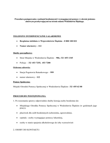 Procedura postępowania z osobami bezdomnymi i wymagającymi pomocy w okresie jesiennozimowym przebywającymi na terenie miasta Wodzisławia Śląskiego. TELEFONY INTERWENCYJNE I ALARMOWE Bezpłatna infolinia w Województwie Śląskim - 0 800 100 022 Numer alarmowy - 112 Służby porządkowe: Straż Miejska w Wodzisławiu Śląskim – 986, /32/ 455 1345 Policja – /32/ 453 7255, 453 7200 Ochrona zdrowia: Stacja Pogotowia Ratunkowego – 999 numer alarmowy - 112 Pomoc Społeczna: Miejski Ośrodek Pomocy Społecznej w Wodzisławiu Śląskim- /32/ 455 62 00 PROCEDURY POSTĘPOWANIA 1. Po rozeznaniu sprawy odpowiednie służby kierują osoby bezdomne do: Miejskiego Ośrodka Pomocy Społecznej w Wodzisławiu Śląskim (w godzinach jego pracy), placówek dla osób bezdomnych (schroniska, ogrzewalnia), szpitala - osoby wymagające pomocy lekarskiej, osoby w stanie upojenia alkoholowego do izby wytrzeźwień 2. OSOBY DO KONTAKTU: Miejski Ośrodek Pomocy Społecznej w Wodzisławiu Śląskim, telefon: /32/ 455 6200 – Anna Pikor wew. 30 (koordynator ds. bezdomności), Ewa Błędowska – wew. 24, Renata Jureczko wew. 25, - zgodnie z godzinami urzędowania ośrodka: od poniedziałku do środy 7.15-15.15 czwartek 7.15-17.15 piątek 7.15-13.15 Straż Miejska w Wodzisławiu Śląskim telefon /32/ 455 1345 - od poniedziałku do soboty w godz. 6.00-22.00 dyżurni Straży Miejskiej - po godz. 22.00 oraz niedziele i święta pracownik monitoringu - osoba nadzorująca w godz. pracy 6.00-14.00 - dyżurny przekieruje Komenda Powiatowa Policji w Wodzisławiu Śląskim – dyżur całodobowy, telefon /32/ 453 7200, 453 7255 3. Zasady postępowania z osobami bezdomnymi - szczególne przypadki: zdiagnozowanie osoby nietrzeźwej – temperatura minusowa – zgodnie z przepisem prawa schronisko interwencyjnie musi przyjąć taką osobę, jednakże osoba nietrzeźwa powinna zostać przewieziona do izby wytrzeźwień. zdiagnozowanie bezdomnej kobiety – możliwość umieszczenia w odpowiedniej placówce po wcześniejszym zdiagnozowaniu sytuacji przez ośrodek PLACÓWKI DLA OSÓB BEZDOMNYCH Dom Alberta – schronisko dla mężczyzn prowadzone przez Towarzystwo Pomocy im. Św. Brata Alberta koło Wodzisławskie ul. Rzeczna 24 Schronisko dla Bezdomnych Mężczyzn prowadzone przez Towarzystwo Charytatywne Rodzina ul. Marklowicka 17 Ogrzewalnia – prowadzona przez Miejski Ośrodek Pomocy Społecznej ul. Rzeczna 24 DZIAŁANIA MIEJSKIEGO OŚRODKA POMOCY SPOŁECZNEJ 1. Wydawanie stosownych skierowań umożliwiających korzystanie z pobytu w jednej z placówek dla bezdomnych. 2. Diagnozowanie osoby bezdomnej pod kątem udzielenia pomocy stosownie do jego potrzeb. 3. Współpraca ze wszystkimi służbami oraz instytucjami działającymi na rzecz osób bezdomnych. 4. Prowadzenie rejestru osób bezdomnych. DZIAŁANIA STRAŻY MIEJSKIEJ 1. Prowadzenie patroli mających na celu zlokalizowanie miejsc przebywania osób bezdomnych (ogródki działkowe, altany, piwnice, klatki schodowe, pustostany, kanały ciepłownicze). W przypadku spotkania osoby bezdomnej w jednym z wyżej wymienionych miejsc funkcjonariusze dokonują oceny sytuacji pod kątem zagrożenia zdrowia lub życia. 2. Kierowanie osób bezdomnych do Miejskiego Ośrodka Pomocy Społecznej w godzinach jego urzędowania. W dni wolne od pracy bezpośrednio do miejsc, w których udzielona może zostać pomoc. 3. W przypadku odmowy skorzystania ze schronienia przez osobę bezdomną wypełniane jest stosowne oświadczenie lub sporządzana jest notatka służbowa. 4. Oświadczenie/notatkę przekazuje się do Miejskiego Ośrodka Pomocy Społecznej. 5. W przypadku wyjątkowych sytuacji Straż Miejska zobowiązana jest do ustalenia szczegółów działań interwencyjnych z wyznaczonym przez MOPS pracownikiem. DZIAŁANIA POLICJI 1. Prowadzenie przez dzielnicowych patroli mających na celu zlokalizowanie miejsc przebywania osób bezdomnych (ogródki działkowe, altany, piwnice, klatki schodowe, pustostany, kanały ciepłownicze). W przypadku spotkania osoby bezdomnej w jednym z wyżej wymienionych miejsc funkcjonariusze dokonują oceny sytuacji pod kątem zagrożenia zdrowia lub życia. 2. Kierowanie osób bezdomnych do Miejskiego Ośrodka Pomocy Społecznej w godzinach jego urzędowania. W dni wolne od pracy bezpośrednio do miejsc, w których udzielona może zostać pomoc. 3. W przypadku odmowy skorzystania ze schronienia przez osobę bezdomną wypełniane jest stosowne oświadczenie lub sporządzana jest notatka służbowa. 4. Oświadczenie/notatkę przekazuje się do Miejskiego Ośrodka Pomocy Społecznej. 5. W przypadku wyjątkowych sytuacji Policja zobowiązana jest do ustalenia szczegółów działań interwencyjnych z wyznaczonym przez MOPS pracownikiem. DZIAŁANIA ORGANIZACJI POZARZĄDOWYCH 1. Działanie w obszarze osób bezdomnych i zagrożonych bezdomnością. 2. Współpraca z Miejskim Ośrodkiem Pomocy Społecznej w Wodzisławiu Śląskim oraz służbami interwencyjnymi.
