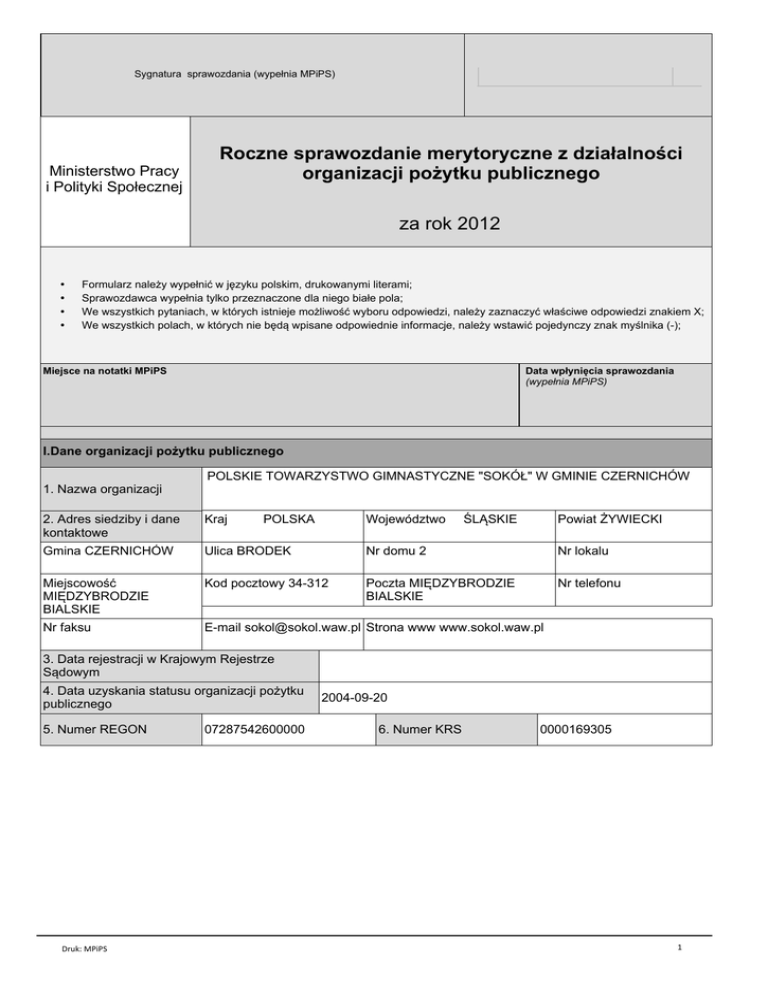 6\JQDWXUDVSUDZR]GDQLDZ\SHáQLD 6\JQDWXUDVSUDZR]GDQLDZ\SHáQLD03L36 MPiPS) Ministerstwo Pracy L3ROLW\NL6SRáHF]QHM 5RF]QHVSUDZR]GDQLHPHU\WRU\F]QH]G]LDáDOQRĞFL RUJDQL]DFMLSRĪ\WNXSXEOLF]QHJR za rok 2012 • • • • )RUPXODU]QDOHĪ\Z\SHáQLüZMĊ]\NXSROVNLPGUXNRZDQ\PLOLWHUDPL 6SUDZR]GDZFDZ\SHáQLDW\ONRSU]H]QDF]RQHGODQLHJRELDáHSROD :HZV]\VWNLFKS\WDQLDFKZNWyU\FKLVWQLHMHPRĪOLZRĞüZ\ERUXRGSRZLHG]LQDOHĪ\]D]QDF]\üZáDĞFLZHRGSRZLHG]L]QDNLHP; :HZV]\VWNLFKSRODFKZNWyU\FKQLHEĊGąZSLVDQHRGSRZLHGQLHLQIRUPDFMHQDOHĪ\ZVWDZLüSRMHG\QF]\]QDNP\ĞOQLND 'DWDZSá\QLĊFLDVSUDZR]GDQLD Z\SHáQLD03L36 Miejsce na notatki MPiPS ,'DQHRUJDQL]DFMLSRĪ\WNXSXEOLF]QHJR 32/6.,(72:$5=<67:2*,01$67<&=1(62.Ïà:*0,1,(&=(51,&+Ï: 1. Nazwa organizacji :RMHZyG]WZRĝ/Ą6.,( 3RZLDWĩ<:,(&., Ulica BRODEK Nr domu 2 Nr lokalu 0LHMVFRZRĞü 0,ĉ'=<%52'=,( BIALSKIE Kod pocztowy 34-312 3RF]WD0,ĉ'=<%52'=,( BIALSKIE Nr telefonu Nr faksu E-mail [email protected] Strona www www.sokol.waw.pl 2. Adres siedziby i dane kontaktowe Kraj Gmina CZERNICHÓW POLSKA 3. Data rejestracji w Krajowym Rejestrze 6ąGRZ\P 'DWDX]\VNDQLDVWDWXVXRUJDQL]DFMLSRĪ\WNX publicznego 5. Numer REGON Druk: MPiPS 07287542600000 2004-09-20 6. Numer KRS 0000169305 1 6NáDGRUJDQX]DU]ąG]DMąFHJRRUJDQL]DFML 1DOHĪ\ZSLVDüLPLRQDQD]ZLVNDRUD]LQIRUPDFMHRIXQNFML SHáQLRQHMSU]H]SRV]F]HJyOQ\FKF]áRQNyZRUJDQX ]DU]ąG]DMąFHJR PIOTR HARAT - PREZES ANDZREJ KREMPEL - WICEPREZES 0$à*25=$7$36=&=Ïà.$6.$5%1,. BARBARA KOS - SEKRETARZ '$187$.26&=à21(.=$5=Ą'8 %$5%$5$.26+$5$7&=à21(.=$5=Ą'8 $*1,(6=.$&+/(%,&.$*àÏ'&=à21(.=$5=Ą'8 -$&(.*5$%2ē&=à21(.=$5=Ą'8 6NáDGRUJDQXNRQWUROLOXEQDG]RUXRUJDQL]DFML %($7$:ĉ*5=<135=(:2'1,&=Ą&$.20,6-,5(:,=<-1(1DOHĪ\ZSLVDüLPLRQDQD]ZLVNDRUD]LQIRUPDFMHRIXQNFML :,2/(77$:$/8ĝ&=à21(..20,6-,5(:,=<-1(SHáQLRQHMSU]H]SRV]F]HJyOQ\FKF]áRQNyZRUJDQXNRQWUROL ='=,6à$:ĩ$%$&=à21(..20,6-,5(:,=<-1(lub nadzoru) 9. Cele statutowe organizacji 1DOHĪ\RSLVDüFHOHQDSRGVWDZLHVWDWXWXRUJDQL]DFML 10. Sposób realizacji celów statutowych organizacji 1DOHĪ\RSLVDüVSRVyEUHDOL]DFMLFHOyZVWDWXWRZ\FK organizacji na podstawie statutu organizacji) Druk: MPiPS 6]HU]HQLHNXOWXU\IL]\F]QHMZĞUyGVSRáHF]HĔVWZDV]F]HJyOQLH ZĞUyGG]LHFLLPáRG]LHĪ\SU]H]SURZDG]HQLH]DMĊüRFKDUDNWHU]H VSRUWRZ\PLRJyOQRUR]ZRMRZ\PLQVSLURZDQHHW\NąFKU]HĞFLMDĔVNą FRáąF]\VLĊ]SRVWDZąWROHUDQFMLZVWRVXQNXOXG]LLQQ\FK ĞZLDWRSRJOąGyZ]JRGQH]WUDG\FMąLGRĞZLDGF]HQLHPQDURGX polskiego. - Praca nad rozwojem cnót obywatelskich 3RZ\ĪV]HFHOH7RZDU]\VWZRUHDOL]XMHSU]H] SLHOĊJQRZDQLHZV]HFKVWURQQHJRUR]ZRMXIL]\F]QHJR XSUDZLDQLHUyĪQRURGQ\FKG\VF\SOLQVSRUWRZ\FK RUJDQL]RZDQLHPáRG]LHĪVRNROHM -organizowanie wszelkiego rodzaju imprez sportowych, WXU\VW\F]Q\FKLRĞZLDWRZ\FKNU]HZLąF\FKLGHHLFHOH7RZDU]\VWZD RUJDQL]RZDQLH]HVSRáyZDPDWRUVNLFKNyáHNWHDWUDOQ\FK recytatorskich i podobnych UR]EXG]DQLHZVZ\FKF]áRQNDFKQDURGRZHMLRVRELVWHMJRGQRĞFL RUD]FKĊWQHJRLEH]LQWHUHVRZQHJRZ\SHáQLDQLDRERZLą]NyZ VSRáHF]Q\FKLRE\ZDWHOVNLFK 7RZDU]\VWZRSRGHMPXMHZV]HONLHQLHVSU]HFLZLDMąFHVLĊSUDZX G]LDáDQLDLSUDFHVNLHURZDQHNXUR]SRZV]HFKQLDQLXMHJRLGHLL ZSURZDG]DQLXZĪ\FLHMHJR]DGDĔ 2 1DMZDĪQLHMV]HVIHU\G]LDáDOQRĞFLSRĪ\WNX publicznego 1DOHĪ\ZVND]DüQLHZLĊFHMQLĪWU]\QDMZDĪQLHMV]HSRG Z]JOĊGHPZLHONRĞFLZ\GDWNRZDQ\FKĞURGNyZVIHU\ G]LDáDOQRĞFLSRĪ\WNXSXEOLF]QHJRRNWyU\FKPRZDZDUW XVWXVWDZ\]GQLDNZLHWQLDURG]LDáDOQRĞFL SRĪ\WNXSXEOLF]QHJRLRZRORQWDULDFLH(Dz. U. z 2010 r. Nr 234, poz. 1536), ]DF]\QDMąFRGQDMZDĪQLHMV]HM Z\SRF]\QHNG]LHFLLPáRG]LHĪ\ wspieranie i upowszechnianie kultury fizycznej G]LDáDOQRĞüZVSRPDJDMąFDUR]ZyMZVSyOQRWLVSRáHF]QRĞFL lokalnych ,,&KDUDNWHU\VW\NDG]LDáDOQRĞFLRUJDQL]DFMLSRĪ\WNXSXEOLF]QHJRZRNUHVLHVSUDZR]GDZF]\P 2SLVG]LDáDOQRĞFLSRĪ\WNXSXEOLF]QHJR 2SLVJáyZQ\FKG]LDáDĔ SRGMĊW\FKSU]H]RUJDQL]DFMĊ 1LHRGSáDWQDG]LDáDOQRĞüSRĪ\WNXSXEOLF]QHJR3ROVNLHJR7RZDU]\VWZD *LPQDVW\F]QHJRÄ6RNyá´Z*PLQLH&]HUQLFKyZZURNX2010VNXSLDáDVLĊQD UHDOL]DFML]DGDĔVWDWXWRZ\FKDZLĊFSU]HGHZV]\VWNLPSURZDG]HQLX]DMĊü] G]LHüPLLPáRG]LHĪąZSRV]F]HJyOQ\FKVHNFMDFKVWRZDU]\V]HQLD3RGHMPRZDQR UyZQLHĪG]LDáDQLDNWyUHZVSRVyESRĞUHGQLSURZDG]Lá\GRUHDOL]DFMLFHOyZ VWDWXWRZ\FKRUJDQL]RZDQR]DZRG\VSRUWRZH]DMĊFLDZDNDF\MQHLLPSUH]\ plenerowe przeznaczone dla szerokiego grona odbiorców. :FLąJXFDáHJRURNXZÄ6RNROH´G]LDáDá\VHNFMHVSRUWRZHQDUFLDUVNDĪHJODUVND OHNNRDWOHW\F]QDSVLFK]DSU]ĊJyZLWXU\VW\F]QDVHNFMDSLáNLQRĪQHMRUD]VHNFMD SLáNLUĊF]QHMG]LHZF]ąW:Ä6RNROH´GXĪąDNW\ZQRĞFLąZ\ND]Dá\VLĊUyZQLHĪ sekcja artystyczna oraz Klub Honorowych Krwiodawców. :UDPDFKRGSáDWQHMG]LDáDOQRĞFLSRĪ\WNXSXEOLF]QHJRRGPDMDGR ZU]HĞQLDVWRZDU]\V]HQLHSURZDG]LáRSROHQDPLRWRZHQDG-H]LRUHP 0LĊG]\EURG]NLP]NWyUHJRSU]\FKRG\ZFDáRĞFLSU]HND]\ZDQHVąQDG]LDáDOQRĞü VWDWXWRZąRUJDQL]DFML =DVLĊJWHU\WRULDOQ\SURZDG]RQHMSU]H]RUJDQL]DFMĊ G]LDáDOQRĞFLSRĪ\WNXSXEOLF]QHJR 1DOHĪ\ZVND]DüQSÄJPLQD´ÄSRZLDW´ÄZRMHZyG]WZR´ÄFDá\NUDM´ „zagranica”) gmina ,QIRUPDFMDGRW\F]ąFDSURZDG]RQ\FKSU]H]RUJDQL]DFMĊSRĪ\WNXSXEOLF]QHJRSODFyZHNZRNUHVLH sprawozdawczym 1.Organizacja SURZDG]LáDSODFyZNL]DSHZQLDMąFHFDáRGRERZąRSLHNĊRVRERP QLHSHáQRVSUDZQ\PSU]HZOHNOHFKRU\POXERVRERPZSRGHV]á\PZLHNXFHQWUDLQWHJUDFML VSRáHF]QHMGRP\SRPRF\VSRáHF]QHMSODFyZNLRSLHNXĔF]RZ\FKRZDZF]HRNUHĞORQHZ SU]HSLVDFKRSRPRF\VSRáHF]QHMV]NRá\LSODFyZNLSXEOLF]QHRNUHĞORQHZSU]HSLVDFKR V\VWHPLHRĞZLDW\OXEQLHSXEOLF]QH]DNáDG\RSLHNL]GURZRWQHM ,QIRUPDFMDQDWHPDWORNDOL]DFMLLDNW\ZQRĞFLSODFyZHNRNWyU\FKPRZDZSNW Lp Nazwa placówki Druk: MPiPS 0LHMVFRZRĞüFLZNWyUHM\FK SODFyZNDSURZDG]LG]LDáDQLD /LF]EDRGELRUFyZG]LDáDĔ placówki w okresie sprawozdawczym 3 ,QIRUPDFMDGRW\F]ąFDOLF]E\RGELRUFyZG]LDáDĔRUJDQL]DFMLSRĪ\WNXSXEOLF]QHJRw okresie sprawozdawczym /LF]EDRGELRUFyZG]LDáDĔRUJDQL]DFML 1DOHĪ\RV]DFRZDüOLF]EĊRGELRUFyZG]LDáDĔRUJDQL]DFMLZRNUHVLH sprawozdawczym, w podziale na osoby fizyczne i osoby prawne) Osoby fizyczne 600 Osoby prawne 0 ,QIRUPDFMDGRW\F]ąFDG]LDáDOQRĞFLQLHRGSáDWQHMSRĪ\WNXSXEOLF]QHJRRUJDQL]DFMLZRNUHVLH sprawozdawczym 2SLVSU]HGPLRWXQLHRGSáDWQHMG]LDáDOQRĞFL SRĪ\WNXSXEOLF]QHJR 1DOHĪ\SRGDüLQIRUPDFMĊQ