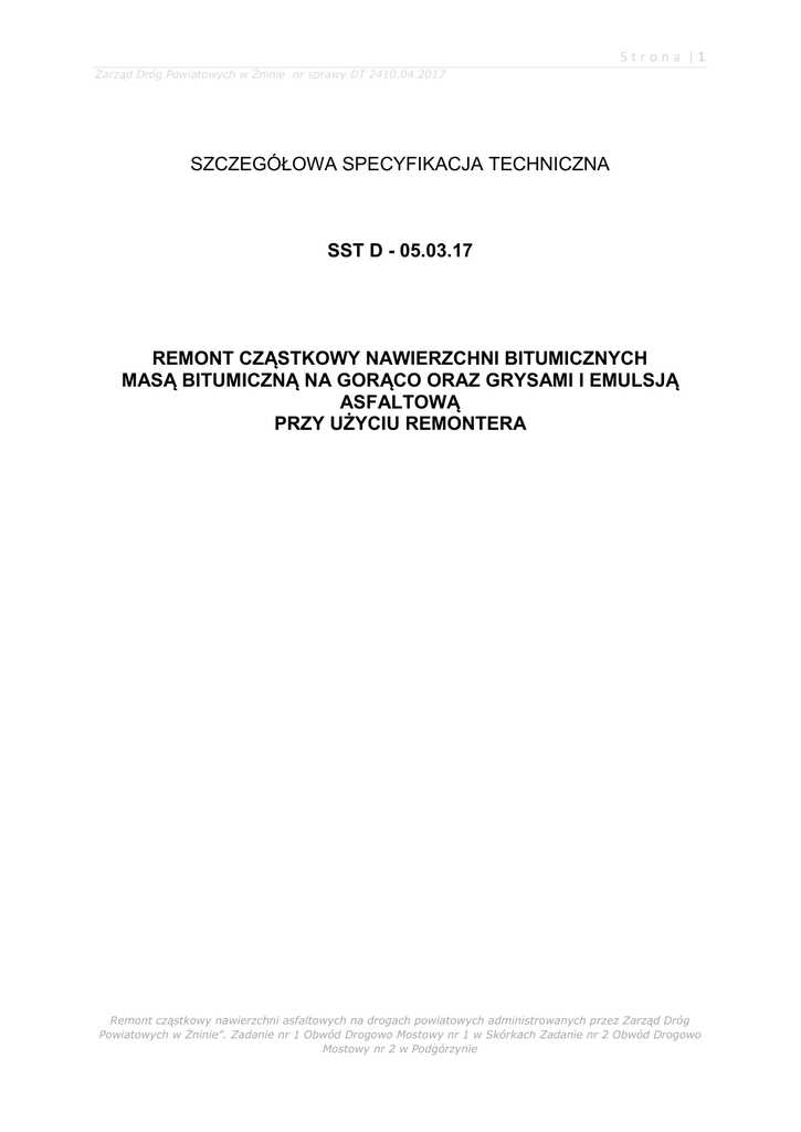 Strona |1 Zarząd Dróg Powiatowych w Żninie nr sprawy DT 2410.04.2017 SZCZEGÓŁOWA SPECYFIKACJA TECHNICZNA SST D - 05.03.17 REMONT CZĄSTKOWY NAWIERZCHNI BITUMICZNYCH MASĄ BITUMICZNĄ NA GORĄCO ORAZ GRYSAMI I EMULSJĄ ASFALTOWĄ PRZY UŻYCIU REMONTERA Remont cząstkowy nawierzchni asfaltowych na drogach powiatowych administrowanych przez Zarząd Dróg Powiatowych w Żninie”. Zadanie nr 1 Obwód Drogowo Mostowy nr 1 w Skórkach Zadanie nr 2 Obwód Drogowo Mostowy nr 2 w Podgórzynie Strona |2 Zarząd Dróg Powiatowych w Żninie nr sprawy DT 2410.04.2017 1. WSTĘP 1.1 .Przedmiot SST Przedmiotem niniejszej szczegółowej specyfikacji technicznej (SST) są wymagania dotyczące wykonania i odbioru robót związanych z remontem cząstkowym nawierzchni bitumicznej przy użyciu remonterów natryskujących pod ciśnieniem (mieszanina grysów z emulsją asfaltową) jak również masą bitumiczną na gorąco bez obcinania krawędzi. dla zadania: pn. Remont cząstkowy nawierzchni asfaltowych na drogach powiatowych administrowanych przez Zarząd Dróg Powiatowych w Żninie”. Zadanie nr 1 Obwód Drogowo Mostowy nr 1 w Skórkach, Zadanie nr 2 Obwód Drogowo Mostowy nr 2 w Podgórzynie 1.2. Zakres stosowania SST Szczegółowa specyfikacja techniczna jest stosowana jako dokument przetargowy i kontraktowy przy zlecaniu i realizacji robót. 1.3. Zakres robót objętych SST Ustalenia zawarte w niniejszej specyfikacji dotyczą zasad prowadzenia robót związanych z wykonaniem i odbiorem remontu cząstkowego nawierzchni bitumicznych wykonanego emulsją asfaltową i grysami frakcji 2-5 mm i 5-8 mm i obejmują: naprawę ubytków, spękań i rakowin, jak również masą bitumiczną na gorąco bez obcinania krawędzi. 1.4. Określenia podstawowe 1.4.1.Remont cząstkowy nawierzchni - zbiorcze określenie obejmujące różne zabiegi techniczne do natychmiastowego wykonania związane z usuwaniem uszkodzeń zagrażających bezpieczeństwu ruchu, jak również zabiegi, o małym zakresie (obejmujące małe powierzchnie) bez istotnego przywracania wartości użytkowych, lecz hamujące proces powiększania się powstałych uszkodzeń bądź ich skutków. Pojęcie "remont cząstkowy nawierzchni mieści się w ogólnym pojęciu "utrzymanie nawierzchni", a to z kolei jest objęte ogólniejszym pojęciem "utrzymanie dróg". 1.4.2. Ubytek - wykruszenie materiału mineralno-bitumicznego na nie większą niż grubość warstwy ścieralnej. 1.4.3. Wybój - wykruszenie materiału mineralno-bitumicznego na głębokość większą niż grubość warstwy ścieralnej max 6 cm. 1.4.4. Kationowa emulsja asfaltowa - lepiszcze bitumiczne w postaci zawiesiny rozproszonego asfaltu w wodzie, otrzymane przez mechaniczne wymieszanie asfaltu z wodą, przy jednoczesnym zastosowaniu emulgatora kationowego. 1.4.5. Emulsja asfaltowa szybkorozpadowa – emulsja charakteryzująca się krótkim czasem rozpadu po zetknięciu się z kruszywem . 1.4.6. Pozostałe określenia są zgodne z obowiązującymi, odpowiednimi polskimi normami i definicjami podanymi w OST D-00.00.00. "Wymagania ogólne". 1.5. Ogólne wymagania dotyczące robót Wykonawca robót jest odpowiedzialny za jakość wykonanych robót obejmujących remont cząstkowy grysami i lepiszczem (emulsją asfaltową) oraz za zgodność z umową i SST. Wprowadzenie jakichkolwiek odstępstw od tych dokumentów wymaga akceptacji Zamawiającego. 2. MATERIAŁY 2.1. Kruszywo Do remontu cząstkowego nawierzchni bitumicznych należy stosować grysy frakcji 2-5 mm i 5-8 mm odpowiadające wymaganiom podanym w PN-EN-13043/2004 ,,Kruszywa do mieszanek bitumicznych Remont cząstkowy nawierzchni asfaltowych na drogach powiatowych administrowanych przez Zarząd Dróg Powiatowych w Żninie”. Zadanie nr 1 Obwód Drogowo Mostowy nr 1 w Skórkach Zadanie nr 2 Obwód Drogowo Mostowy nr 2 w Podgórzynie Strona |3 Zarząd Dróg Powiatowych w Żninie nr sprawy DT 2410.04.2017 i powierzchniowych utrwaleń stosowanych na drogach, lotniskach i innych powierzchniach przeznaczonych do ruchu”. 2.2. Lepiszcza Do remontu cząstkowego należy stosować jako lepiszcze tylko drogowe kationowe emulsje asfaltowe szybkorozpadowe niemodyfikowane rodzaju C 65 BP3 PU/RC i C 69 BP3 PU spełniające wymagania zgodnie z PN-EN 13808:2010. Można stosować tylko emulsje asfaltowe posiadające aprobatę techniczną, wydaną przez uprawnioną jednostkę. 2.2.1. Składowanie lepiszcza Do składowania lepiszczy Wykonawca użyje cystern, pojemników, zbiorników lub beczek. Cysterny, pojemniki, zbiorniki i beczki przeznaczone do składowania emulsji powinny być czyste i nie powinny zawierać resztek innych lepiszczy. Przy przechowywaniu asfaltowej emulsji Wykonawca jest zobowiązany przestrzegać następujące zasady: − czas składowania emulsji nie powinien przekraczać 3 m-cy od daty jej wyprodukowania, − temperatura przechowywania emulsji nie powinna być niższa niż +5o C. 2.3. Masa bitumiczna Głębokie uszkodzenia nawierzchni (ubytki i wyboje) oraz uszkodzenia krawędzi jezdni (obłamania) należy naprawiać mieszankami mineralno-asfaltowymi wytwarzanymi i wbudowywanymi na gorąco. Beton asfaltowy powinien mieć uziarnienie dostosowane do głębokości uszkodzenia(po jego oczyszczeniu z luźnych cząstek nawierzchni i zanieczyszczeń obcych), przy czym największe ziarna w mieszance betonu asfaltowego powinny się mieścić w przedziale od 1/3 do 1/4 głębokości uszkodzenia do 80 mm. Przy głębszych uszkodzeniach należy zastosować odpowiednio dwie lub trzy warstwy betonu asfaltowego wbudowywane oddzielnie o dobranym uziarnieniu i właściwościach fizyko-mechanicznych, dostosowanych do cech remontowanej nawierzchni. Przy obecnym stanie dróg zaleca się zastosowanie mieszanki bitumicznej AC8S/50/70. 3.SPRZĘT 3.1. Specjalistyczny sprzęt do remontu cząstkowego. Przy typowym dla remontów cząstkowych zakresie robót dopuszcza się ręczne rozkładanie mieszanek mineralnobitumicznych przy użyciu łopat, listwowych