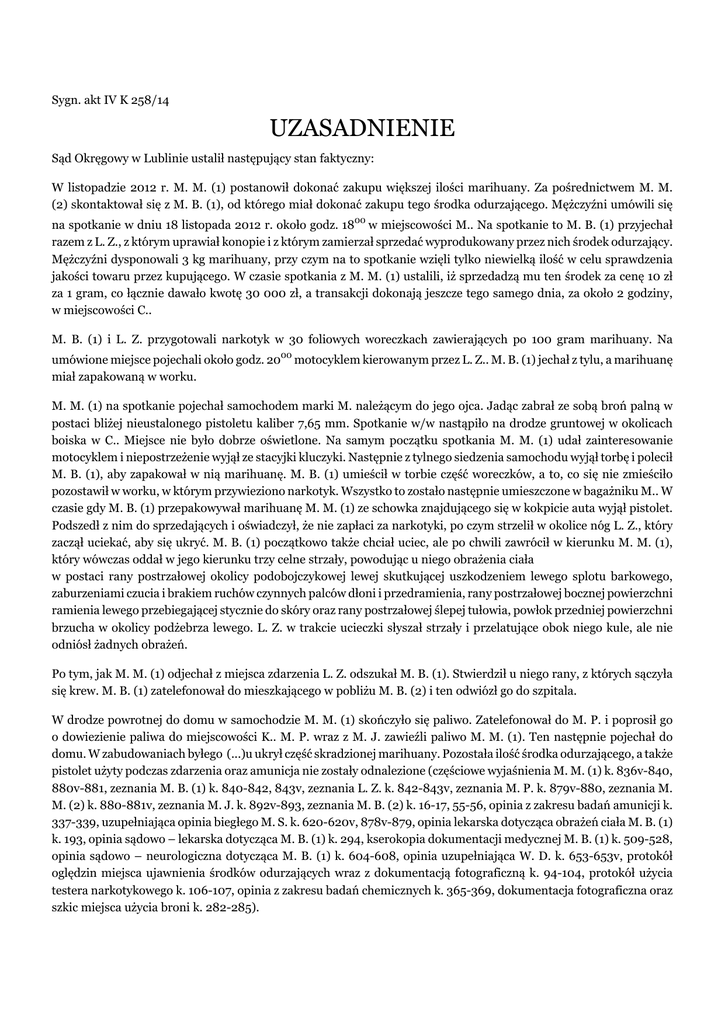 Sygn. akt IV K 258/14 UZASADNIENIE Sąd Okręgowy w Lublinie ustalił następujący stan faktyczny: W listopadzie 2012 r. M. M. (1) postanowił dokonać zakupu większej ilości marihuany. Za pośrednictwem M. M. (2) skontaktował się z M. B. (1), od którego miał dokonać zakupu tego środka odurzającego. Mężczyźni umówili się na spotkanie w dniu 18 listopada 2012 r. około godz. 1800 w miejscowości M.. Na spotkanie to M. B. (1) przyjechał razem z L. Z., z którym uprawiał konopie i z którym zamierzał sprzedać wyprodukowany przez nich środek odurzający. Mężczyźni dysponowali 3 kg marihuany, przy czym na to spotkanie wzięli tylko niewielką ilość w celu sprawdzenia jakości towaru przez kupującego. W czasie spotkania z M. M. (1) ustalili, iż sprzedadzą mu ten środek za cenę 10 zł za 1 gram, co łącznie dawało kwotę 30 000 zł, a transakcji dokonają jeszcze tego samego dnia, za około 2 godziny, w miejscowości C.. M. B. (1) i L. Z. przygotowali narkotyk w 30 foliowych woreczkach zawierających po 100 gram marihuany. Na umówione miejsce pojechali około godz. 2000 motocyklem kierowanym przez L. Z.. M. B. (1) jechał z tylu, a marihuanę miał zapakowaną w worku. M. M. (1) na spotkanie pojechał samochodem marki M. należącym do jego ojca. Jadąc zabrał ze sobą broń palną w postaci bliżej nieustalonego pistoletu kaliber 7,65 mm. Spotkanie w/w nastąpiło na drodze gruntowej w okolicach boiska w C.. Miejsce nie było dobrze oświetlone. Na samym początku spotkania M. M. (1) udał zainteresowanie motocyklem i niepostrzeżenie wyjął ze stacyjki kluczyki. Następnie z tylnego siedzenia samochodu wyjął torbę i polecił M. B. (1), aby zapakował w nią marihuanę. M. B. (1) umieścił w torbie część woreczków, a to, co się nie zmieściło pozostawił w worku, w którym przywieziono narkotyk. Wszystko to zostało następnie umieszczone w bagażniku M.. W czasie gdy M. B. (1) przepakowywał marihuanę M. M. (1) ze schowka znajdującego się w kokpicie auta wyjął pistolet. Podszedł z nim do sprzedających i oświadczył, że nie zapłaci za narkotyki, po czym strzelił w okolice nóg L. Z., który zaczął uciekać, aby się ukryć. M. B. (1) początkowo także chciał uciec, ale po chwili zawrócił w kierunku M. M. (1), który wówczas oddał w jego kierunku trzy celne strzały, powodując u niego obrażenia ciała w postaci rany postrzałowej okolicy podobojczykowej lewej skutkującej uszkodzeniem lewego splotu barkowego, zaburzeniami czucia i brakiem ruchów czynnych palców dłoni i przedramienia, rany postrzałowej bocznej powierzchni ramienia lewego przebiegającej stycznie do skóry oraz rany postrzałowej ślepej tułowia, powłok przedniej powierzchni brzucha w okolicy podżebrza lewego. L. Z. w trakcie ucieczki słyszał strzały i przelatujące obok niego kule, ale nie odniósł żadnych obrażeń. Po tym, jak M. M. (1) odjechał z miejsca zdarzenia L. Z. odszukał M. B. (1). Stwierdził u niego rany, z których sączyła się krew. M. B. (1) zatelefonował do mieszkającego w pobliżu M. B. (2) i ten odwiózł go do szpitala. W drodze powrotnej do domu w samochodzie M. M. (1) skończyło się paliwo. Zatelefonował do M. P. i poprosił go o dowiezienie paliwa do miejscowości K.. M. P. wraz z M. J. zawieźli paliwo M. M. (1). Ten następnie pojechał do domu. W zabudowaniach byłego (...)u ukrył część skradzionej marihuany. Pozostała ilość środka odurzającego, a także pistolet użyty podczas zdarzenia oraz amunicja nie zostały odnalezione (częściowe wyjaśnienia M. M. (1) k. 836v-840, 880v-881, zeznania M. B. (1) k. 840-842, 843v, zeznania L. Z. k. 842-843v, zeznania M. P. k. 879v-880, zeznania M. M. (2) k. 880-881v, zeznania M. J. k. 892v-893, zeznania M. B. (2) k. 16-17, 55-56, opinia z zakresu badań amunicji k. 337-339, uzupełniająca opinia biegłego M. S. k. 620-620v, 878v-879, opinia lekarska dotycząca obrażeń ciała M. B. (1) k. 193, opinia sądowo – lekarska dotycząca M. B. (1) k. 294, kserokopia dokumentacji medycznej M. B. (1) k. 509-528, opinia sądowo – neurologiczna dotycząca M. B. (1) k. 604-608, opinia uzupełniająca W. D. k. 653-653v, protokół oględzin miejsca ujawnienia środków odurzających wraz z dokumentacją fotograficzną k. 94-104, protokół użycia testera narkotykowego k. 106-107, opinia z zakresu badań chemicznych k. 365-369, dokumentacja fotograficzna oraz szkic miejsca użycia broni k. 282-285). Oskarżony M. M. (1) podczas pierwszego przesłuchania w charakterze podejrzanego o czyn z art. 13§1 k.k. w zw. z art. 148§1 k.k. przyznał się do popełnienia zarzucanego mu czynu. Wyjaśniając podał okoliczności nawiązania kontaktu z M. B. (1) i przedstawił swoją wersję zdarzenia. Podał, iż wracając z tego pierwszego spotkania uznał, iż ma do czynienia z osobami, które może okraść z towaru. Jadąc już na to drugie spotkanie nie zabrał ze sobą pieniędzy, lecz pistolet, aby ich trochę postraszyć. Broń kupił około roku wcześniej na bazarze w L.. Kupił też wtedy 250 sztuk amunicji, za co łącznie zapłacił 6 000 zł. Dodał, że po przyjeździe na miejsce i zapakowaniu marihuany do bagażnika oświadczył, iż nie zapłaci za nią. Wtedy L. Z. próbował zadać mu cios, a M. B. (1) zaczął się z nim szarpać. Uderzenia nie uniknął, otrzymał cios w twarz, ale udało mu się przewrócić M. B. (1). Wtedy wyjął broń z kieszeni kurtki i strzelił jeden raz w powietrze. Obaj mężczyźni zaczęli uciekać, jednak po chwili M. B. (1) zawrócił. Strzelił mu wtedy pod nogi, lecz ten tylko się cofnął. Wówczas oddał kolejno trzy strzały w jego kierunku. Ponieważ L. Z. w tym czasie rzucał w niego kamieniami strzelił też raz w jego kierunku. Następnie wsiadł do samochodu i odjechał. Wtedy też została rozbita tylna szyba w jego aucie. Dodał, że pojechał potem do domu, ukrył marihuanę, a broń wrzucił do rzeki w odległości około 2 k