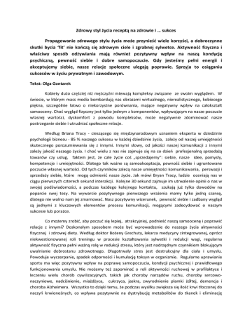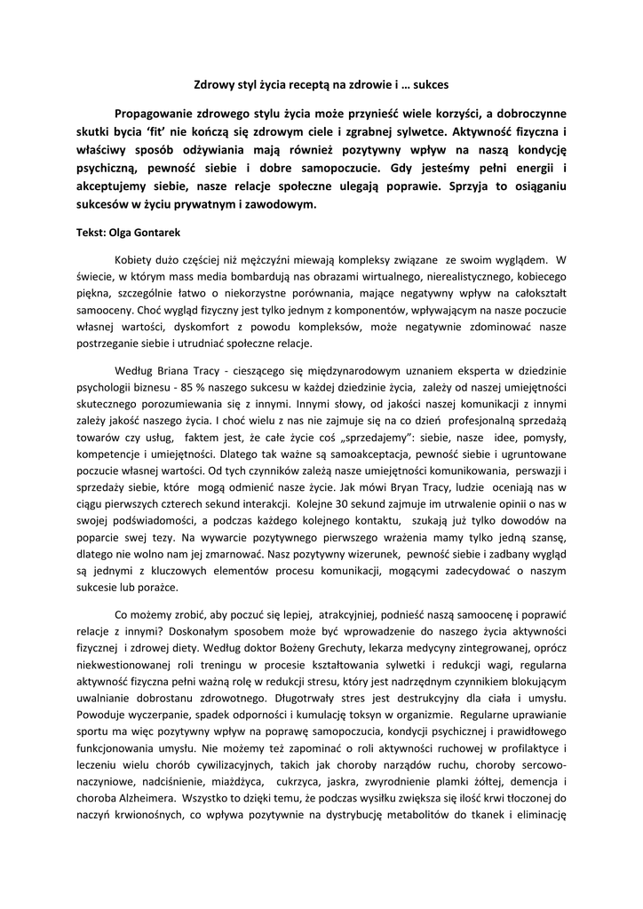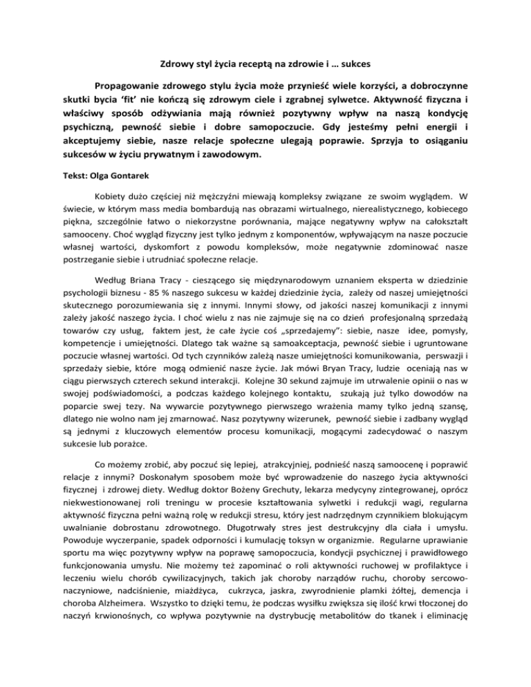Zdrowy styl życia receptą na zdrowie i … sukces Propagowanie zdrowego stylu życia może przynieść wiele korzyści, a dobroczynne skutki bycia ‘fit’ nie kończą się zdrowym ciele i zgrabnej sylwetce. Aktywność fizyczna i właściwy sposób odżywiania mają również pozytywny wpływ na naszą kondycję psychiczną, pewność siebie i dobre samopoczucie. Gdy jesteśmy pełni energii i akceptujemy siebie, nasze relacje społeczne ulegają poprawie. Sprzyja to osiąganiu sukcesów w życiu prywatnym i zawodowym. Tekst: Olga Gontarek Kobiety dużo częściej niż mężczyźni miewają kompleksy związane ze swoim wyglądem. W świecie, w którym mass media bombardują nas obrazami wirtualnego, nierealistycznego, kobiecego piękna, szczególnie łatwo o niekorzystne porównania, mające negatywny wpływ na całokształt samooceny. Choć wygląd fizyczny jest tylko jednym z komponentów, wpływającym na nasze poczucie własnej wartości, dyskomfort z powodu kompleksów, może negatywnie zdominować nasze postrzeganie siebie i utrudniać społeczne relacje. Według Briana Tracy - cieszącego się międzynarodowym uznaniem eksperta w dziedzinie psychologii biznesu - 85 % naszego sukcesu w każdej dziedzinie życia, zależy od naszej umiejętności skutecznego porozumiewania się z innymi. Innymi słowy, od jakości naszej komunikacji z innymi zależy jakość naszego życia. I choć wielu z nas nie zajmuje się na co dzień profesjonalną sprzedażą towarów czy usług, faktem jest, że całe życie coś „sprzedajemy”: siebie, nasze idee, pomysły, kompetencje i umiejętności. Dlatego tak ważne są samoakceptacja, pewność siebie i ugruntowane poczucie własnej wartości. Od tych czynników zależą nasze umiejętności komunikowania, perswazji i sprzedaży siebie, które mogą odmienić nasze życie. Jak mówi Bryan Tracy, ludzie oceniają nas w ciągu pierwszych czterech sekund interakcji. Kolejne 30 sekund zajmuje im utrwalenie opinii o nas w swojej podświadomości, a podczas każdego kolejnego kontaktu, szukają już tylko dowodów na poparcie swej tezy. Na wywarcie pozytywnego pierwszego wrażenia mamy tylko jedną szansę, dlatego nie wolno nam jej zmarnować. Nasz pozytywny wizerunek, pewność siebie i zadbany wygląd są jednymi z kluczowych elementów procesu komunikacji, mogącymi zadecydować o naszym sukcesie lub porażce. Co możemy zrobić, aby poczuć się lepiej, atrakcyjniej, podnieść naszą samoocenę i poprawić relacje z innymi? Doskonałym sposobem może być wprowadzenie do naszego życia aktywności fizycznej i zdrowej diety. Według doktor Bożeny Grechuty, lekarza medycyny zintegrowanej, oprócz niekwestionowanej roli treningu w procesie kształtowania sylwetki i redukcji wagi, regularna aktywność fizyczna pełni ważną rolę w redukcji stresu, który jest nadrzędnym czynnikiem blokującym uwalnianie dobrostanu zdrowotnego. Długotrwały stres jest destrukcyjny dla ciała i umysłu. Powoduje wyczerpanie, spadek odporności i kumulację toksyn w organizmie. Regularne uprawianie sportu ma więc pozytywny wpływ na poprawę samopoczucia, kondycji psychicznej i prawidłowego funkcjonowania umysłu. Nie możemy też zapominać o roli aktywności ruchowej w profilaktyce i leczeniu wielu chorób cywilizacyjnych, takich jak choroby narządów ruchu, choroby sercowonaczyniowe, nadciśnienie, miażdżyca, cukrzyca, jaskra, zwyrodnienie plamki żółtej, demencja i choroba Alzheimera. Wszystko to dzięki temu, że podczas wysiłku zwiększa się ilość krwi tłoczonej do naczyń krwionośnych, co wpływa pozytywnie na dystrybucję metabolitów do tkanek i eliminację toksyn. Ponadto, wraz z krwią dociera do komórek więcej tlenu, który usprawnia procesy neuronalne, a także spowalnia procesy starzenia się organizmu. Ale aktywność fizyczna to nie wszystko. Doktor Bożena Grechuta podkreśla też niebagatelne znaczenie prawidłowego i zdrowego odżywiania, bez którego niemożliwe jest osiągnięcie i utrzymanie dobrej kondycji psychofizycznej. Dokonując zmian w naszym jadłospisie, powinnyśmy wykonać szereg badań, w tym testy na nietolerancję pokarmową, a także uwzględnić typ metabolizmu i historię chorób w rodzinie. Dopiero rzetelny, pogłębiony wywiad daje podstawę do udzielenia pacjentowi szczegółowych wskazówek żywieniowych. Powinniśmy natomiast zawsze pamiętać, aby jeść często, mało, dokładnie przeżuwać i nie łączyć w jednym posiłku białka z węglowodanami. Nie należy pić w trakcie posiłku i spożywać ich przed snem. Wskazane jest również picie od 1,5 do 2 litrów wody dziennie i rozpoczynanie snu przed północą. Właściwy dobór treningu i diety powinien być odpowiedzią na specyficzne potrzeby i problemy każdej kobiety. W tej kwestii najlepiej oddać się w ręce dobrego specjalisty, aby nie tracić czasu na samodzielne eksperymenty i szybciej osiągnąć pożądane rezultaty. Pamiętajmy, że zdrowy styl życia musi w pierwszej kolejności zakładać odreagowywanie stresu. Umiejętność radzenia sobie z nim, stanowi wyzwanie naszych czasów. Dbajmy więc o siebie i uprawiajmy sport, bo gdy tryskamy zdrowiem i energią, z chęcią zerkamy w lutro. A kiedy lubimy siebie, nasze relacje biznesowe i rodzinne ulegają poprawie. I nawet jeśli nie osiągniemy o razu znaczących, wizualnych efektów, zrekompensują nam to hormony szczęścia – endorfiny, dbając o nasze świetne samopoczucie. Więc nie poddawajmy się, bo „w zdrowym ciele zdrowy duch”.