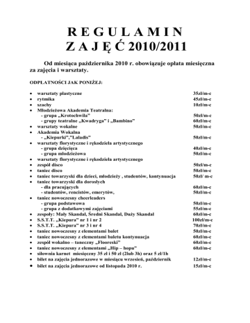 REGULAMIN Z A J Ę Ć 2010/2011 Od miesiąca października 2010 r. obowiązuje opłata miesięczna za zajęcia i warsztaty. ODPŁATNOŚCI JAK PONIŻEJ: warsztaty plastyczne rytmika szachy Młodzieżowa Akademia Teatralna: - grupa „Krotochwila” - grupy teatralne „Kwadryga” i „Bambino” warsztaty wokalne Akademia Wokalna - „Kiepurki”,”Laladis” warsztaty florystyczne i rękodzieła artystycznego - grupa dzięcięca - grupa młodzieżowa warsztaty florystyczne i rękodzieła artystycznego zespół disco taniec disco taniec towarzyski dla dzieci, młodzieży , studentów, kontynuacja taniec towarzyski dla dorosłych - dla pracujących - studentów, rencistów, emerytów, taniec nowoczesny cheerleaders - grupa podstawowa - grupa z dodatkowymi zajęciami zespoły: Mały Skandal, Średni Skandal, Duży Skandal S.S.T.T. „Kiepura” nr 1 i nr 2 S.S.T.T. „Kiepura” nr 3 i nr 4 taniec nowoczesny z elementami balet taniec nowoczesny z elementami baletu kontynuacja zespół wokalno – taneczny „Flooreski” taniec nowoczesny z elementami „Hip – hopu” siłownia karnet miesięczny 35 zł i 50 zł (2lub 3h) oraz 5 zł/1h bilet na zajęcia jednorazowe w miesiącu wrzesień, październik bilet na zajęcia jednorazowe od listopada 2010 r. 35zł/m-c 45zł/m-c 10zł/m-c 50zł/m-c 60zł/m-c 50zł/m-c 50zł/m-c 40zł/m-c 50zł/m-c 50zł/m-c 50zł/m-c 50zł/ m-c 60zł/m-c 50zł/m-c 50zł/m-c 55zł/m-c 60zł/m-c 100zł/m-c 70zł/m-c 50zł/m-c 60zł/m-c 60zł/m-c 60zł/m-c 12zł/m-c 15zł/m-c REGULAMIN KORZYSTANIA Z ZAJĘĆ 1. 2. 3. 4. 5. 6. 7. 8. 9. 10. 11. 12. 13. 14. 15. 16. 17. 18. 19. 20. 21. 22. 23. 24. 25. 26. 27. 28. 29. 30. Wysokość opłat za zajęcia w Miejskim Klubie im. Jana Kiepury reguluje cennik jak powyżej. Wniesienie opłaty za uczestnictwo w zajęciach jest jednoczesną akceptacją niniejszego regulaminu. Opłaty wnoszone są do 15. dnia miesiąca br. po tym terminie klub będzie naliczał odsetki ustawowe W przypadku wcześniejszego uiszczenia należy okazać dowód wpłaty instruktorowi na zajęciach. Podczas dłuższej nieobecności na zajęciach (tj. 2 kolejne lekcje i więcej) można ubiegać się o proporcjonalnie obniżenie opłaty w danym miesiącu lub w miesiącu następnym. Ubieganie się o obniżkę dotyczy tylko formy pisemnej, w której rodzic - opiekun pisze prośbę do Dyrektora Klubu o obniżenie opłaty. Instruktor zajęć potwierdza podpisem prośbę rodzica i zgodność, co do faktycznego stanu nieobecności uczestnika/uczestniczki podczas zajęć. Opłaty za zajęcia pobierane są w sekretariacie Klubu (pokój nr 24) lub na holu głównym przez kasjera. Każda opłata za zajęcia, potwierdzona jest wydaniem karnetu, dowodu wpłaty. Dyrektor Klubu może obniżyć opłatę za dany miesiąc w przypadku: - grudniowych świąt, - ferii dla dzieci i młodzieży - w miesiącu czerwcu (z powodu wakacji) Zwolnienie z opłat nie dotyczy świąt zaznaczonych w kalendarzu na czerwono czyli tzw. „świąt ruchomych”, które regulowane są ustawowo (dzień wolny od pracy oraz w szkole). W czasie wakacji i ferii (2 tygodnie) Klub prowadzi bezpłatnie zajęcia, w których mogą nieodpłatnie uczestniczyć zainteresowani członkowie poszczególnych grup i sekcji Miejskiego Klubu. Opłaty za zajęcia mogą być dokonywane przelewem bezpośrednio na numer konta Miejskiego Klubu im. Jana Kiepury w Sosnowcu, ul. Będzińska 6 - nr konta: ING Bank Śląski 11 1050 1360 1000 0008 0002 6197 Przelew powinien być opisany imieniem i nazwiskiem dziecka, rodzajem zajęć i grupą oraz miesiącem za który dotyczy wpłata. Nadpłata w przelewie przechodzi na kolejny miesiąc i kwota kolejnej wpłaty przelewu powinna być pomniejszona o zaistniałą nadpłatę. Brak wpłaty za jeden miesiąc skutkuje wezwaniem do zapłaty, w przypadku dalszego braku wpłaty wykreśleniem z listy uczestników zajęć. Instruktor przed zajęciami zobowiązany jest do: prowadzenia na bieżąco listy obecności, sprawdzenia karnetów z wpłatami, z możliwością wyproszenia z zajęć w przypadku braku wpłaty, a tym bardziej zaległych wpłat. Instruktor ponosi odpowiedzialność za wszelkie ewentualne szkody (sala, przylegająca do Sali szatnia oraz sprzęt na wyposażeniu tych pomieszczeń), wynikłe podczas prowadzonych przez niego zajęć. Dokumentem stwierdzającym obecność na zajęciach jest prowadzona przez instruktora lista obecności. W przypadku odwołania zajęć, instruktor zobowiązany jest przeprowadzić je w innym dogodnym terminie tak, aby wpłacona wcześniej opłata za ww. zajęcia nie była tematem spornym. Uczestnik, który w terminie uiszcza należne opłaty, ma zagwarantowane prawo uczestnictwa w zajęciach, zapewnioną opiekę instruktora oraz możliwość korzystania z pomieszczeń i części niezbędnych materiałów. Obowiązkiem uczestnika jest dbałość o bieżące uzupełnienie wpisów i okazywanie karnetu instruktorom oraz personelowi i administracji Klubu. Na bieżąco uzupełniany karnet stanowi dowód, że jego posiadacz jest czynnym uczestnikiem grupy. Uczestnik nie może odstępować opłaconych zajęć osobom trzecim. Na zajęciach obowiązuje obuwie zmienne. Warunkiem uczestnictwa w zajęciach jest akceptacja niniejszego regulaminu, terminowe wniesienie opłaty oraz przestrzeganie norm społecznych wobec innych osób, a także przepisów BHP i przeciwpożarowych, obwiązujących we wszystkich pomieszczeniach. Uciążliwi (utrudniający innym korzystanie z zajęć i nie przestrzegający przepisów porządkowych) uczestnicy, mogą zostać skreśleni z listy zajęć, jeśli nie odniosą skutku wcześniejsze słowne upomnienia. W imieniu małoletnich uczestników sprawy odpłatności za zajęcia, a także inne sprawy organizacyjne załatwiane są przez ich rodziców lub prawnych opiekunów, którzy ponoszą także odpowiedzialność za stan zdrowia i zachowanie swoich wychowanków na terenie obiektu. Prosimy wszystkich rodziców o podanie dokładnego a