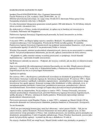 DAROWANEMU KONIOWI W ZĘBY [podpis] Paweł KWAŚNIEWSKI; Rys. Zygmunt Januszewski Gazeta Wyborcza nr 226, wydanie z dnia 28/09/1994 , str. 12 Minister prywatyzacji przyznaje, że z jego winy 10 mln ECU darowane Polsce przez Unię Europejską od prawie roku leży w Brukseli. Co roku biznesmeni lokują poza granicami swoich państw 200 mld dolarów. To 44 biliony złotych (dwie czwórki i dwanaście zer). By ulokowali je w Polsce, trzeba ich przekonać, że opłaca się to bardziej niż inwestycje w Czechach, Pakistanie lub Singapurze. Państwowa Agencja Inwestycji Zagranicznych powstała, by kusić inwestorów ze świata. Lord wyrozumiały 6 stycznia 1994 r. na Okęciu ląduje rejsowy samolot z Brukseli. Na pokładzie sir Leon Brittan, wiceprzewodniczący Unii Europejskiej. Przyleciał do Polski na kilka godzin. W siedzibie Państwowej Agencji Inwestycji Zagranicznych ma podpisać memorandum finansowe, czyli umowę o przekazaniu agencji 10 mln ECU na promowanie Polski w świecie. Wiesław Kaczmarek, minister przekształceń własnościowych, zjawia się na uroczystości w ostatniej chwili. Tuż przed podpisaniem dokumentu, już na sali, zgłasza zastrzeżenia do treści umowy. - Wyglądało to, jakby minister minutę wcześniej przeczytał, co podpisuje. Groził skandal dyplomatyczny - opowiada świadek uroczystości. Sir Brittanowi zależało na umowie. - Podpisał, ale wszyscy widzieli, jak mu drży ze zdenerwowania kącik ust. Jego wyrozumiałość dla niekompetencji ministra Kaczmarka nic nie dała. Minęło prawie dziesięć miesięcy - 10 mln ECU wciąż leży w brukselskim banku, a Państwowa Agencja Inwestycji Zagranicznych nie ma za co przyciągać biznesmenów. Agencja za agencję Do czerwca 1991 r. obcokrajowcy potrzebowali zezwolenia na działalność gospodarczą w Polsce. Pozwolenia i koncesje wydawała Agencja ds. Inwestycji Zagranicznych. W czerwcu 1991 r. Sejm przegłosował ustawę o spółkach z udziałem zagranicznym - przedsiębiorcy-cudzoziemcy mogą inwestować bez zgody agencji. Koncesji wymaga tylko działalność w kilku sektorach, m.in. w zarządzaniu portami morskimi i lotniczymi, poradnictwie prawnym, pośrednictwie i obrocie nieruchomościami. Zezwolenia wymaga też kupno akcji prywatyzowanych przedsiębiorstw. Agencja stała się niepotrzebna. Na jej miejsce w marcu 1992 r. Tomasz Gruszecki, ówczesny minister przekształceń własnościowych, powołał Państwową Agencję Inwestycji Zagranicznych, spółkę akcyjną w 100 proc. należącą do skarbu państwa. Właściciela reprezentuje minister przekształceń własnościowych. Pierwszym prezesem został Bogdan Chojna, w maju 1993 r. zastępuje go Marek Górski (28 lat, absolwent ekonomii na Uniwersytecie Gdańskim, praktyka bankowa w Niemczech i Szwajcarii). Tu nie Kostaryka - PAIZ nie jest instytucją komercyjną, musi być dotowany - mówi prezes Górski. - Tak jest na całym świecie, oprócz Kostaryki. Przecież biznesmen nie może płacić agencji za to, że chce zainwestować swoje pieniądze w Polsce. Gdy zostałem prezesem, nie mieliśmy prawie pieniędzy na działalność, przejadaliśmy 5 mld zł kapitału zakładowego. Potem Wiesław Kaczmarek, jeszcze jako poseł, był przychylny agencji - wystarał się dla nas o dodatkowe 10 mld zł. Na więcej z budżetu PAIZ nie mógł liczyć. Marek Górski szukał więc pieniędzy za granicą. I znalazł - Unia Europejska zgodziła się podarować 10 mln ECU z Funduszu PHARE. Strona polska miała dorzucić 50 mld zł - równowartość 2 mln ECU. Wszyscy święci się zgodzili - Są dwa aspekty obcych inwestycji - mówi prezes Górski. - Pierwszy to aspekt polityczny - który sektor gospodarki uznać za strategiczny i w związku z tym ograniczyć dostęp obcego kapitału: energetykę, motoryzację, przemysł tytoniowy, obronny? To należy do rządu i PAIZ tym się nie zajmuje. Drugi aspekt to sposoby promocji kraju na zewnątrz i ułatwienie biznesmenom poruszania się w gąszczu naszego prawa, bo inwestor błąka się po Polsce i nie wie, co i gdzie załatwić. Unia Europejska nie lubi wydawać pieniędzy w ciemno. PAIZ musiał przygotować strategię działania. Powstał INVESTPROM - 42-stronicowy kompleksowy projekt promocji Polski w świecie i obsługi klienta w kraju. - Stworzyliśmy system przejrzystych procedur, żeby inwestor nie czuł się zagubiony, a urzędnik państwowy nie bał się podejmować decyzji - mówi wiceprezes Andrzej Sadkowski (29 lat, absolwent stosunków międzynarodowych w University of Boston i zarządzania w University of Illinois, w PAIZ od początku jej istnienia). - Zagranicznym biznesmenom znajdujemy lokalizacje dla ich inwestycji i polskich partnerów chętnych do udziału w joint venture. Opracowaliśmy program prezentacji Polski w zachodnich pismach ekonomicznych, na targach międzynarodowych, itp. INVESTPROM został zaakceptowany przez "wszystkich świętych" - Unię Europejską i naszą Radę Ministrów. Pod koniec grudnia zeszłego roku Ministerstwo Przekształceń Własnościowych przekazało PAIZ pierwszą ratę obiecanej dotacji - 25 mld zł. W styczniu przyleciał z Brukseli sir Leon Brittan, wiceprzewodniczący Unii Europejskiej, i podpisał z min. Kaczmarkiem memorandum finansowe. Lordowi drżał kącik ust, gdy minister obiecywał przesłać na piśmie swoje wątpliwości w ciągu dwóch tygodni. Lord Brittan czekał na pismo ministra prawie miesiąc. Bój o PAO W piśmie minister Kaczmarek zgłosił sześć drobnych zastrzeżeń. Najistotniejsze dotyczyło mianowania Project Authorising Officer (PAO) - osoby odpowiedzialnej za realizację programu INVESTPROM. W umowie ze stycznia br. jest zapis: "Minister przekształceń własnościowych, jako PAO, przekaże te uprawnienia prezesowi PAIZ". Ten zapis wprowadziło do umowy Ministerstwo Przekształceń Własnościowych. Minister przekształceń własnościowych mówi: - Dla mnie jest niezrozumiałe - wydatkujący ma być organem kontrolującym? Z instrukcji Uni
