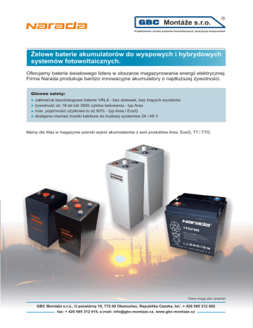 Montáže s.r.o. Projektowanie i montaz systemów fotowoltaicznych, dystrybucja komponentów Żelowe baterie akumulatorów do wyspowych i hybrydowych systemów fotowoltaicznych. Oferujemy baterie światowego lidera w obszarze magazynowania energii elektrycznej. Firma Narada produkuje bardzo innowacyjne akumulatory o najdłuższej żywotności. Główne zalety: całkowicie bezobsługowe baterie VRLA - bez dolewek, bez żrących wycieków żywotność do 18 lat lub 3600 cyklów ładowania - typ Ares max. pojemność użytkowa to aż 80% - typ Ares i EosG dostępne również mostki kablowe do budowy systemów 24 i 48 V Mamy dla Was w magazynie szeroki wybór akumulatorów z serii produktów Ares, EosG, TT i TTG. Dane mogą ulec zmianie! GBC Montáže s.r.o., U panelárny 10, 772 00 Ołomuniec, Republika Czeska, tel.: + 420 585 312 662 fax: + 420 585 312 915, e-mail: [email protected], www.gbc-montaze.cz Montáže s.r.o. Projektowanie i montaz systemów fotowoltaicznych, dystrybucja komponentów Parametry techniczne Seria Ares dla klientów o najwyższych wymaganiach, dla najdłuższej żywotności i maksymalnej użyteczności wypełnione specjalnym opatentowanym żelem do 3600 cykli ładowania przy 50% głębokości rozładowania baterii Typ NR katalog. 4OPzV200 G-601-10 Napięcie Pojemność Głębokość (V) C10 (Ah) rozładowania (%) 2 200 Wymiary (mm) Waga Żywotność* (kg) 80 103x206x357 20 18 lat 28 18 lat 6OPzV300 G-601-11 2 300 80 145x206x357 7OPzV500 G-601-13 2 500 80 166x206x473 41 18 lat 8OPzV800 G-601-15 2 800 80 191x210x646 67 18 lat 10OPzV1000 G-601-16 2 1000 80 233x210x646 81 18 lat Seria EosG oferuje wyjątkową wydajność przy niższej cenie w porównaniu do serii Ares żywotność do 15 lat w trybie podtrzymania do 1200 cykli ładowania przy 80% głębokości rozładowania baterii Typ NR katalog. EosG200 G-601-20 EosG300 G-601-21 Napięcie Pojemność Głębokość (V) C10 (Ah) rozładowania (%) 2 2 300 Waga Żywotność* (kg) 80 95x185x372 14,5 15 lat 80 123x185x372 19,5 15 lat 15 lat 400 80 166x185x372 26,5 2 600 80 223x185x372 37,5 15 lat 2 1200 80 225x229x566 75,5 15 lat EosG400 G-601-23 2 EosG600 G-601-25 EosG1200 G-601-26 Seria TTG 200 Wymiary (mm) baterie blokowe dla małych i średnich instalacji prosta budowa systemów ze względu na kompaktowe rozwiązania baterii Waga Żywotność* (kg) Typ NR katalog. TTG6V105 G-601-50 6 105 40-60 194x170x205 19 12lat TTG6V195 G-601-51 6 195 40-60 306x169x224 32 12 lat TTG6V200 G-601-52 6 200 40-60 320x177x226 35 12 lat TTG12V52 G-601-53 12 52 40-60 220x121x243 18 12 lat TTG12V93 G-601-54 12 93 40-60 308x168x219 32 12 lat Seria TT Napięcie Pojemność Głębokość (V) C10 (Ah) rozładowania (%) Wymiary (mm) kolejna seria kompaktowych akumulatorów o bardzo wydajnej technologii firmy Narada w przystępnej cenie Waga Żywotność* (kg) Typ NR katalog. TT6V200 G-601-62 6 200 50 320x177x229 34,5 12lat TT12V50 G-601-64 12 50 50 228x139x205 17,5 12 lat TT12V93 G-601-67 12 93 50 341x173x216 36 12 lat 345x172x278 45 12 lat 345x172x278 51 12 lat TT12V125 TT12V140 G-601-68 G-601-69 Napięcie Pojemność Głębokość (V) C10 (Ah) rozładowania (%) 12 12 125 140 50 50 Wymiary (mm) Zaznaczone produkty są dostępne na magazynie do natychmiastowego odbioru. * Żywotność akumulatorów z w pełni naładowanymi ogniwami: 2,25 V / ogniwo. Dane mogą ulec zmianie! GBC Montáže s.r.o., U panelárny 10, 772 00 Ołomuniec, Republika Czeska, tel.: + 420 585 312 662 fax: + 420 585 312 915, e-mail: [email protected], www.gbc-montaze.cz