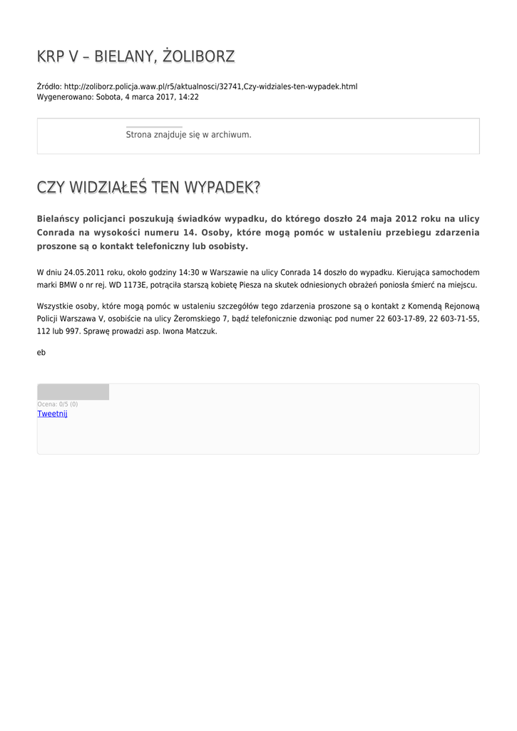 KRP V – BIELANY, ŻOLIBORZ Źródło: http://zoliborz.policja.waw.pl/r5/aktualnosci/32741,Czy-widziales-ten-wypadek.html Wygenerowano: Sobota, 4 marca 2017, 14:22 Strona znajduje się w archiwum. CZY WIDZIAŁEŚ TEN WYPADEK? Bielańscy policjanci poszukują świadków wypadku, do którego doszło 24 maja 2012 roku na ulicy Conrada na wysokości numeru 14. Osoby, które mogą pomóc w ustaleniu przebiegu zdarzenia proszone są o kontakt telefoniczny lub osobisty. W dniu 24.05.2011 roku, około godziny 14:30 w Warszawie na ulicy Conrada 14 doszło do wypadku. Kierująca samochodem marki BMW o nr rej. WD 1173E, potrąciła starszą kobietę Piesza na skutek odniesionych obrażeń poniosła śmierć na miejscu. Wszystkie osoby, które mogą pomóc w ustaleniu szczegółów tego zdarzenia proszone są o kontakt z Komendą Rejonową Policji Warszawa V, osobiście na ulicy Żeromskiego 7, bądź telefonicznie dzwoniąc pod numer 22 603-17-89, 22 603-71-55, 112 lub 997. Sprawę prowadzi asp. Iwona Matczuk. eb Ocena: 0/5 (0) Tweetnij
