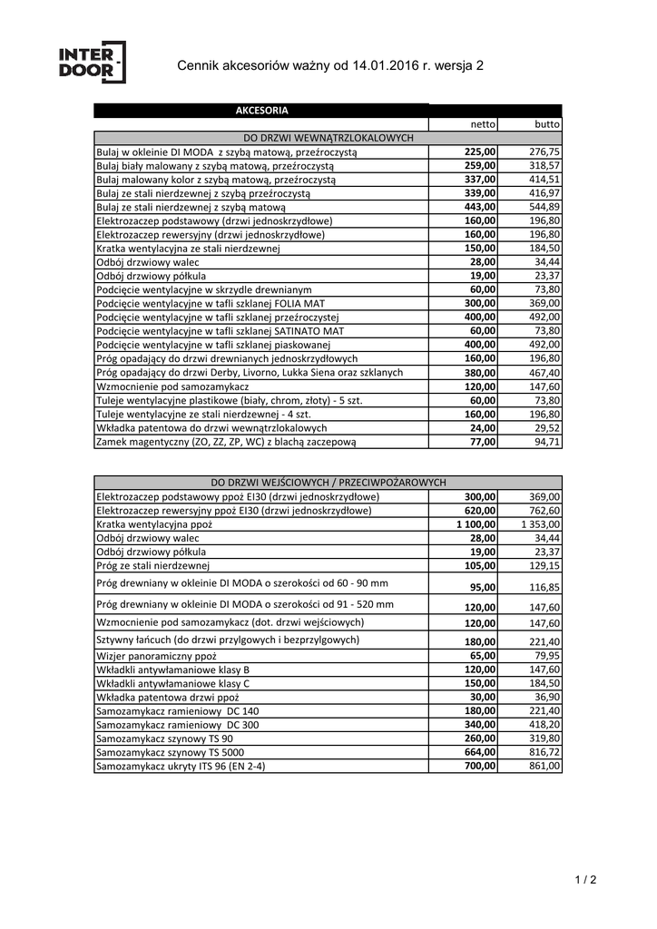 Cennik akcesoriów ważny od 14.01.2016 r. wersja 2 AKCESORIA netto butto 225,00 259,00 337,00 339,00 443,00 160,00 160,00 150,00 28,00 19,00 60,00 300,00 400,00 60,00 400,00 160,00 380,00 120,00 60,00 160,00 24,00 77,00 276,75 318,57 414,51 416,97 544,89 196,80 196,80 184,50 34,44 23,37 73,80 369,00 492,00 73,80 492,00 196,80 467,40 147,60 73,80 196,80 29,52 94,71 DO DRZWI WEJŚCIOWYCH / PRZECIWPOŻAROWYCH 300,00 Elektrozaczep podstawowy ppoż EI30 (drzwi jednoskrzydłowe) 620,00 Elektrozaczep rewersyjny ppoż EI30 (drzwi jednoskrzydłowe) 1 100,00 Kratka wentylacyjna ppoż 28,00 Odbój drzwiowy walec 19,00 Odbój drzwiowy półkula 105,00 Próg ze stali nierdzewnej 369,00 762,60 1 353,00 34,44 23,37 129,15 DO DRZWI WEWNĄTRZLOKALOWYCH Bulaj w okleinie DI MODA z szybą matową, przeźroczystą Bulaj biały malowany z szybą matową, przeźroczystą Bulaj malowany kolor z szybą matową, przeźroczystą Bulaj ze stali nierdzewnej z szybą przeźroczystą Bulaj ze stali nierdzewnej z szybą matową Elektrozaczep podstawowy (drzwi jednoskrzydłowe) Elektrozaczep rewersyjny (drzwi jednoskrzydłowe) Kratka wentylacyjna ze stali nierdzewnej Odbój drzwiowy walec Odbój drzwiowy półkula Podcięcie wentylacyjne w skrzydle drewnianym Podcięcie wentylacyjne w tafli szklanej FOLIA MAT Podcięcie wentylacyjne w tafli szklanej przeźroczystej Podcięcie wentylacyjne w tafli szklanej SATINATO MAT Podcięcie wentylacyjne w tafli szklanej piaskowanej Próg opadający do drzwi drewnianych jednoskrzydłowych Próg opadający do drzwi Derby, Livorno, Lukka Siena oraz szklanych Wzmocnienie pod samozamykacz Tuleje wentylacyjne plastikowe (biały, chrom, złoty) - 5 szt. Tuleje wentylacyjne ze stali nierdzewnej - 4 szt. Wkładka patentowa do drzwi wewnątrzlokalowych Zamek magentyczny (ZO, ZZ, ZP, WC) z blachą zaczepową Próg drewniany w okleinie DI MODA o szerokości od 60 - 90 mm 95,00 116,85 Wzmocnienie pod samozamykacz (dot. drzwi wejściowych) 120,00 120,00 147,60 147,60 Sztywny łańcuch (do drzwi przylgowych i bezprzylgowych) Wizjer panoramiczny ppoż Wkładkli antywłamaniowe klasy B Wkładkli antywłamaniowe klasy C Wkładka patentowa drzwi ppoż Samozamykacz ramieniowy DC 140 Samozamykacz ramieniowy DC 300 Samozamykacz szynowy TS 90 Samozamykacz szynowy TS 5000 Samozamykacz ukryty ITS 96 (EN 2-4) 180,00 65,00 120,00 150,00 30,00 180,00 340,00 260,00 664,00 700,00 221,40 79,95 147,60 184,50 36,90 221,40 418,20 319,80 816,72 861,00 Próg drewniany w okleinie DI MODA o szerokości od 91 - 520 mm 1/2 Cennik akcesoriów ważny od 14.01.2016 r. wersja 2 OKUCIA DO DRZWI SZKLANYCH STUDIO RONDO / CLASSIC SREBRNA ANODA Zamek oszczędnościowy + 2 zawiasy Zamek na klucz + 2 zawiasy Zamek patent + 2 zawiasy + wkładka patentowa Zamek WC + 2 zawiasy STUDIO RONDO / CLASSIC STAL NIERDZEWNA Zamek oszczędnościowy + 2 zawiasy Zamek na klucz + 2 zawiasy Zamek patent + 2 zawiasy + wkładka patentowa Zamek WC + 2 zawiasy 671,00 671,00 694,00 860,00 825,33 825,33 872,07 1 057,80 900,00 900,00 971,00 1 090,00 1 107,00 1 107,00 1 194,33 1 340,70 W przypadku drzwi szklanych 100" i 110" wymagane jest zastosowanie trzeciego zawiasu (dopłata 200,00 zł netto dla koloru srebrna anoda oraz 250,00 zł netto dla koloru stali nierdzewnej). OKUCIA DO DRZWI PRZESUWNYCH DO SKRZYDEŁ DREWNIANYCH Uchwyt okragły, podłużny lub kwadratowy (komplet na obie strony) Uchwyt palcowy Zamek zaczepowy WC lu na klucz w komplecie z uchwytami (okragłe, podłużne lub kwadratowe) Uchwyt na wcisk 55x135 mm Uchwyt na wcisk 60x60 mm Uchwyt z otworem 55x135 mm Uchwyt z otworem 60x60 mm DO TAFLI SZKLANYCH Uchwyt okrągły CD20 (stal nierdzewna) Reling prosty kwadratowy TUPAI 2632 QD Reling prosty 70,00 30,00 86,10 36,90 150,00 125,00 85,00 115,00 80,00 184,50 153,75 104,55 141,45 98,40 140,00 281,00 306,00 172,20 345,63 376,38 2/2