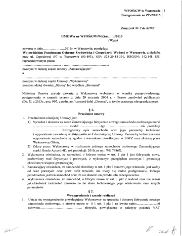 WFOŚiGW w Warszawie 1 Postępowanie nr ZP-2/2015 Załqcznik Nr 7 do SIWZ UMOWA nr WFOŚiGW/WKiA/ /2015 (Wzór) 2015r. w Warszawie, pomiędzy: zawarta w dniu Wojewódzkim Funduszem Ochrony Środowiska i Gospodarki Wodnej w Warszawie, z siedzibą przy ul. Ogrodowej 5/7 w Warszawie (00-893), NIP: 525-20-88-391, REGON: 142 148 155, reprezentowanym przez: ..- •• zwanym w dalszej części umowy „Zamawiającym" a zwanym w dalszej części Umowy „Wykonawcą" zwanymi dalej również „Stroną" lub wspólnie „Stronami" Niniejsza Umowa zostaje zawarta z Wykonawcą wybranym w wyniku przeprowadzonego postępowania w ramach ustawy z dnia 29 stycznia 2004 r. - Prawo zamówień publicznych (Dz. U. z 2013r., poz. 907, z późn. zm.) zwanej dalej „Ustawą", w trybie przetargu nieograniczonego. § 1. Przedmiot umowy 1. Przedmiotem niniejszej Umowy jest: 1) Sprzedaż i dostawa na rzecz Zamawiającego fabrycznie nowego samochodu osobowego marki model rok produkcji 'ŁYP Szczegółowy opis samochodu oraz jego parametry techniczne i wyposażenie zawarte są w Zalaczniku nr 1 do niniejszej Umowy. Parametry techniczne oraz wyposażenie samochodu są zgodne z warunkami określonymi w SIWZ oraz złożoną przez Wykonawcę Ofertą; 2) Zakup przez Wykonawcę w rozliczeniu jednego samochodu osobowego Zamawiającego marki Honda Accord 4D, rok produkcji: 2010, nr rej.: WE 7486X. 2. Wykonawca oświadcza, że samochód, o którym mowa w ust. 1 pkt 1 jest fabrycznie nowy, pozbawiony wad fizycznych i prawnych, z wykonanym przeglądem zerowym i gwarancją określoną w książce gwarancyjnej. 3. Zamawiający oświadcza, że samochód określony w ust. 1 pkt 2 stanowi jego własność, jest wolny od wad prawnych oraz praw osób trzecich, nie toczy się żadne postępowanie, którego przedmiotem jest ten samochód oraz, że nie stanowi on przedmiotu zabezpieczenia. 4. Wykonawca oświadcza, że samochód, o którym mowa w ust. 1 pkt 2 widział oraz nie wnosi jakichkolwiek zastrzeżeń zarówno co do stanu technicznego, jego właściwości oraz innych parametrów. § 2. Wynagrodzenie i zasady rozliczeń 1. Ustala się wynagrodzenie przyslugujące Wykonawcy za sprzedaż i dostawę fabrycznie nowego samochodu osobowego, o którym mowa w § 1 ust. 1 pkt 1 na kwotę netto. zł złotych), powiększoną o należyty podatek VAT (słownie WFOŚiGW w Warszawie 2 Postępowanie nr ZP-2/2015 zł w wysokości ....%, co daje łączną wartość samochodu w kwocie brutto (słownie. 2. Ustala się wynagrodzenie przysługujące Zamawiającemu za sprzedaż Wykonawcy w rozliczeniu jednego samochodu osobowego użytkowanego przez Zamawiającego, o którym mowa w § 1 zł (słownie: złotych), ust. 1 pkt 2 na kwotę netto. co daje łączną wartość samochodu powiększoną o należyty podatek VAT w wysokości złotych). zł (słownie. w kwocie brutto 3. Zamawiający zobowiązuje się zapłacić Wykonawcy wynagrodzenie, o którym mowa w ust. 1 w terminie 14 dni od daty doręczenia prawidłowo wystawionej faktury na wskazany przez Wykonawcę rachunek bankowy. 4. Wykonawca zobowiązuje się zapłacić Zamawiającemu wynagrodzenie, o którym mowa w ust. 2 w terminie 14 dni od daty doręczenia prawidłowo wystawionej faktury na wskazany przez Zamawiającego rachunek bankowy. 5. Podstawę wystawienia faktur, o których mowa powyżej stanowią: podpisany przez Strony bez zastrzeżeń protokół odbioru jakościowego samochodu, o którym mowa w § 1 ust. 1 pkt loraz protokół zdawczo-odbiorczego samochodu, o którym mowa w § 1 ust. 1 pkt 2, stanowiących odpowiednio załączniki nr 3 i 4 do niniejszej Umowy. 6. Za dzień zapłaty przyjmuje się datę obciążenia rachunku bankowego Zamawiającego i Wykonawcy na podstawie faktur. § 3. Termin wykonania Realizacja przedmiotu umowy nastąpi w terminie 7 dni od dnia podpisania niniejszej Umowy. § 4. Odbiór 1. Odbiór jakościowy samochodu osobowego, o którym mowa w § 1 ust. 1 pkt 1 niniejszej Umowy odbędzie się w siedzibie Wykonawcy przy ul. w dniach i godzinach pracy Zamawiającego. w 2. Odbiór jakościowy samochodu osobowego, o którym mowa w § 1 ust. 1 pkt 1 obejmuje: 1) sprawdzenie zgodności parametrów samochodu ze Specyfikacją Istotnych Warunków Zamówienia i ofertą złożoną przez Wykonawcę w postępowaniu; 2) sprawdzenie kompletności wyposażenia i funkcjonowania zainstalowanych urządzeń; 3) sprawdzenie dokumentacji technicznej (m.in. karta pojazdu, wyciąg ze świadectwa homologacji, książka gwarancyjna); 4) przeprowadzenie jazdy próbnej. 3. Podczas odbioru jakościowego Wykonawca przekaże Zamawiającemu wymagane prawem dokumenty samochodu niezbędne do zarejestrowania i ubezpieczenia samochodu. 4. Dostarczenie samochodu, o którym mowa w § 1 ust. 1 pkt 1 do siedziby Zamawiającego, bezpośrednio po dokonaniu czynności rejestracyjnych i ubezpieczeniowych, odbędzie się na koszt i odpowiedzialność Wykonawcy. 5. W dniu dostawy samochodu, o którym mowa w § 1 ust. 1 pkt 1 zostanie ponownie sprawdzona zgodność parametrów samochodu ze Specyfikacją Istotnych Warunków Zamówienia oraz dokumentacja techniczna samochodu, co zostanie potwierdzone adnotacją na protokole odbioru jakościowego podpisanym przez obie Strony. 6. W sytuacji stwierdzonych wad, braków czy nieprawidłowości Zamawiający zamieści w protokole adnotację o zastrzeżeniach wraz z wyznaczonym terminem na ich usunięcie. Usunięcie wad, WFOŚiGW w Warszawie 3 Postępowanie nr ZP-2/2015 braków czy nieprawidłowości Strony potwierdzą adnotacją potwierdzającą odbiór bez zastrzeżeń na protokole. Wraz z dostarczeniem samochodu okreś lonego w § 1 ust. 1 pkt 1 Wykonawca przekaże 7. Zamawiającemu wszelkie rzeczy służące do korzystania z samochodu oraz dokumenty związane z samochodem i wymagane obowiązującymi przepisami prawa, w szczególności komplet kluczyków, instrukcję obsługi i konserwacji oraz książkę gwarancyjną w języku polskim. 8. Odbiór samochodu określonego w 