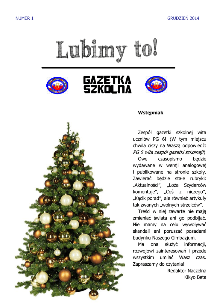 NUMER 1 GRUDZIEŃ 2014 Wstępniak Zespół gazetki szkolnej wita uczniów PG 6! (W tym miejscu chwila ciszy na Waszą odpowiedź: PG 6 wita zespół gazetki szkolnej!) Owe czasopismo będzie wydawane w wersji analogowej i publikowane na stronie szkoły. Zawierać będzie stałe rubryki: „Aktualności”, „Loża Szyderców komentuje”, „Coś z niczego”, „Kącik porad”, ale również artykuły tak zwanych „wolnych strzelców”. Treści w niej zawarte nie mają zmieniać świata ani go podbijać. Nie mamy na celu wywoływać skandali ani poruszać posadami budynku Naszego Gimbazjum. Ma ona służyć informacji, rozwojowi zainteresowań i przede wszystkim umilać Wasz czas. Zapraszamy do czytania! Redaktor Naczelna Kikyo Beta 1. 2. 3. 4. Aktualności........................................strona 3 Nasza twórczość..............................strona 4 Loża Szyderców komentuje.........strona 6 Kącik kulinarny.................................strona 7 Lek na zimowe dni Naleśniki Świąteczne pierniczki 5. Poradnik młodzieżowy.................strona 10 6. Jak zrobić coś z niczego?............strona 11 7. Kącik porad.....................................strona 12 8. Polecamy.........................................strona 13 9. Humorek..........................................strona 14 10. Porady Sami.................................strona 15 11. Tradycje........................................strona 16 12. Kącik wierszowany.....................strona 17 13. Coś dla zdrowia...........................strona 18 Publiczne Gimnazjum nr 6 z Oddziałami Dwujęzycznymi im. Seweryna Nowakowskiego w Białymstoku p. Agata Wróbel OPIEKUN REDAKTOR NACZELNY Iga Mantur NADZÓR KOMPUTEROWY Karolina Filipiuk ZESPÓŁ REDAKCYJNY KATARZYNA OŻAROWSKA OLGA GRYSZÓWKA KLAUDIA TARASIUK DOMINIKA TARASIUK DOMINIKA RACZKOWSKA DOMINIKA SAWICKA EWELINA MICHAŁOWSKA MARIA MOJSAK EWA WIŚNIEWSKA GABRIEL ŁUPIŃSKI [email protected] ul. Komisji Edukacji Narodowej 1 15–001 Białystok GRUDZIEŃ 2014 3 AKTUALNOŚCI Załóż czapkę Mikołaja – uniknij odpowiedzi! 8 grudnia osoba, która założyła jakiś świąteczny ciuszek nie musiała się przejmować niespodziewanym pytaniem. Konkurs kolęd w naszej szkole – emocji co nie miara! 6 grudnia zaśpiewali u nas uczniowie różnych szkół, walczyli o zwycięstwo jak mało kto! Uczniowie PG6 brali udział w prowadzonym przez Annę Lewandowską finale konkursu „Stop zwolnieniom z w-f”. Nasze gwiazdy można było zobaczyć w TVN, TVP i na Polsacie! Nasi sportowcy mogli się cieszyć grą na swojej sali gimnastycznej. Odbywało się u nas ostatnio wiele meczy! 3 Czy zwykły kolega bądź koleżanka ze szkoły zasługuje na miano przyjaciela? Zależy to od osoby. Z mojego punktu widzenia ufać byle komu to błąd, chyba, że lubi się słuchać plotek na swój temat. Osobiście nie lubię plotek, jednak nie przejmuję się opinią innych na mój temat. Więc pytanie: czy ja w ogóle mam przyjaciół? Owszem mam. Może nie jest ich milion, ale wolę mieć jednego prawdziwego przyjaciela niż wielu fałszywych. A co znaczy dla mnie „prawdziwy przyjaciel”? Prawdziwy przyjaciel... jest to dla mnie osoba, której ufam bez granic i nie muszę martwić się, że to co powiem jej, usłyszy jeszcze tuzin osób, ktoś, z kim mogę śmiać się, jak i płakać, z kim mogę bawić się na całego, osoba, dzięki której mogę osiągnąć wszystko. Przyjaciel jest naszym aniołem stróżem. Dlaczego? Mimo choroby lub braku czasu stara się być przy nas, gdy cierpimy, stara się podnosić nas na duchu, wspiera nas, jest gotów zrobić dla nas wszystko nie oczekując nic w zamian. Bardzo chce być z nami, chronić nas. Jednak często nie doceniamy starań drugiej osoby i zarzucamy jej, że robi to, aby się wzbogacić, ewentualnie by zdobyć popularność. Przyjaciel to ktoś więcej niż tylko kolega albo koleżanka. Przyjaciel staje się częścią naszej rodziny, a nawet częścią nas samych. Wie o nas wszystko. Zna nasze lęki. Zna nasze powody do smutku i radości. Jesteśmy całkiem różni i jednocześnie całkiem podobni. Jedynie przyjaciel całkowicie zrozumie Twoje cierpienia. Czemu? On cierpi razem z Tobą. Zaczyna się od nienawiści, a kończy na bólu z tęsknoty. Stracić przyjaciela to stracić sens życia. Przyjaciel jest jak powiew wiatru... nie zawsze go czujesz, ale tak naprawdę zawsze jest przy Tobie. Przyjacielu, gdzie się chowasz? 4 NA 5 Za oknami zima. Wydawać by się mogło, że gorzej już być nie może... bo przecież na drogach będzie ślisko, dojazdy zajmą nam wiele więcej czasu – to moglibyśmy usłyszeć od każdego kierowcy. Osoby czekające na przystankach traktują przyjazd autobusu jak wygraną w totka. Takich przykładów można podawać jeszcze wiele. Z tego wynikałoby, że zima jest najmniej lubianą porą roku, ale czy na pewno dla wszystkich? Oczywiście, że nie. Zapomnieliśmy o dzieciach, które tylko czekają aż spadnie pierwszy śnieg i będą mogły ulepić bałwana, albo namówić rodziców na sanki. To właśnie one dają nam z zimy tyle radości, której często nam brakuje. Chociaż teraz już coraz mniej dzieci widzę na dworze i wydawać by się mogło, że to dlatego, że nie lubią zimy. Sądzę jednak, że chodzi o coś innego, mianowicie: komputery, konsole, czy chociażby telewizję. To wszystko stało się dla nas ważniejsze, ciekawsze, a nawet dla niektórych niezbędne. Nie da się teraz wyobrazić sobie życia bez Internetu w telefonie, którego używamy przecież bez przerwy. To pochłania cały nasz czas, a tym samym radość z zimy. Wielu z nas stwierdzi, że zimą nie ma co robić, okazuje się to jednak nieprawdą, bo przecież wbrew pozorom jest wiele ciekawych zajęć, na które możemy sobie pozwolić tylko zimą. Oprócz zjeżdżania na sankach, lepienia bałwana, jest lodowisko, gdzie można spędzić wspaniałe chwile z przyjaciółmi, a nawet spacer będzie inny niż w p