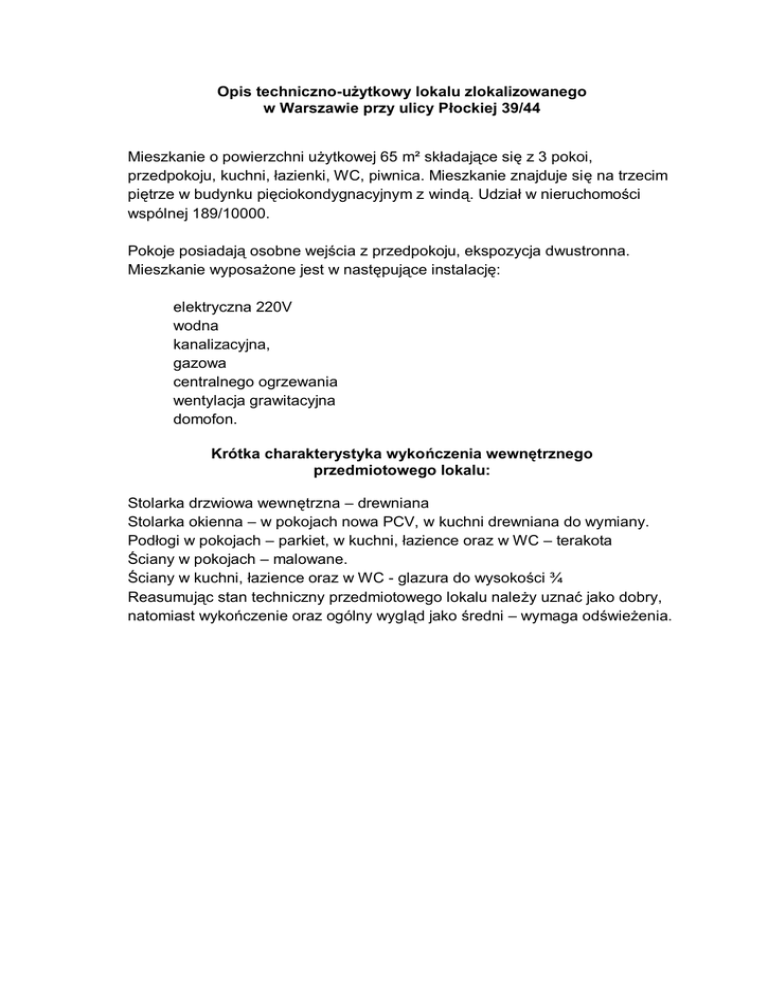 Opis techniczno-użytkowy lokalu zlokalizowanego w Warszawie przy ulicy Płockiej 39/44 Mieszkanie o powierzchni użytkowej 65 m² składające się z 3 pokoi, przedpokoju, kuchni, łazienki, WC, piwnica. Mieszkanie znajduje się na trzecim piętrze w budynku pięciokondygnacyjnym z windą. Udział w nieruchomości wspólnej 189/10000. Pokoje posiadają osobne wejścia z przedpokoju, ekspozycja dwustronna. Mieszkanie wyposażone jest w następujące instalację: elektryczna 220V wodna kanalizacyjna, gazowa centralnego ogrzewania wentylacja grawitacyjna domofon. Krótka charakterystyka wykończenia wewnętrznego przedmiotowego lokalu: Stolarka drzwiowa wewnętrzna – drewniana Stolarka okienna – w pokojach nowa PCV, w kuchni drewniana do wymiany. Podłogi w pokojach – parkiet, w kuchni, łazience oraz w WC – terakota Ściany w pokojach – malowane. Ściany w kuchni, łazience oraz w WC - glazura do wysokości ¾ Reasumując stan techniczny przedmiotowego lokalu należy uznać jako dobry, natomiast wykończenie oraz ogólny wygląd jako średni – wymaga odświeżenia.