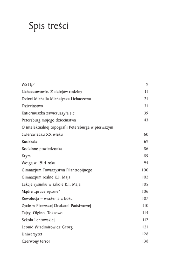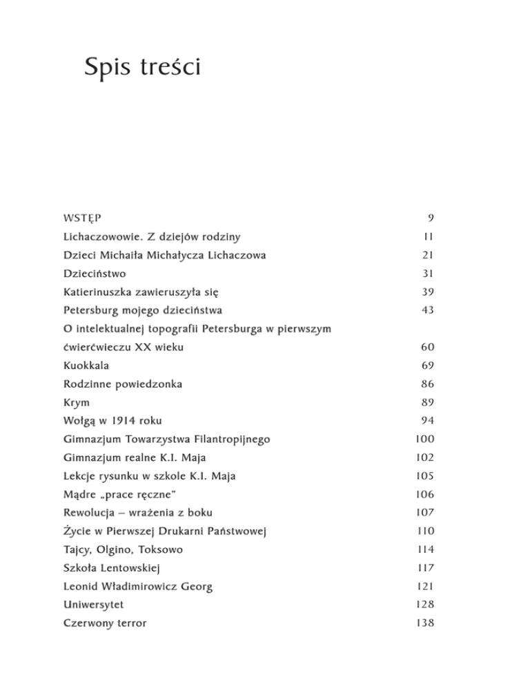 Spis treści Wstęp9 Lichaczowowie. Z dziejów rodziny11 Dzieci Michaiła Michałycza Lichaczowa21 Dzieciństwo31 Katierinuszka zawieruszyła się39 Petersburg mojego dzieciństwa43 O intelektualnej topografii Petersburga w pierwszym ćwierćwieczu XX wieku60 Kuokkala69 Rodzinne powiedzonka86 Krym89 Wołgą w 1914 roku94 Gimnazjum Towarzystwa Filantropijnego100 Gimnazjum realne K.I. Maja102 Lekcje rysunku w szkole K.I. Maja105 Mądre „prace ręczne”106 Rewolucja – wrażenia z boku107 Życie w Pierwszej Drukarni Państwowej110 Tajcy, Olgino, Toksowo114 Szkoła Lentowskiej117 Leonid Władimirowicz Georg121 Uniwersytet128 Czerwony terror138 Kształtowanie światopoglądu143 Siergiej Aleksiejew-Askoldow151 Chielfiernak155 Bractwo św. Sierafima Sarowskiego159 Kosmiczna Akademia Nauk164 Aresztowanie i więzienie169 Kiempierpunkt i przeprawa na wyspę Sołowki175 Łagrowa topografia Sołowek186 Przyroda Sołowek200 Wspomnienia Gabinet Kryminologiczny205 6 Przekątna dziecięcej kołdry212 Przyjazd Maksyma Gorkiego i masowe egzekucje 1929 roku214 Muzeum sołowieckie233 Teatr sołowiecki246 Ludzie Sołowek255 Aleksandr Aleksandrowicz Meyer 255 Julia Nikołajewna Danzas 268 Gawriił Osipowicz Gordon 273 Pawieł Fomicz Smotricki 276 Władimir Siergiejewicz Razdolski 278 Władimir Kiemiecki (Swiesznikow) 279 Aleksandr Arturowicz Pieszkowski 303 Aleksandr Aleksandrowicz Biedriaga 305 Michaił Iwanowicz Chaczaturow 309 Łada Mogilanska 312 Aleksandr Pietrowicz Suchow 312 Jurij Aleksiejewicz Kazarnowski 315 Duchowieństwo 316 Nikołaj Nikołajewicz Gorski 323 Gieorgij Michajłowicz Osorgin 324 Aleksandr Jeleazarowicz Makiedonski 326 Eduard Karłowicz Rozenberg 327 Bardygin 330 Władimir Juljanowicz Korolenko 331 Kilka wyrywkowych wspomnień 334 Wyjazd z Sołowek 337 Zwanka i Tichwin. Wyjście na wolność 345 Losy przyjaciół po Sołowkach 353 Represje lat 30. 360 Wydawnictwo Akademii Nauk ZSRR 366 Próby pisarskie 369 Zatarcie skazania 373 Oblanie egzaminów 377 Odejście z Wydawnictwa Akademii Nauk 381 Nowogród 385 Blokada 392 Dwa listy o blokadzie Leningradu 462 List pierwszy 462 List drugi 465 „Obróbka” za „obróbką” 468 Aleksandr Siergiejewicz Orłow i Warwara Pawłowna Adrianowa-Pierietc484 Nikołaj Nikołajewicz Woronin501 Podróż na Sołowki w 1966 roku504 Ostatni raz na Sołowkach511 Posłowie 512 Aneks * Notatki Sołowieckie 1928–1930513 Wykaz skrótów 533 Indeks osób 536