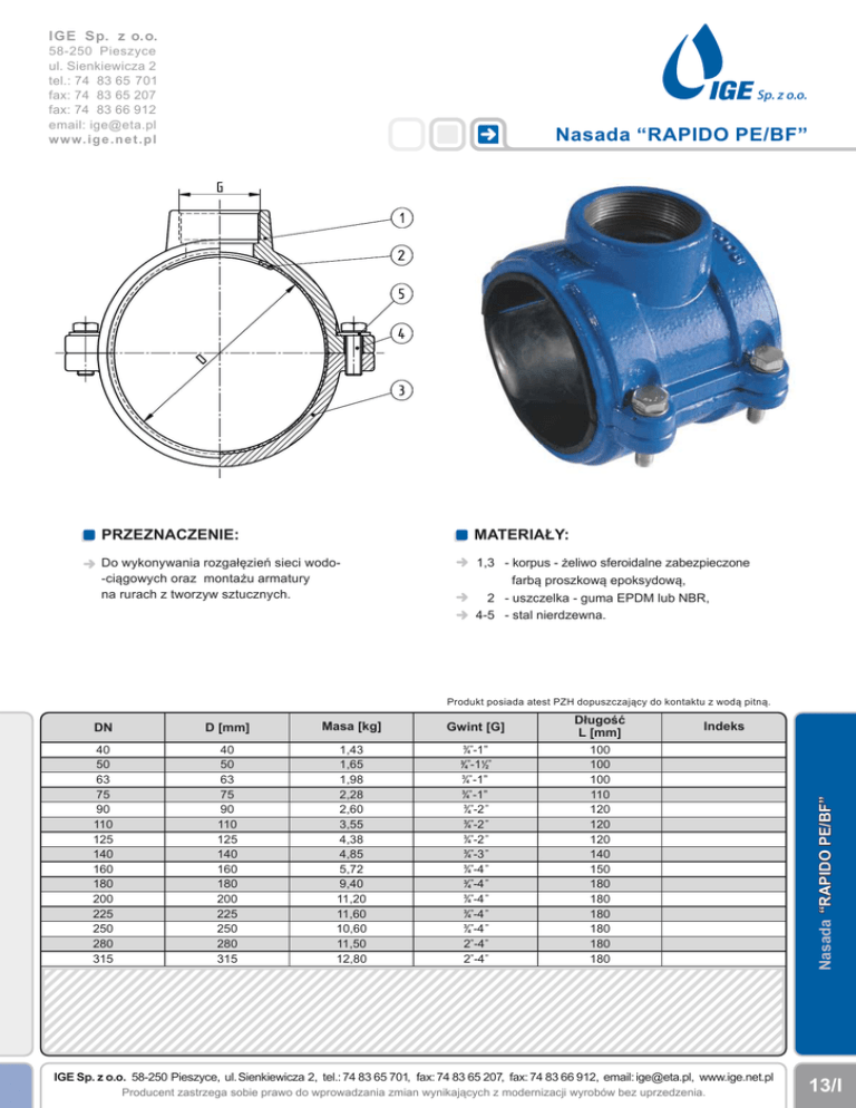 IGE Sp. z o.o. 58-250 Pieszyce ul. Sienkiewicza 2 tel.: 74 83 65 701 fax: 74 83 65 207 fax: 74 83 66 912 email: [email protected] w w w. i g e . n e t . pl Sp. z o.o. Nasada “RAPIDO PE/BF” PRZEZNACZENIE: MATERIAŁY: Do wykonywania rozgałęzień sieci wodo-ciągowych oraz montażu armatury na rurach z tworzyw sztucznych. 1,3 - korpus - żeliwo sferoidalne zabezpieczone farbą proszkową epoksydową, 2 - uszczelka - guma EPDM lub NBR, 4-5 - stal nierdzewna. Produkt posiada atest PZH dopuszczający do kontaktu z wodą pitną. Długość L [mm] Indeks 100 100 100 110 120 120 120 140 150 180 180 180 180 180 180 “ “ “ “ “ “ “ “ “ “ “ “ “ “ “ “ “ “ “ “ “ IGE Sp. z o.o. 58-250 Pieszyce, ul. Sienkiewicza 2, tel.: 74 83 65 701, fax: 74 83 65 207, fax: 74 83 66 912, email: [email protected], www.ige.net.pl Producent zastrzega sobie prawo do wprowadzania zmian wynikających z modernizacji wyrobów bez uprzedzenia. Nasada “RAPIDO PE/BF” /4 -1” /4 -11/2 3 /4 -1” 3 /4 -1” 3 /4 -2 3 /4 -2 3 /4 -2 3 /4 -3 3 /4 -4 3 /4 -4 3 /4 -4 3 /4 -4 3 /4 -4 2 -4 2 -4 3 3 “ 1,43 1,65 1,98 2,28 2,60 3,55 4,38 4,85 5,72 9,40 11,20 11,60 10,60 11,50 12,80 “ 40 50 63 75 90 110 125 140 160 180 200 225 250 280 315 “ 40 50 63 75 90 110 125 140 160 180 200 225 250 280 315 Gwint [G] “ Masa [kg] “ D [mm] “ DN 13/I