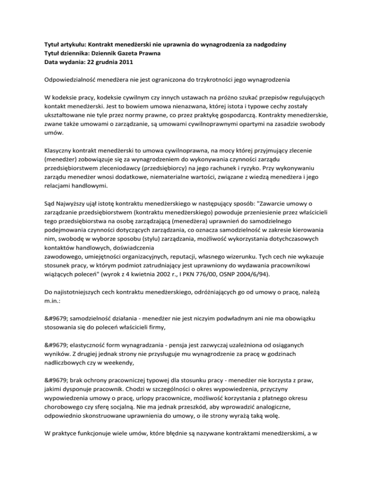 Tytuł artykułu: Kontrakt menedżerski nie uprawnia do